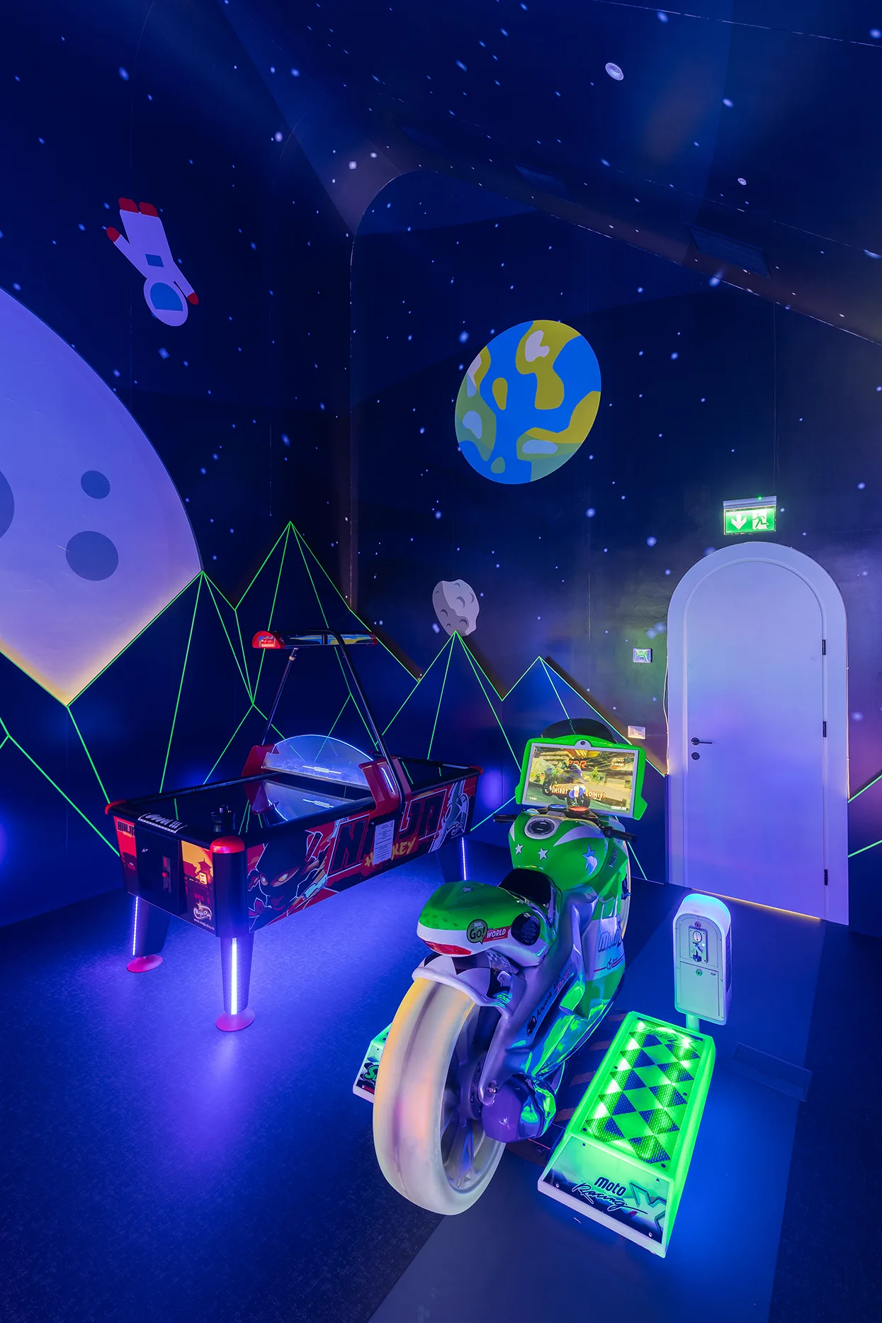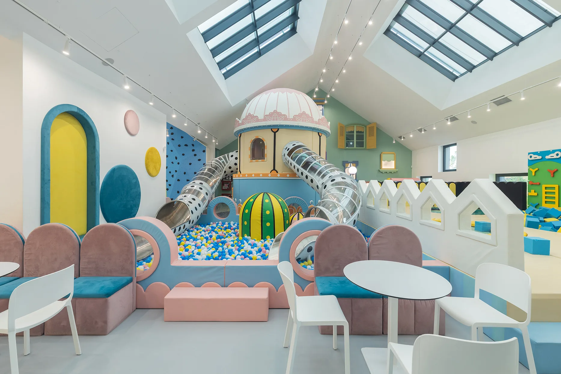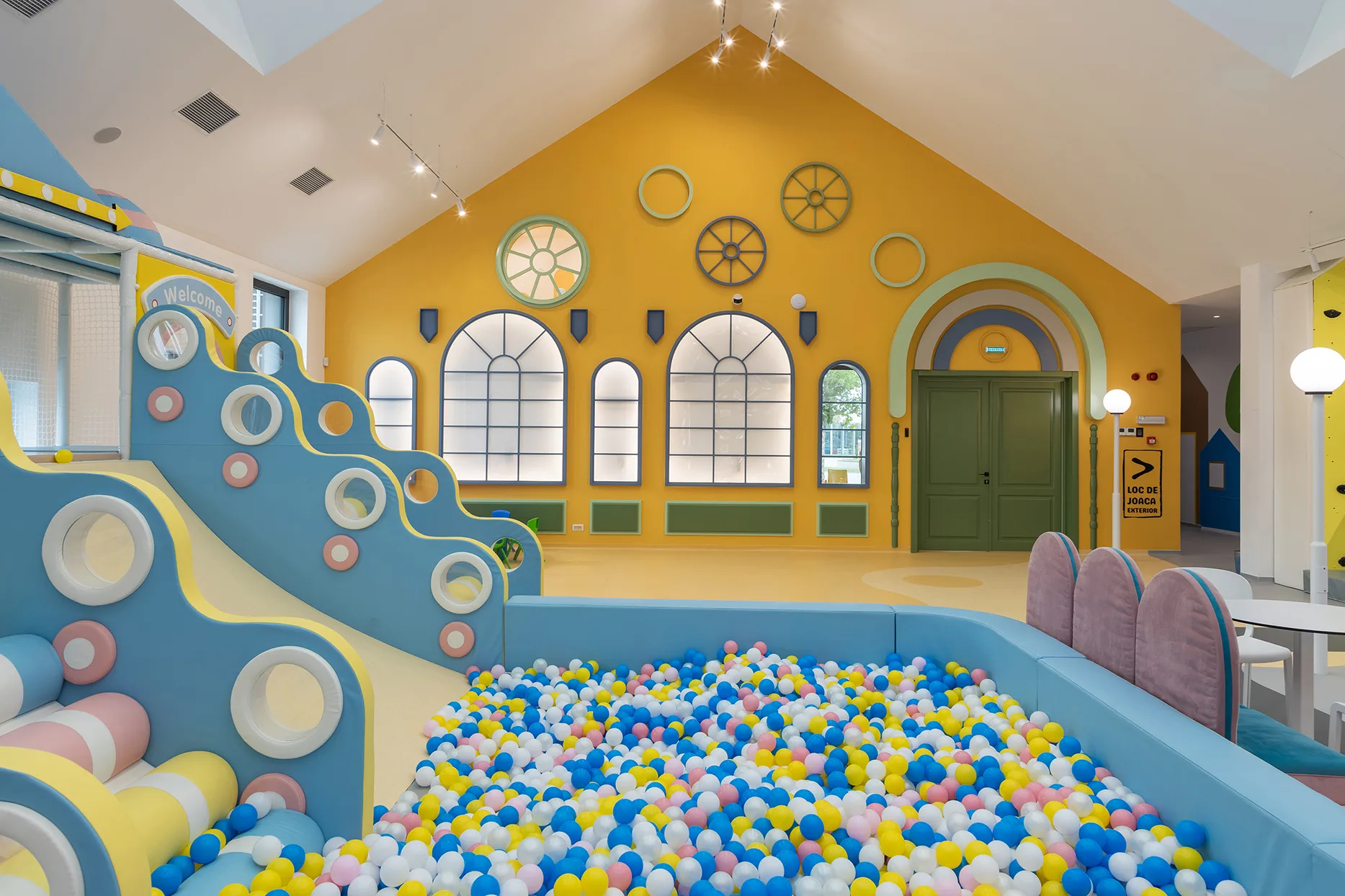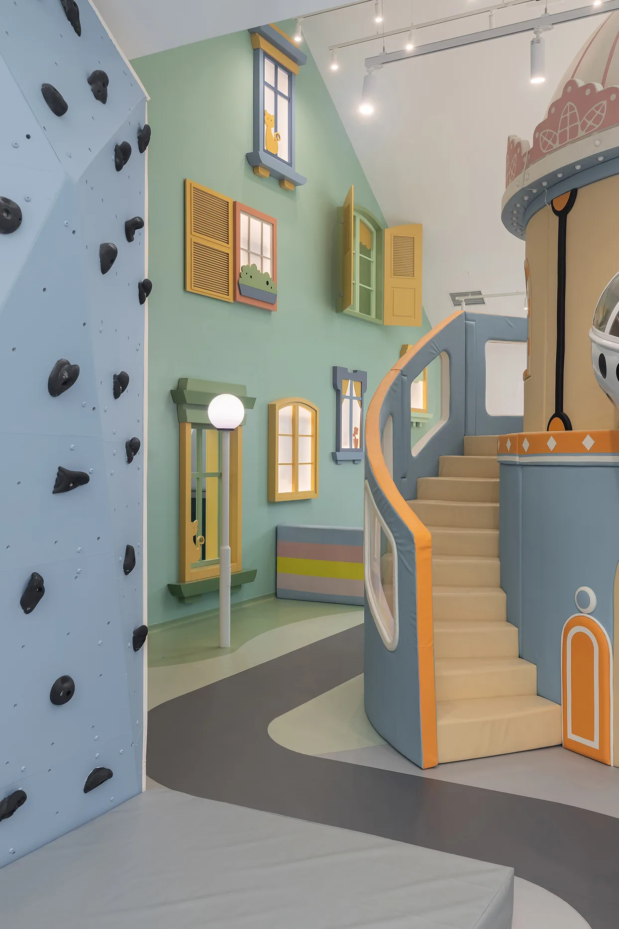 Paleta cromatică este definită de nuanțe pastelate, completate de texturi calde din lemn și terrazzo, creând o atmosferă luminoasă, primitoare și sigură. Fiecare căsuță este individualizată cromatic și beneficiază de o zonă de supantă, o „casă în casă” dedicată exclusiv copiilor. Spațiul interior este conectat direct cu o terasă acoperită și o grădină privată, extinzând experiența în aer liber.