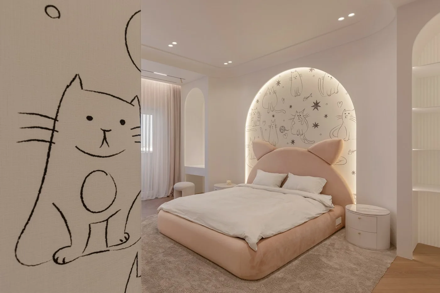 Dormitorul propune un univers intim și jucăuș, tratat cu aceeași atenție pentru detaliu, unde formele arcuite, iluminarea ambientală și elementele personalizate contribuie la crearea unei atmosfere relaxante. Baia continuă limbajul general al proiectului, prin texturi fine, proporții echilibrate și un dialog subtil între funcționalitate și estetică.
