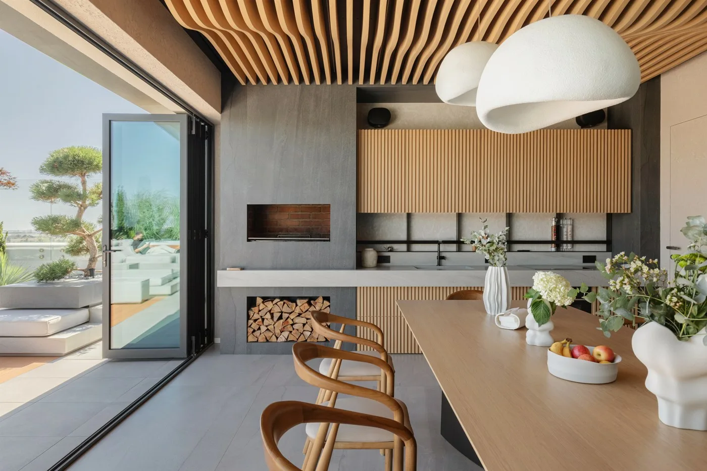 Zona de zi este concepută ca un open-space aerisit, în care livingul, diningul și bucătăria comunică prin continuitate vizuală și materială. Mobilierul cu forme organice, textilele moi și suprafețele mate sunt completate de accente metalice discrete și un sistem de iluminat stratificat, care pune în valoare arhitectura spațiului fără a o domina.