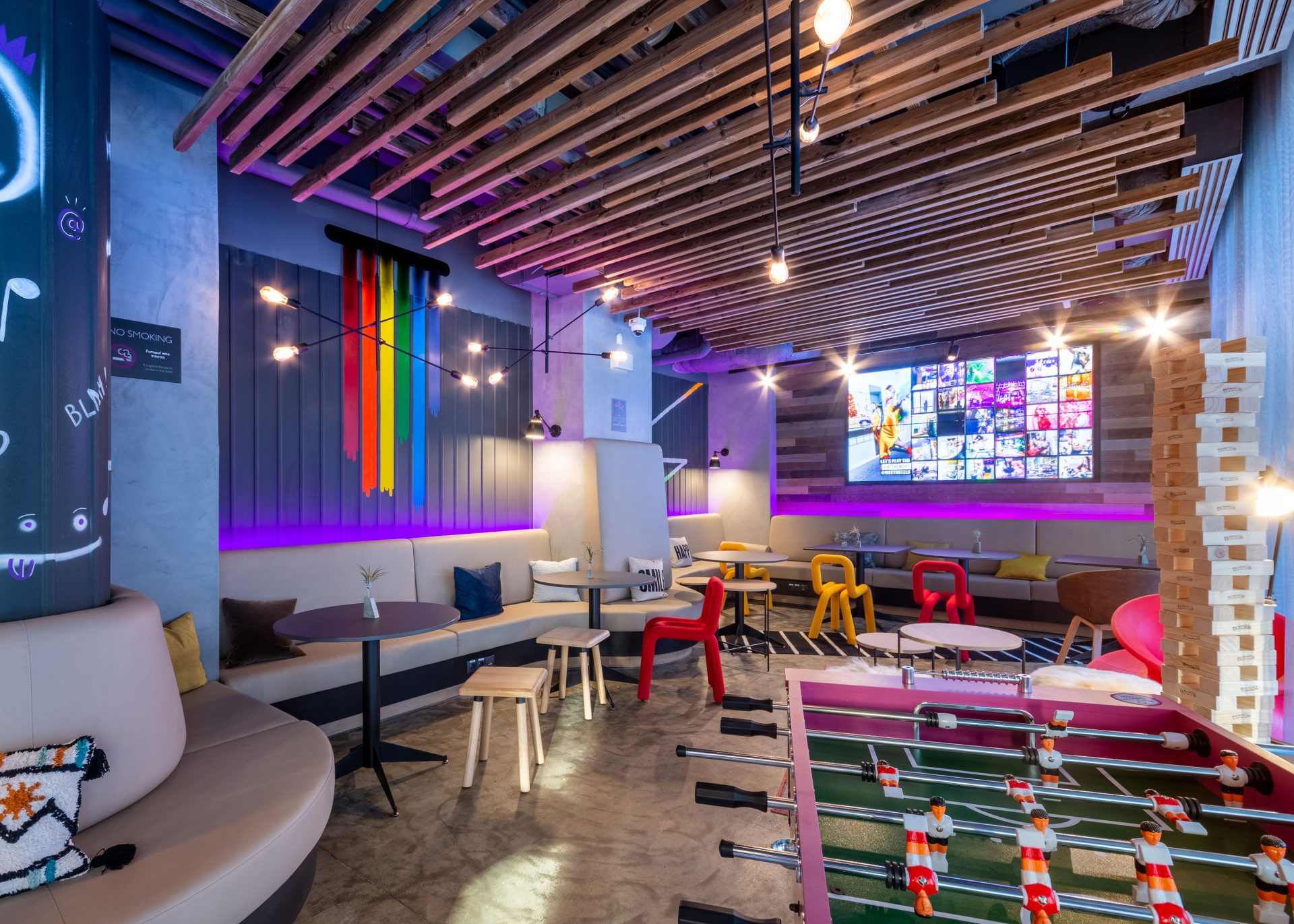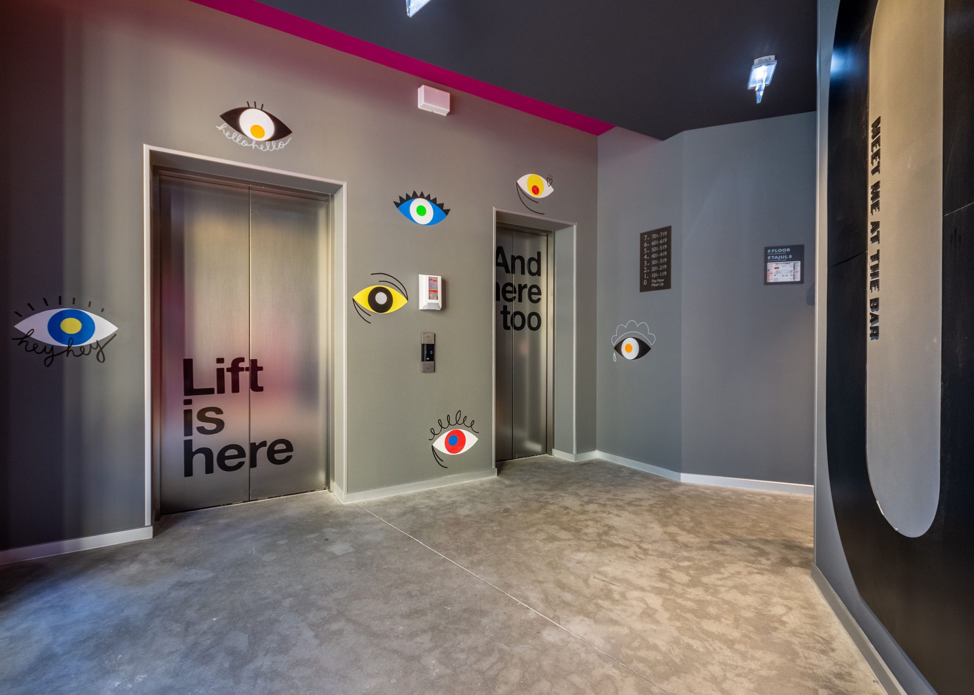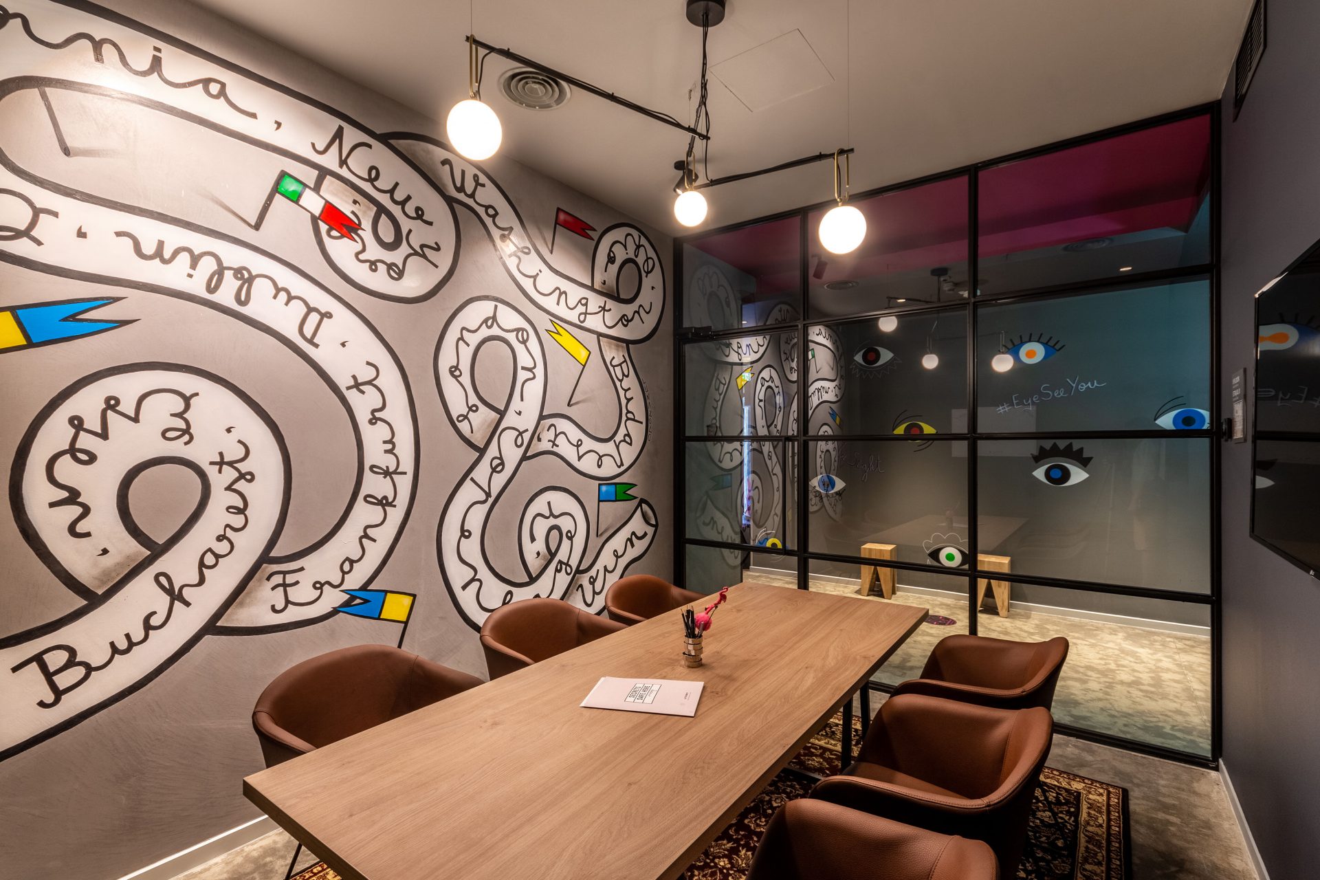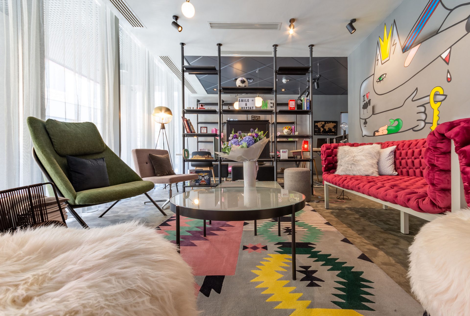 Spațiile publice au atmosfera unui living în care se îmbină fără limite ariile specifice unei zile: zona de primire, meeting, barul, zona de luat masa, cea destinată lucrului și cea deschisă distracției. Voia bună și creativitatea sunt instigate prin expresie vizulă puternică, artwork, muzică, ecrane media, mobilier jucăuș și lumini calde, toate îmbinate într-o unitate efervescentă.