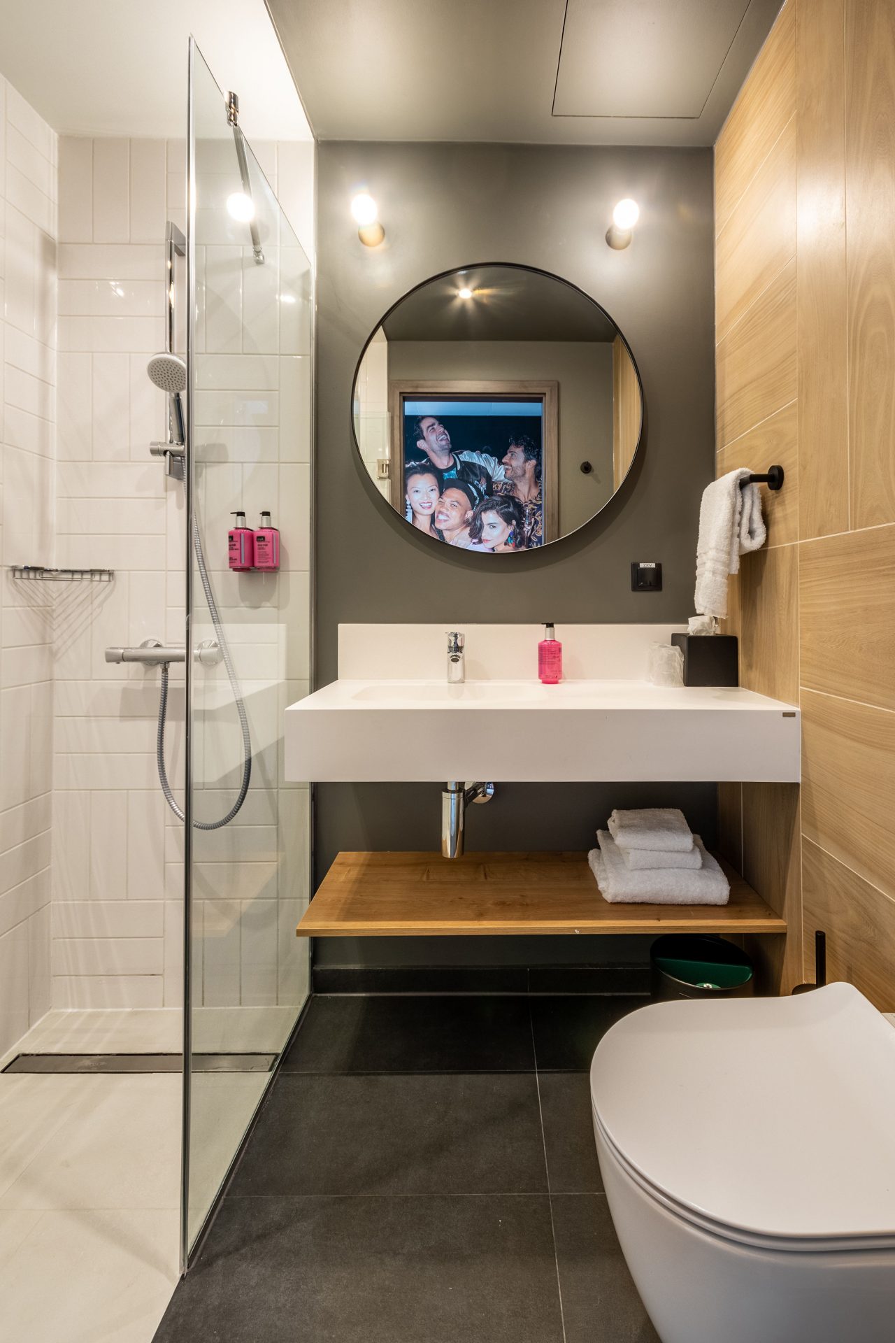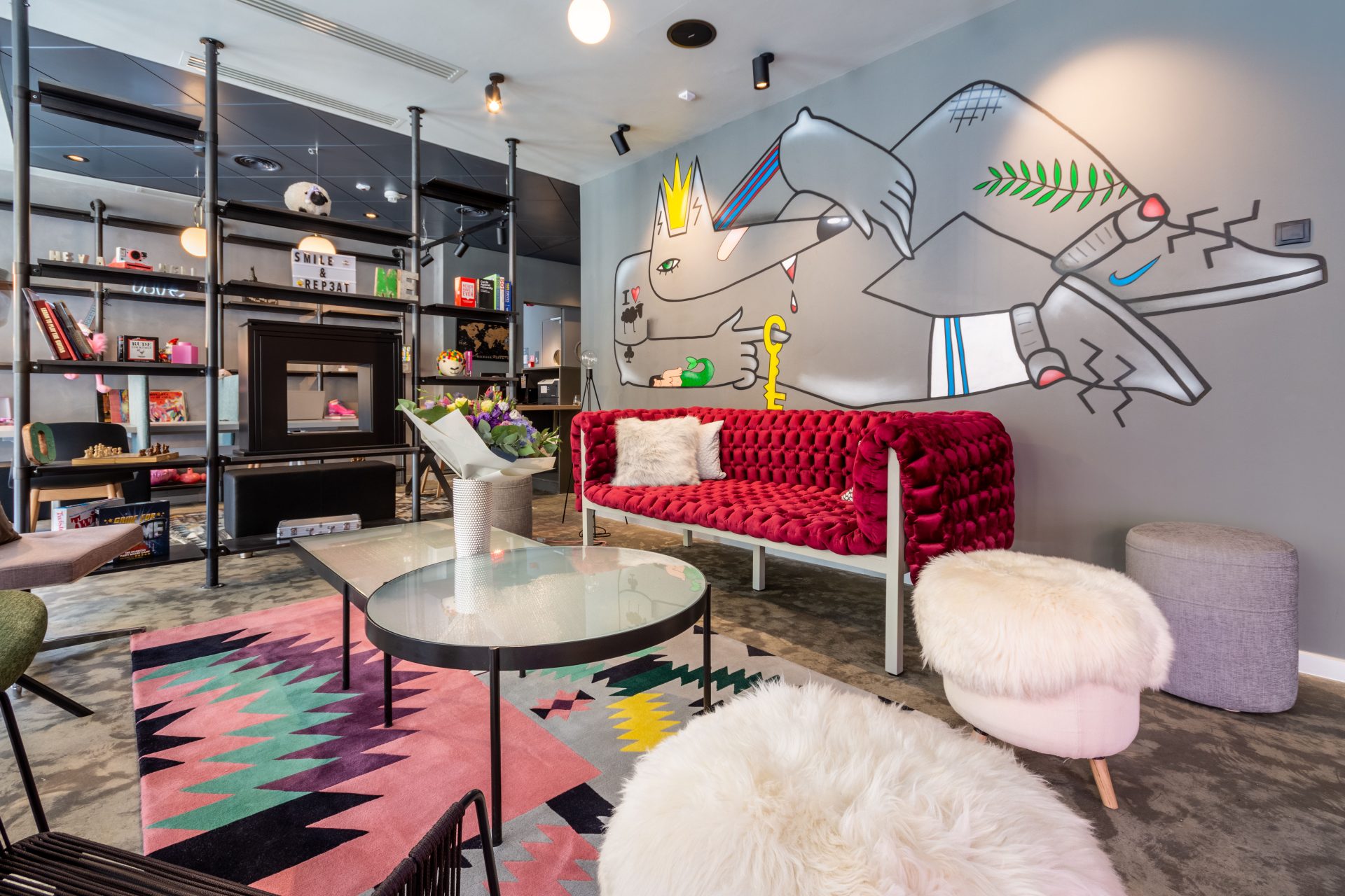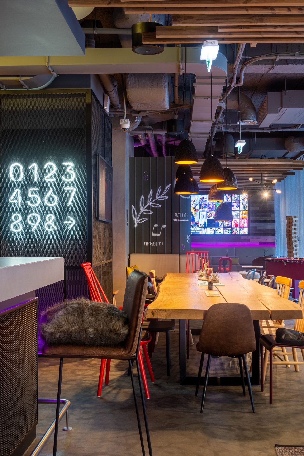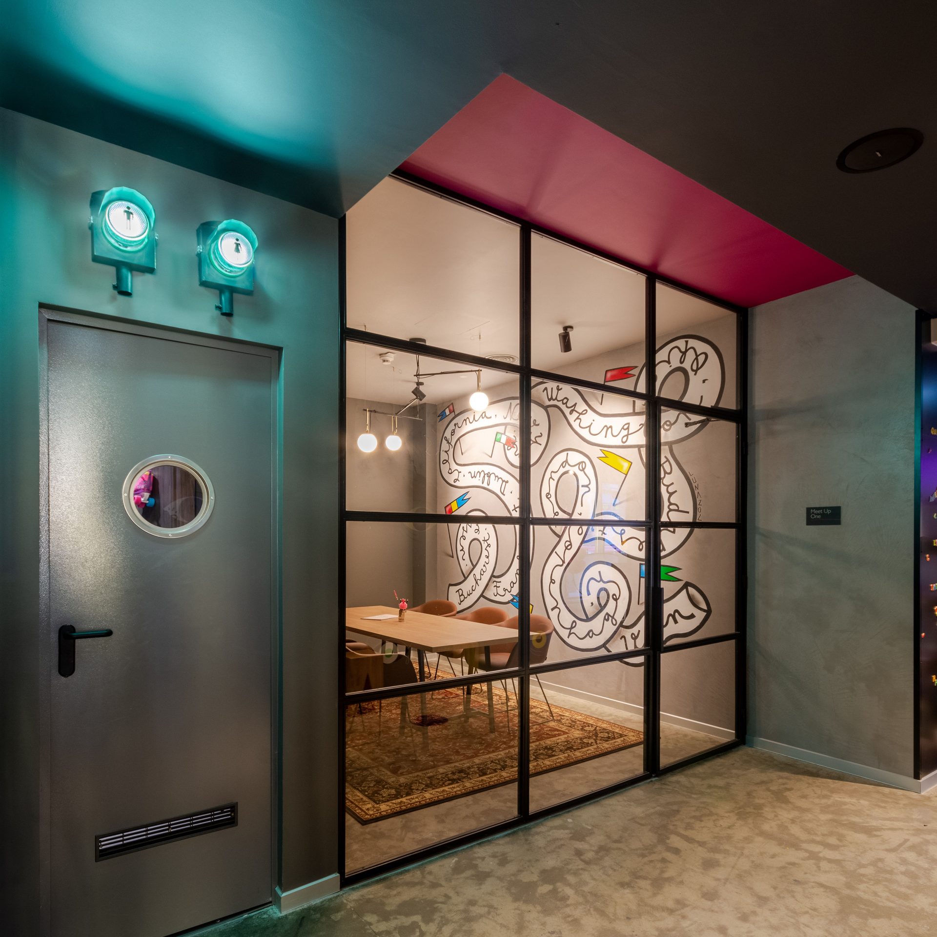 Spațiile publice au atmosfera unui living în care se îmbină fără limite ariile specifice unei zile: zona de primire, meeting, barul, zona de luat masa, cea destinată lucrului și cea deschisă distracției. Voia bună și creativitatea sunt instigate prin expresie vizulă puternică, artwork, muzică, ecrane media, mobilier jucăuș și lumini calde, toate îmbinate într-o unitate efervescentă.
