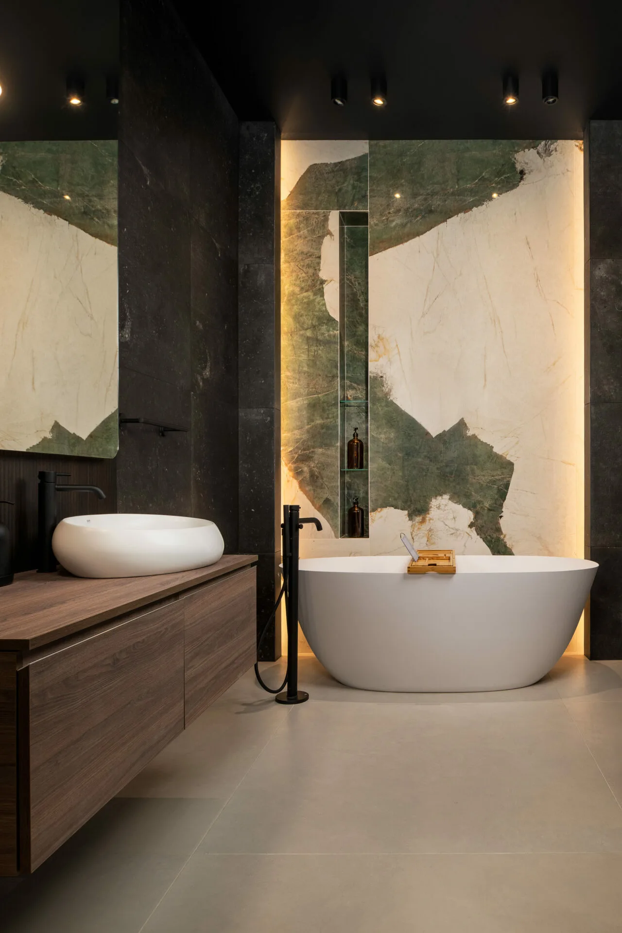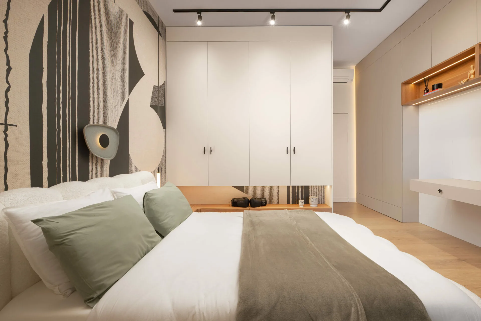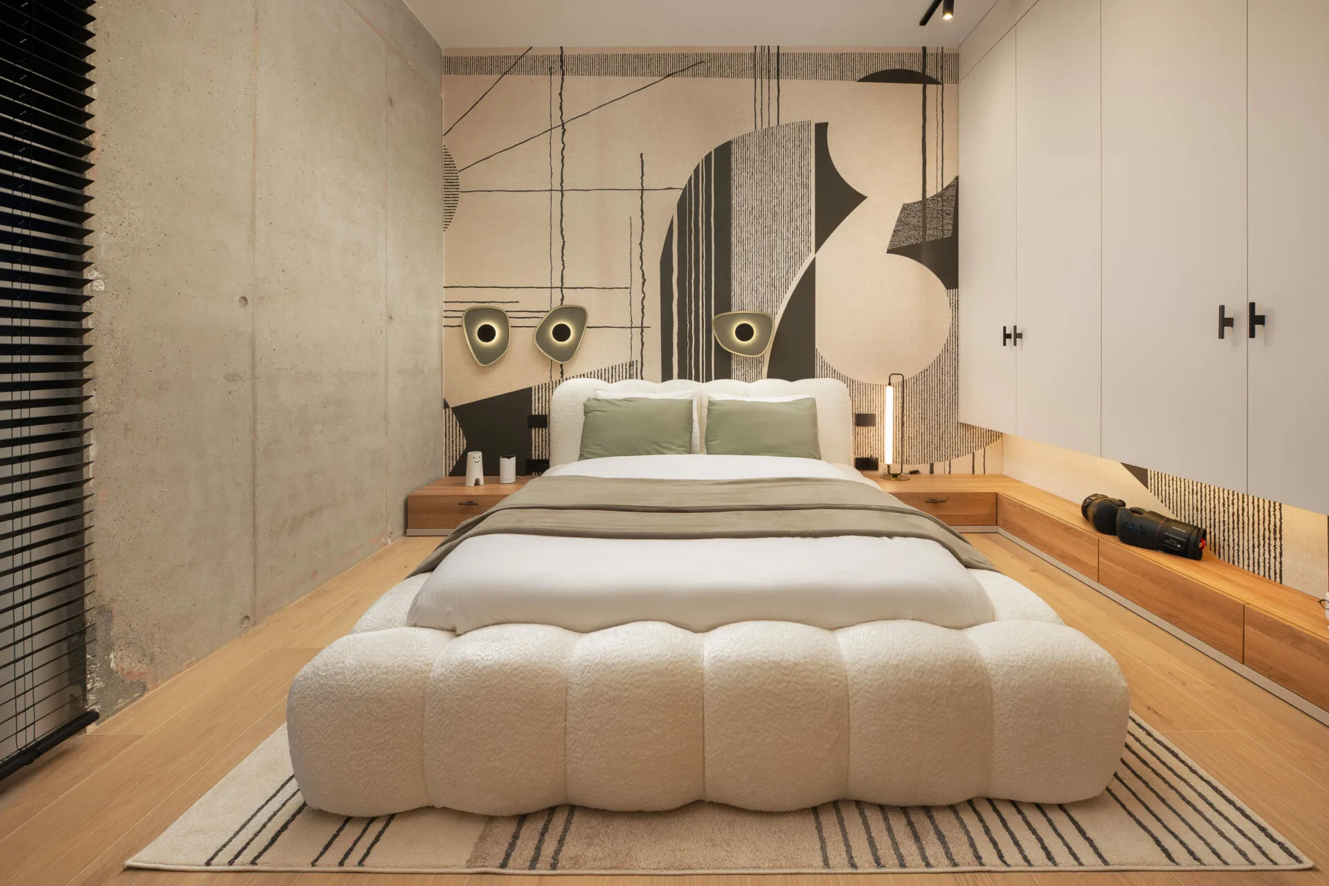 Betonul aparent și textilele tactile definesc un refugiu sobru, dar senzorial. Baia devine o declarație de design: plăci inspirate din natura, accente verzi, lumină caldă și forme fluide evocă un spa urban contemporan. Camera copiilor păstrează rigoarea estetică, dar introduce un spirit jucăuș și plin de viață, devenind o scenă pentru descoperire, unde fiecare detaliu servește atât funcțional, cât și emoțional.