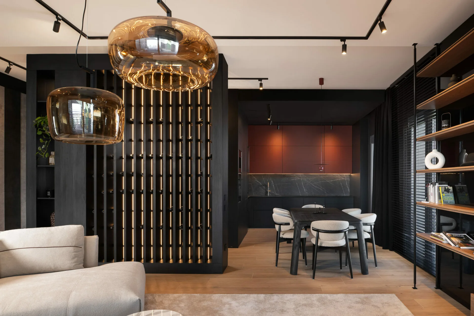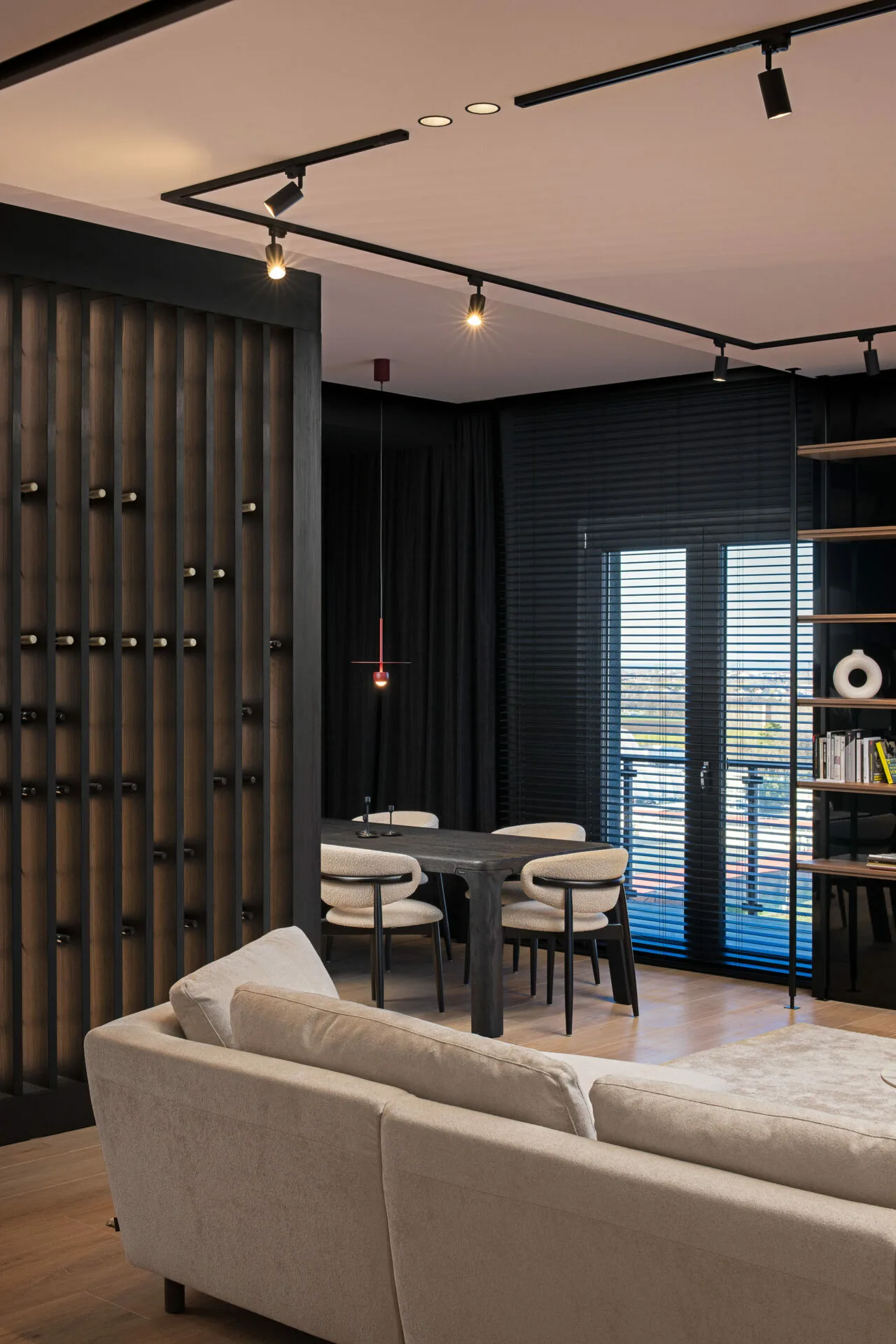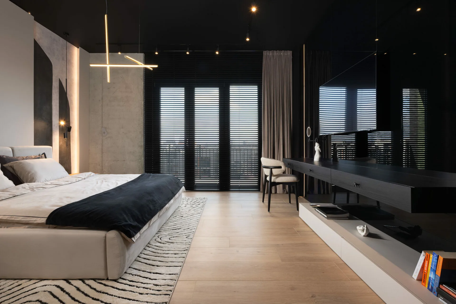 Fiecare detaliu, de la texturile ușilor la siluetele corpurilor de iluminat, se integrează într-un întreg coerent. Zona de zi se desfășoară ca o scenă deschisă, unde bucătăria, diningul și livingul își păstrează identitatea, menținând totodată o conexiune fluidă. Bucătăria, sculpturală și aproape monolitică, cu fronturi burgundy și un fundal sobru marmorat, capătă un efect cinematografic. Diningul ancorează spațiul prin masa și scaunele din lemn masiv, care echilibrează volumul și ergonomia. Livingul favorizează intimitatea prin măsuțe curbe, textile moi și iluminat ambiental ce definește zona fără a o închide. Dormitorul matrimonial creează un dialog între austeritatea brutalistă și rafinamentul contemporan. Volumele solide sunt îmblânzite de lumină liniară, iar paleta neutră, accentuată de negru și lemn cald, adaugă profunzime.