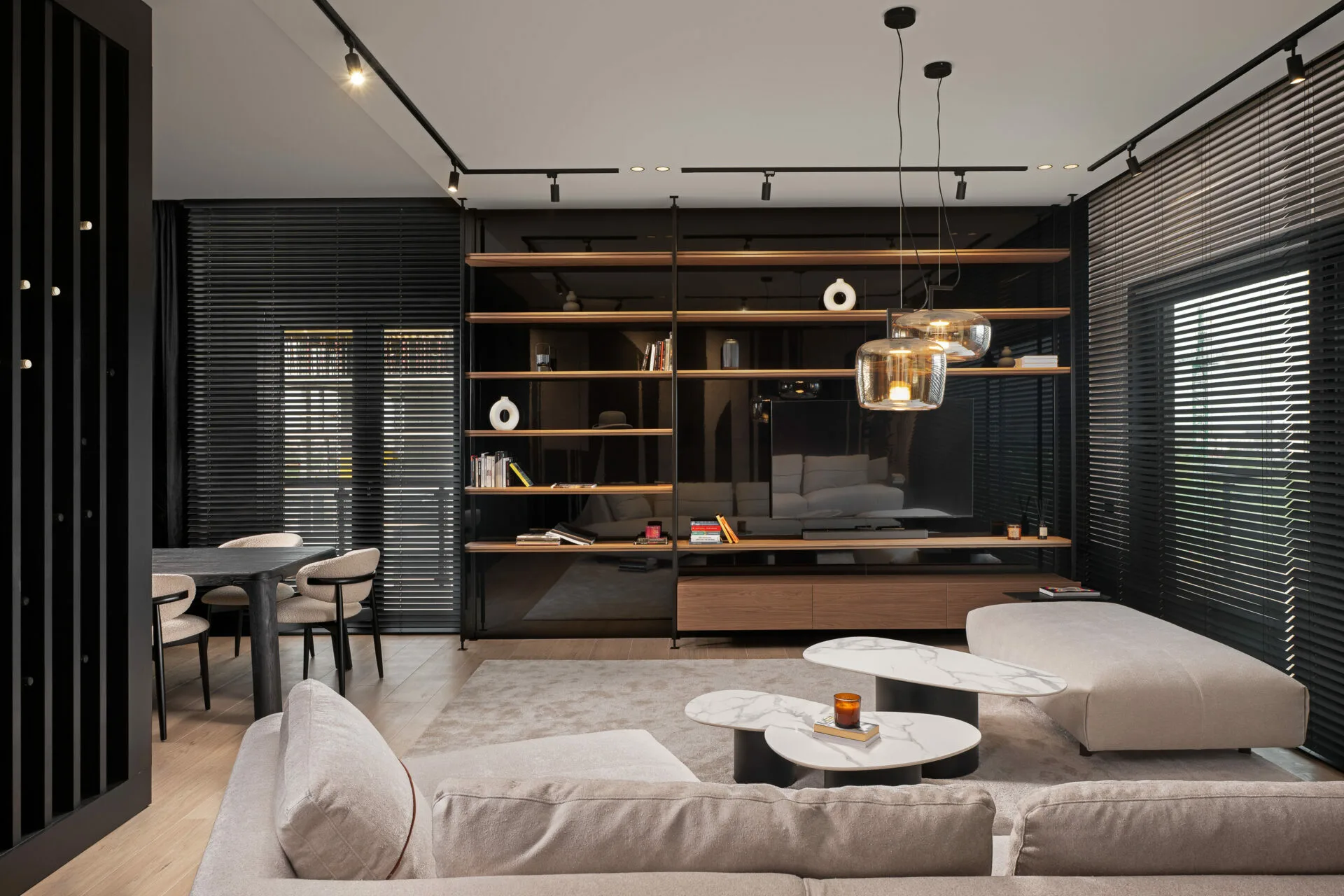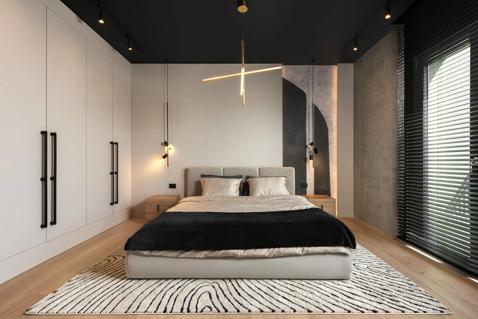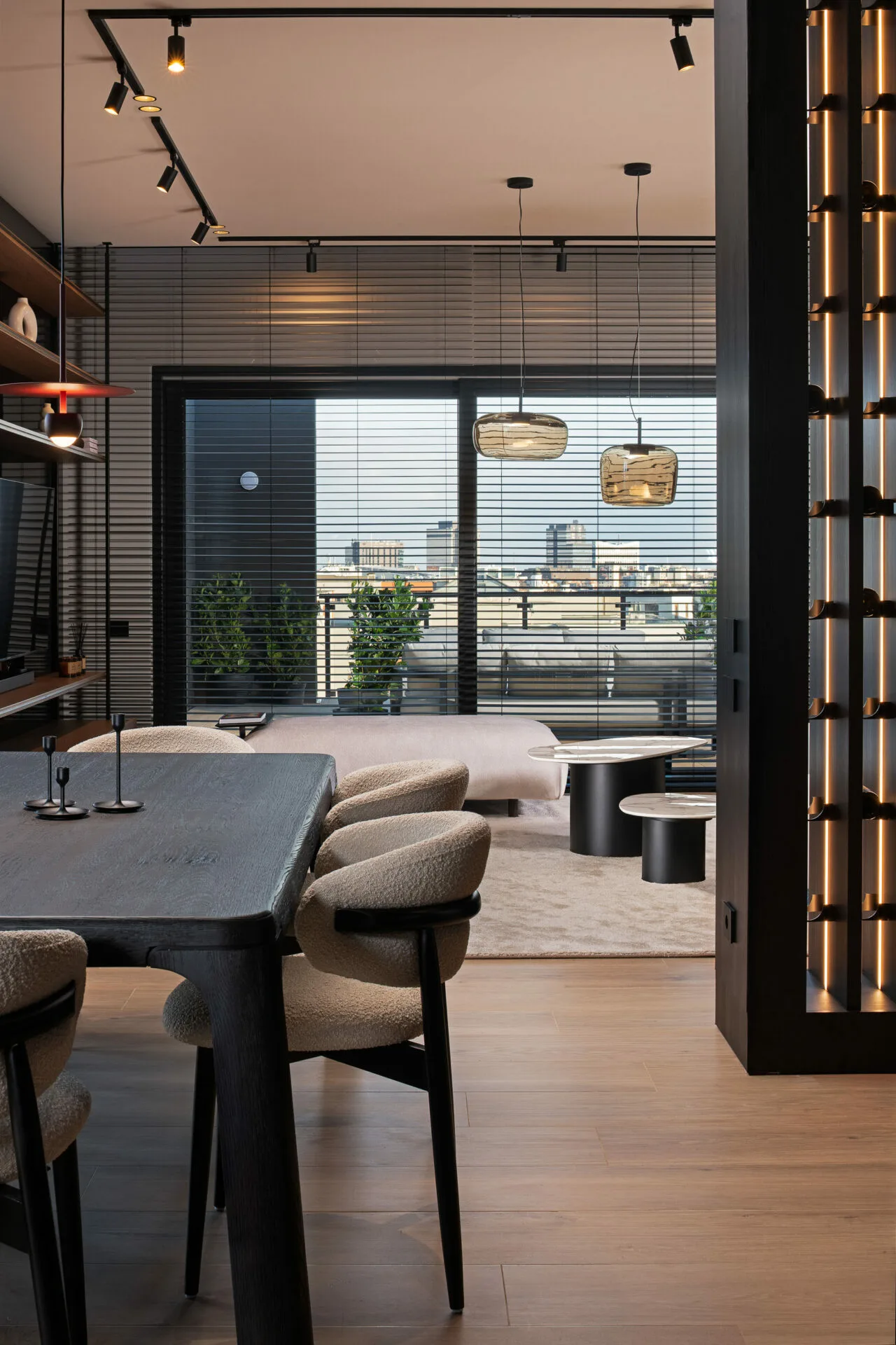 Fiecare detaliu, de la texturile ușilor la siluetele corpurilor de iluminat, se integrează într-un întreg coerent. Zona de zi se desfășoară ca o scenă deschisă, unde bucătăria, diningul și livingul își păstrează identitatea, menținând totodată o conexiune fluidă. Bucătăria, sculpturală și aproape monolitică, cu fronturi burgundy și un fundal sobru marmorat, capătă un efect cinematografic. Diningul ancorează spațiul prin masa și scaunele din lemn masiv, care echilibrează volumul și ergonomia. Livingul favorizează intimitatea prin măsuțe curbe, textile moi și iluminat ambiental ce definește zona fără a o închide. Dormitorul matrimonial creează un dialog între austeritatea brutalistă și rafinamentul contemporan. Volumele solide sunt îmblânzite de lumină liniară, iar paleta neutră, accentuată de negru și lemn cald, adaugă profunzime.