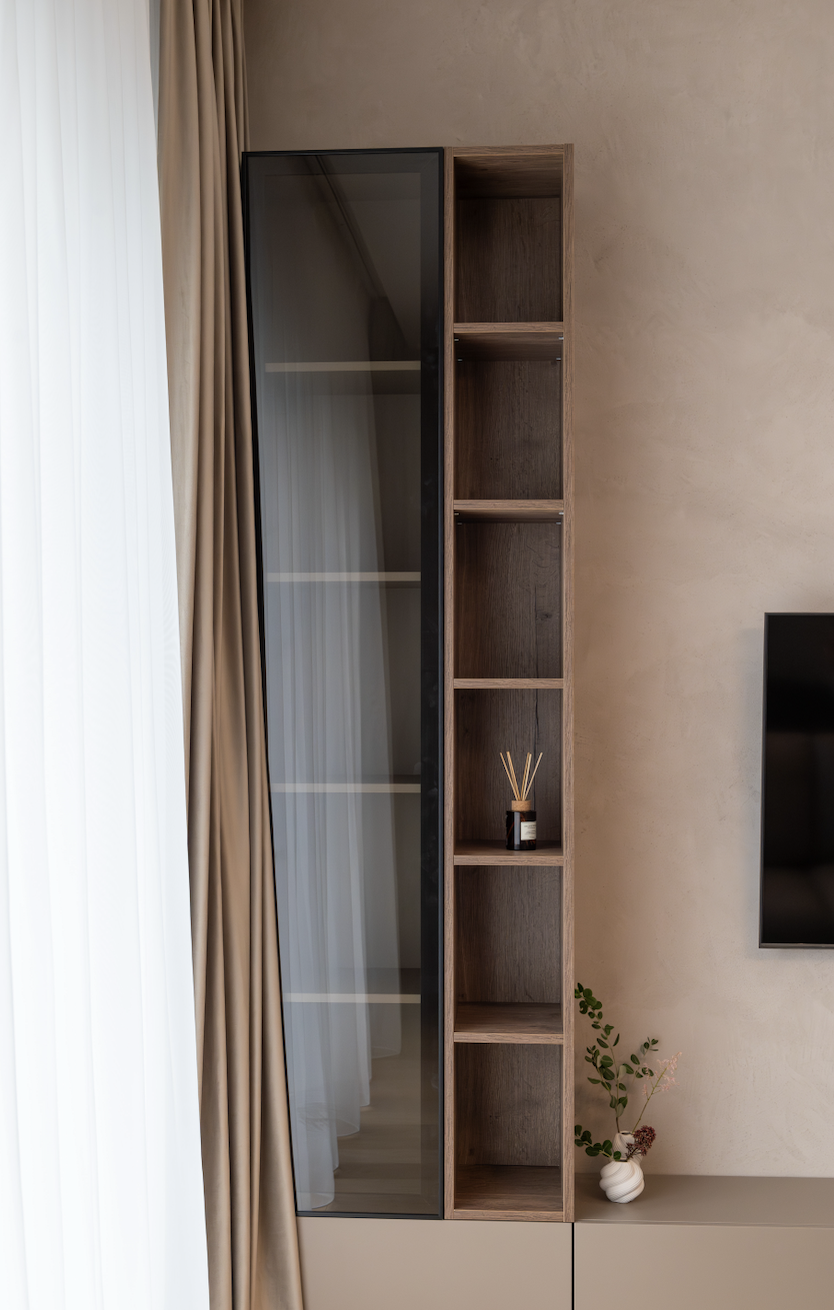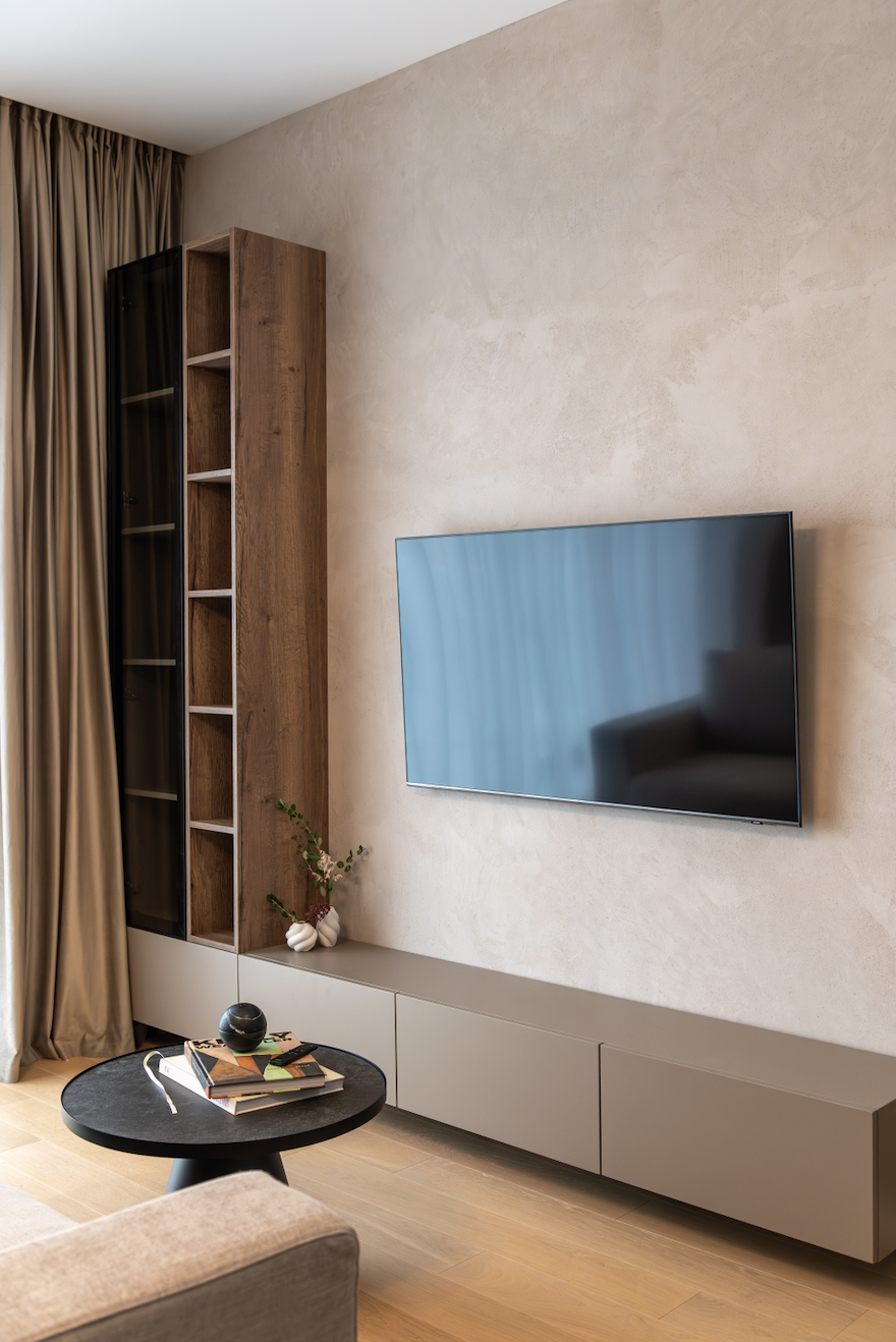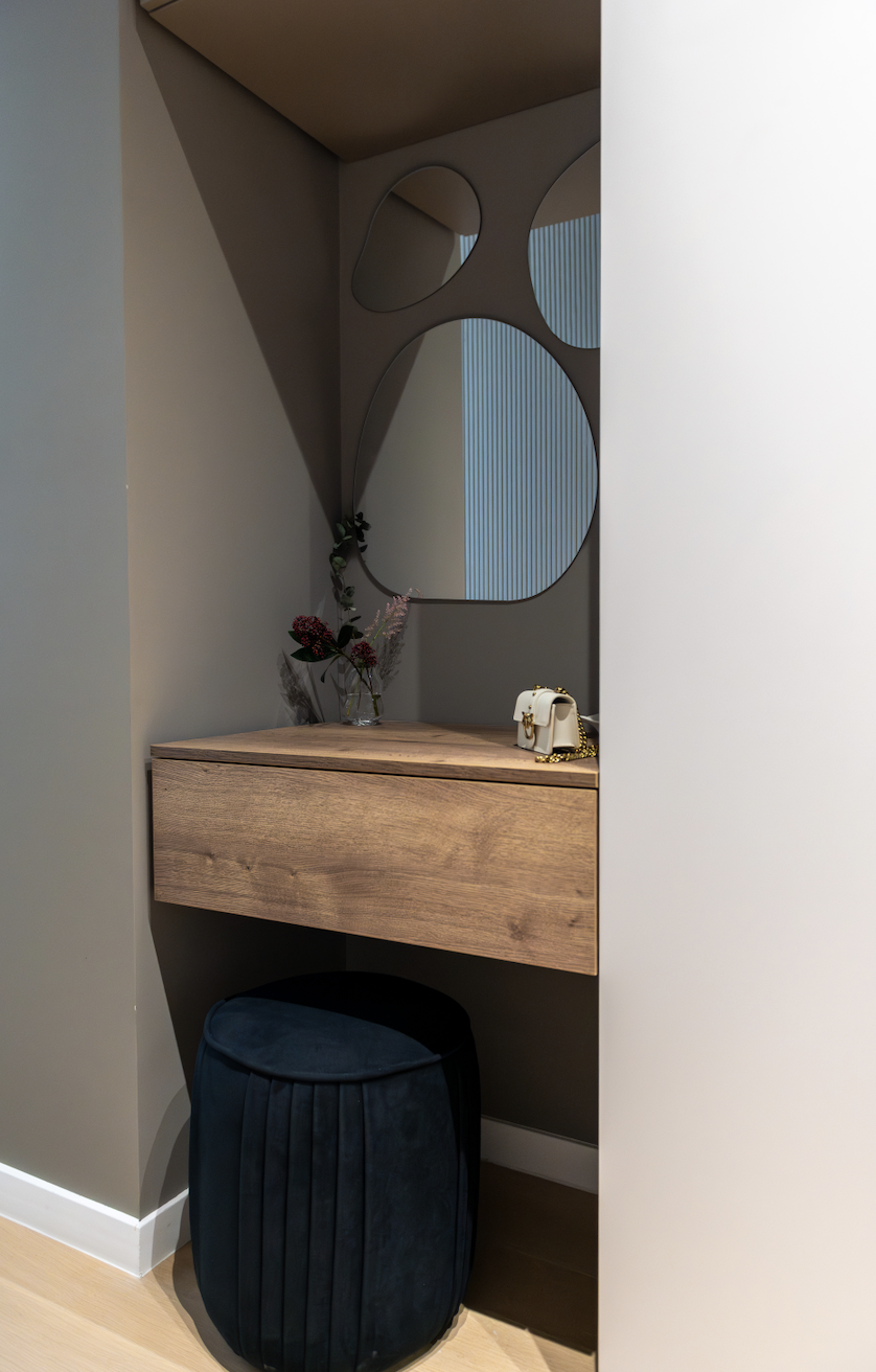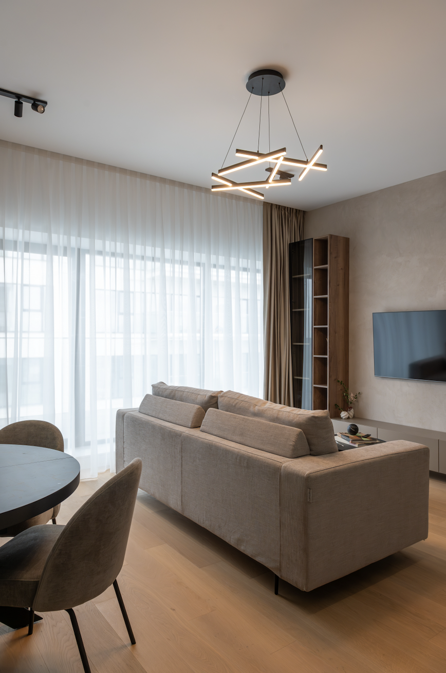 Am folosit ca paletă cromatică de bază nuanțe de taupe, atât deschise, cât și închise, alăturate unui decor din stejar tobacco, finisaje decorative pe bază de limestone, forme abstracte și accente alb-negru.