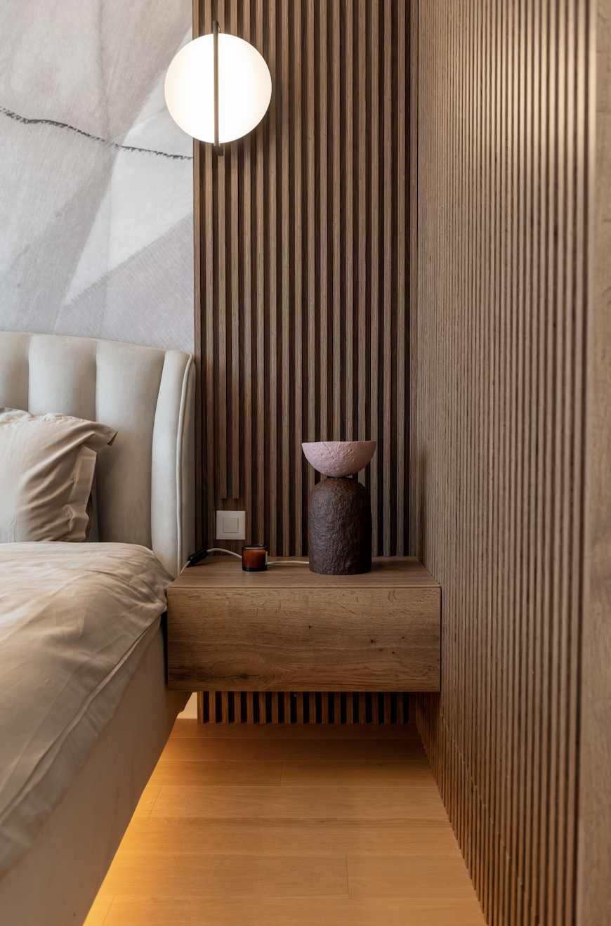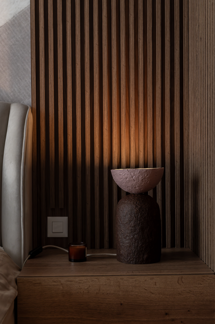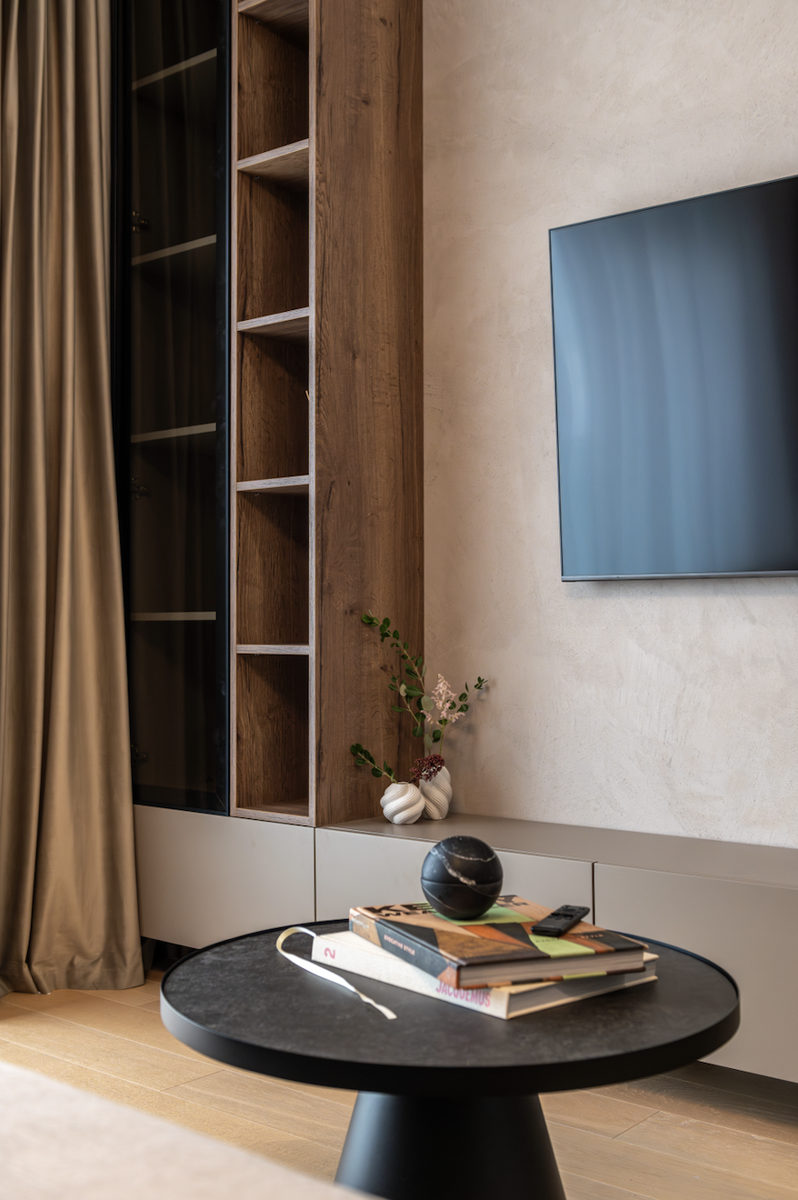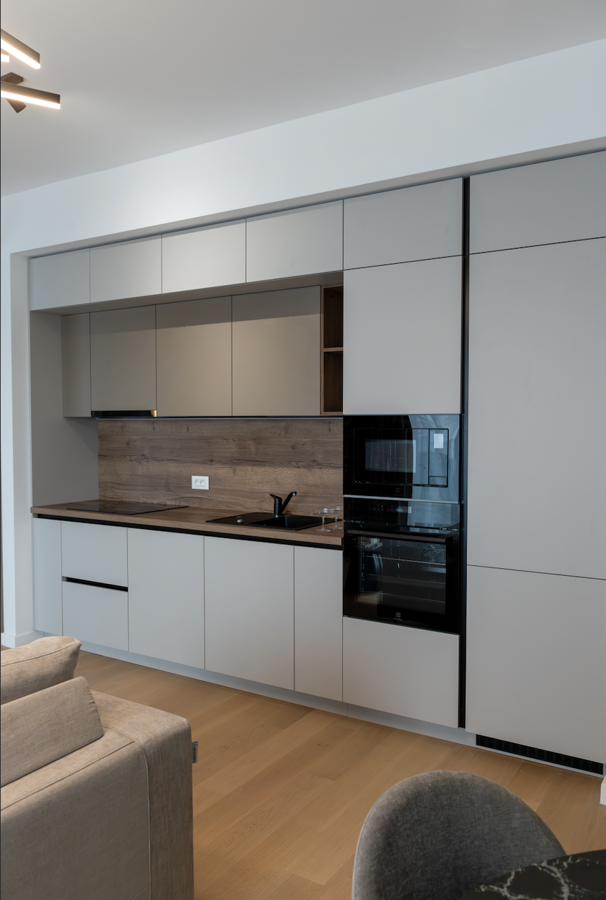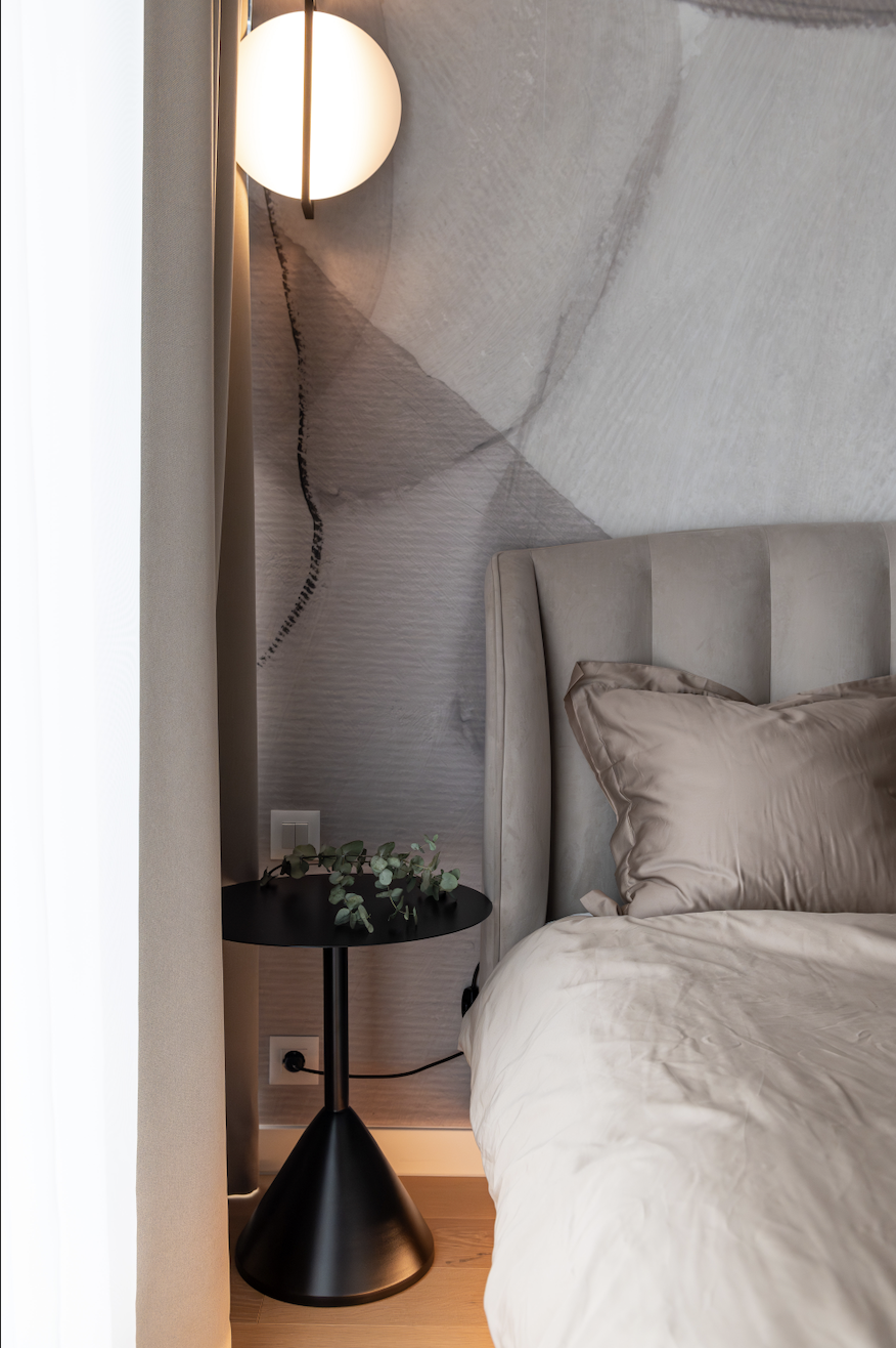 Am folosit ca paletă cromatică de bază nuanțe de taupe, atât deschise, cât și închise, alăturate unui decor din stejar tobacco, finisaje decorative pe bază de limestone, forme abstracte și accente alb-negru.