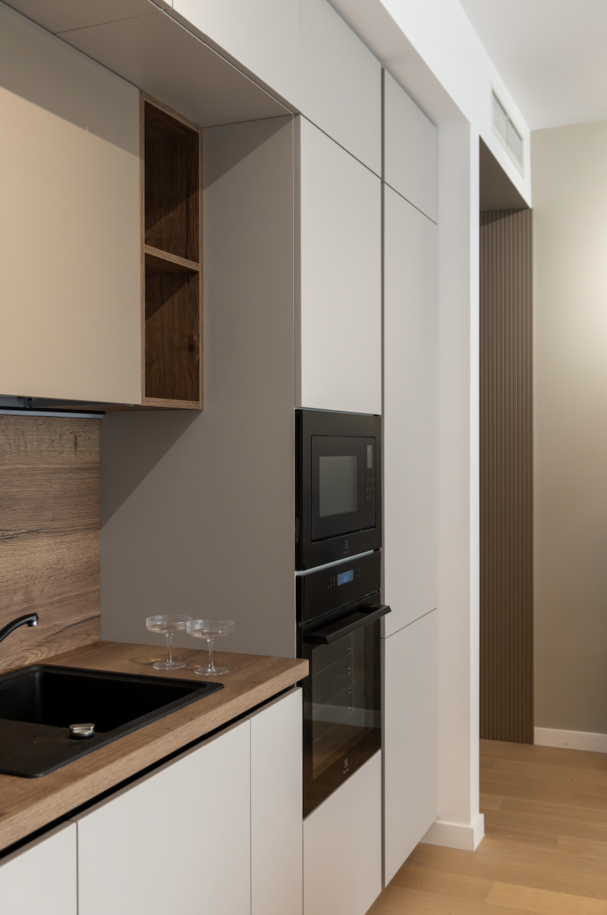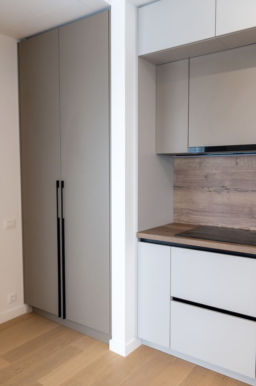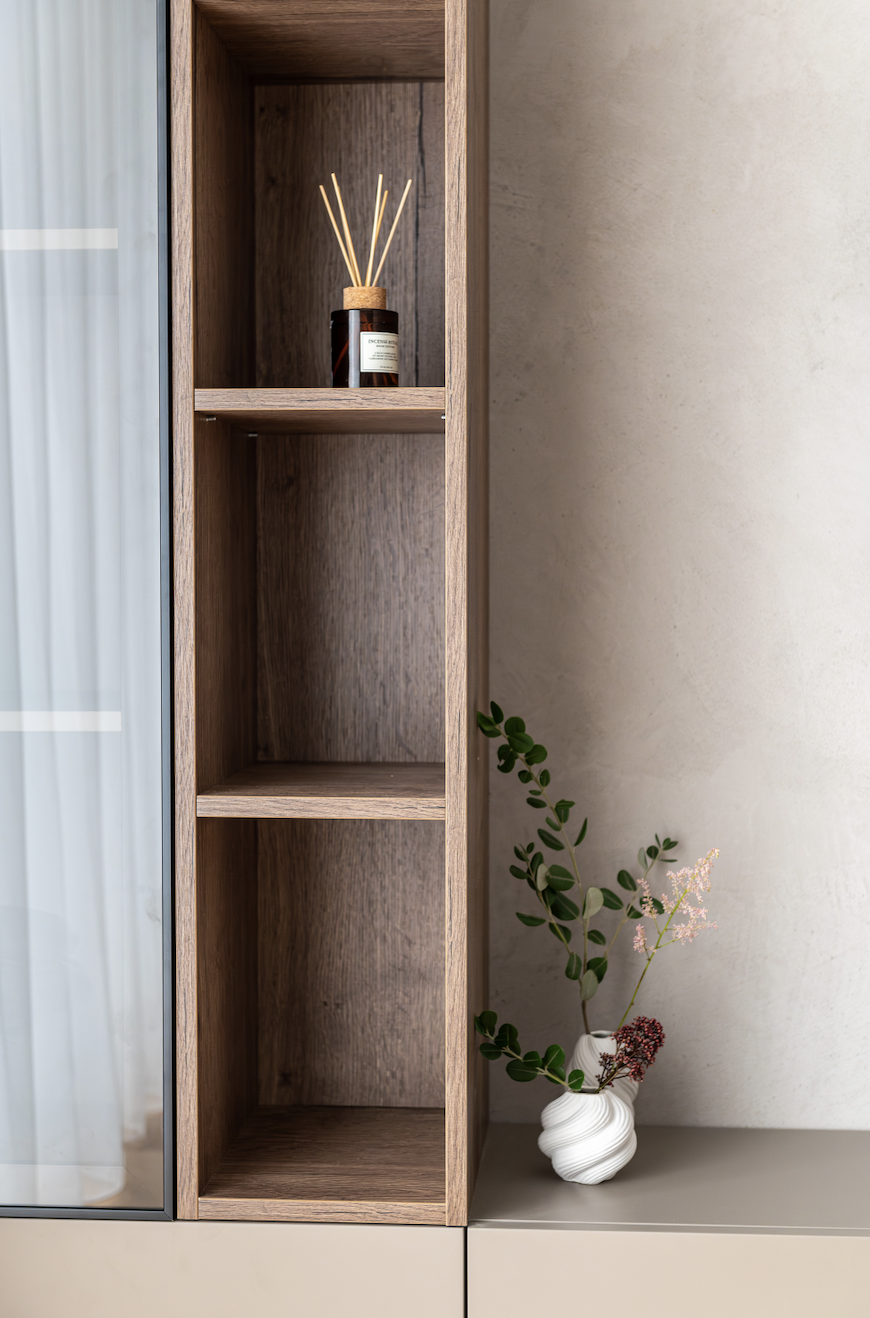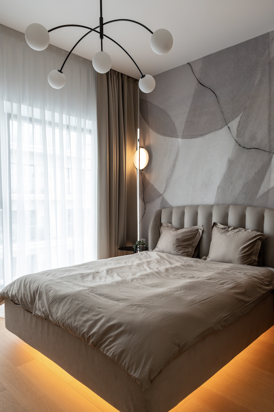 Am folosit ca paletă cromatică de bază nuanțe de taupe, atât deschise, cât și închise, alăturate unui decor din stejar tobacco, finisaje decorative pe bază de limestone, forme abstracte și accente alb-negru.