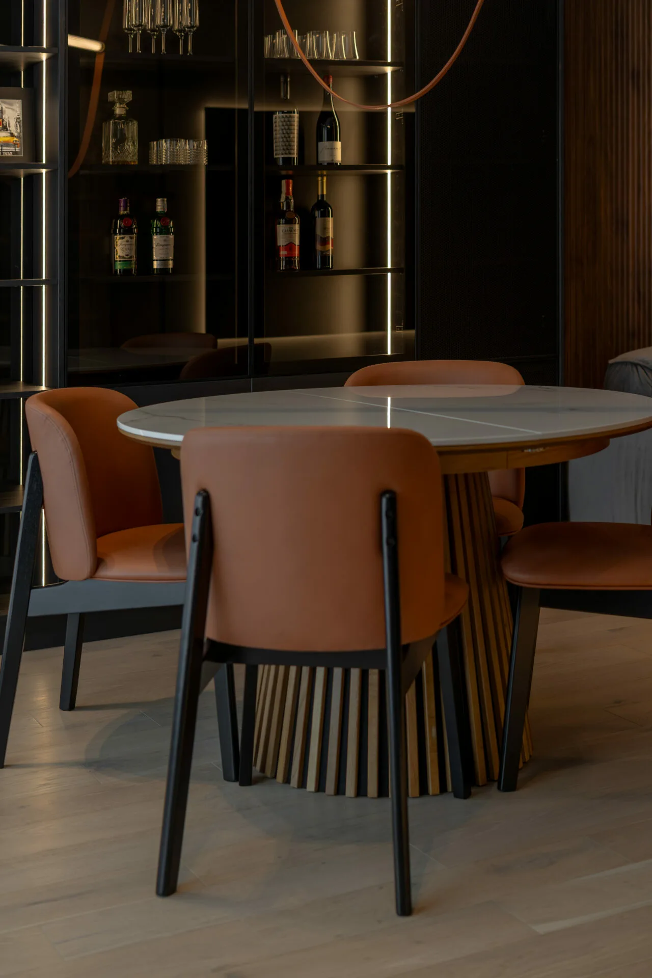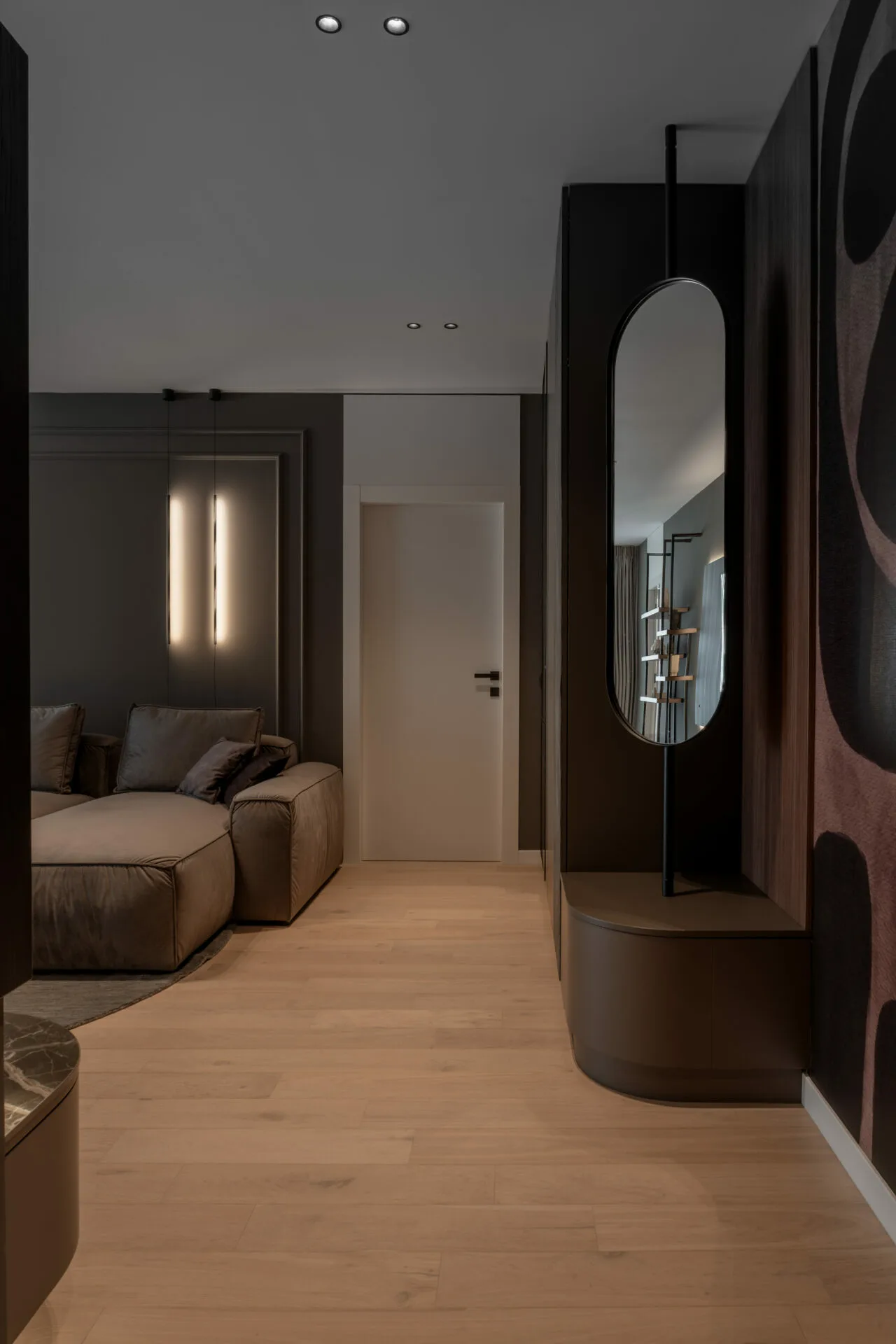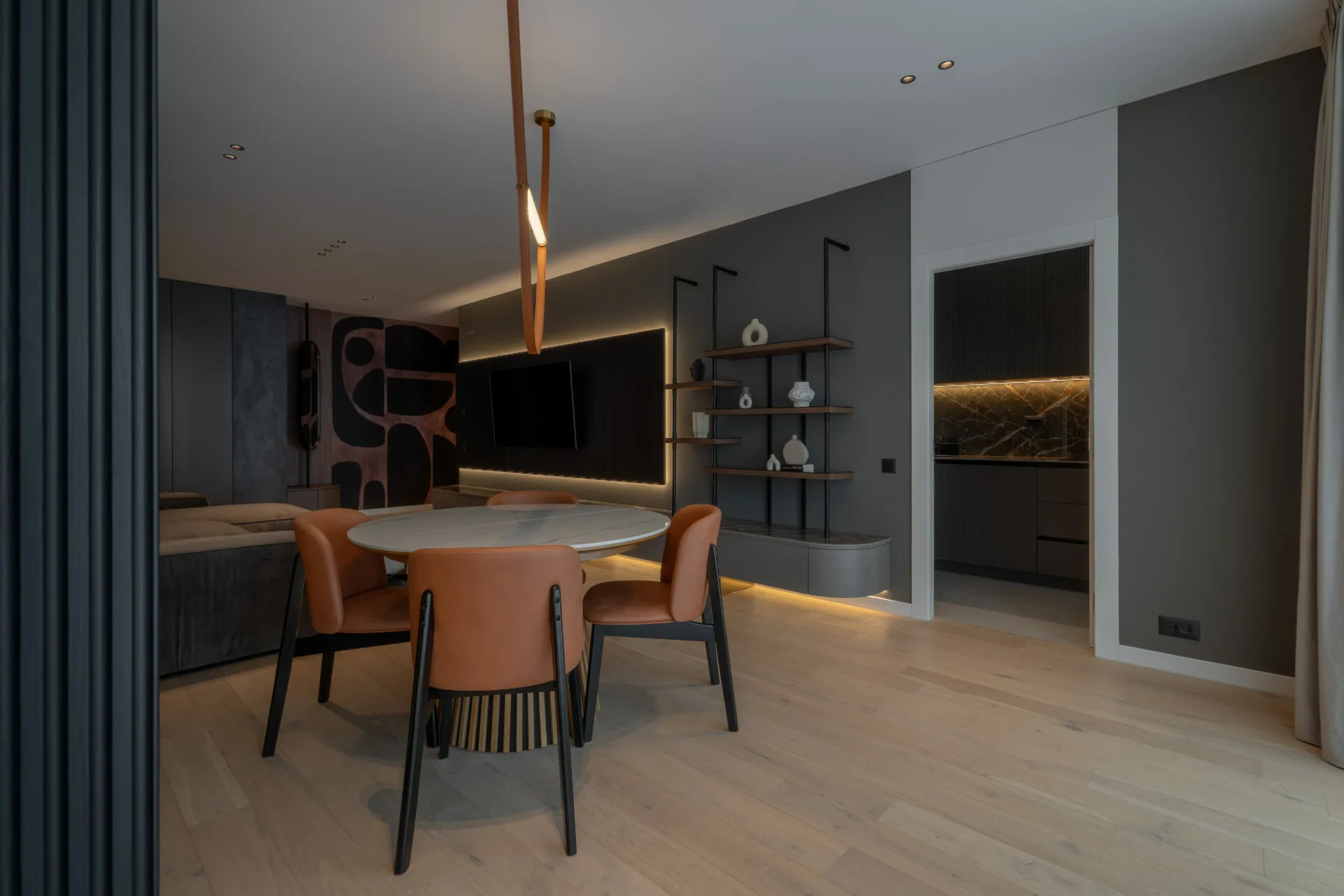 Amenajarea proiectului Mocha Shapes, realizată de Vibe Interior, explorează contrastele controlate, pornind de la o paletă cromatică în tonuri închise, dominată de maro și negru.