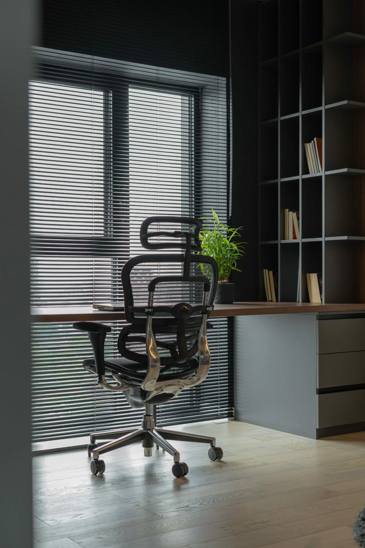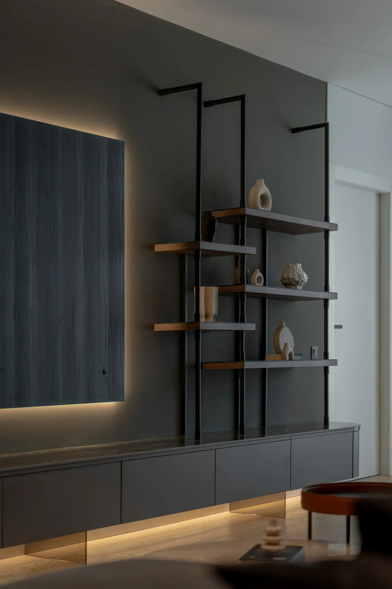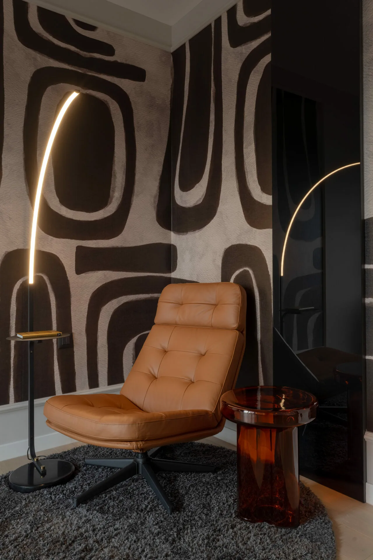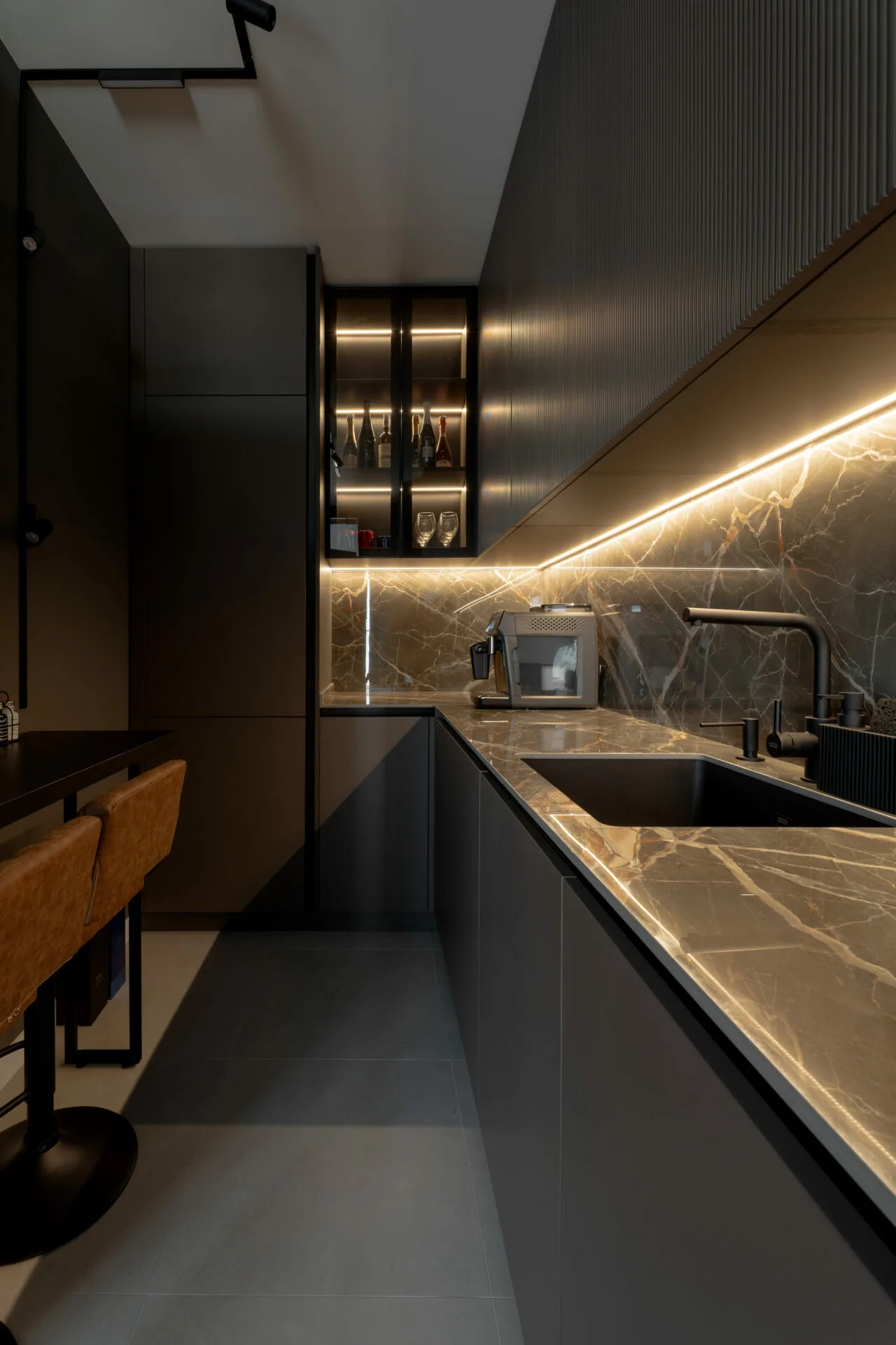 Amenajarea proiectului Mocha Shapes, realizată de Vibe Interior, explorează contrastele controlate, pornind de la o paletă cromatică în tonuri închise, dominată de maro și negru.