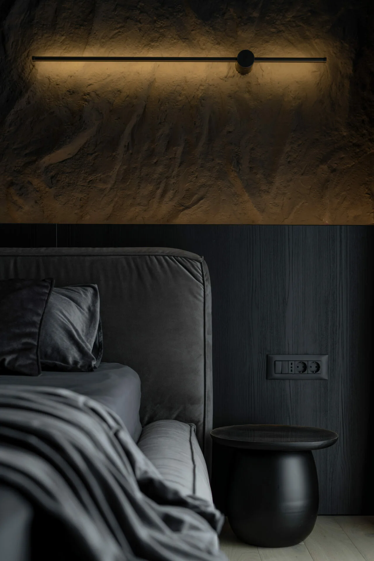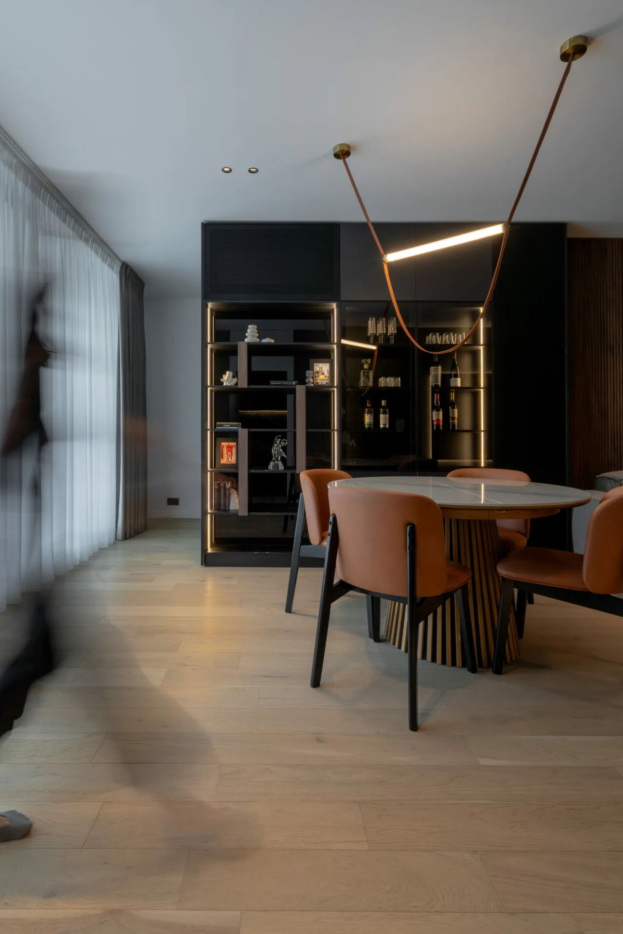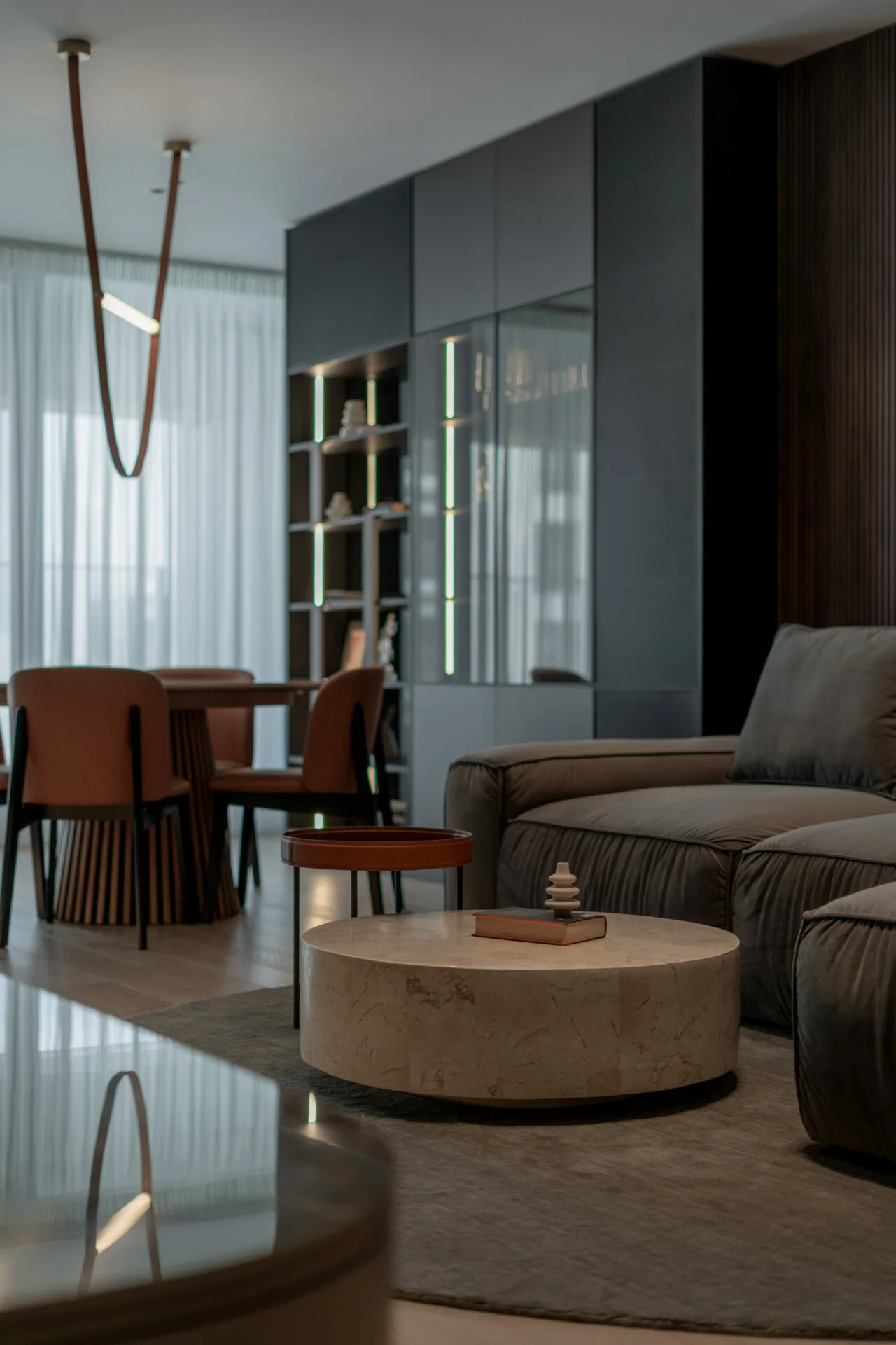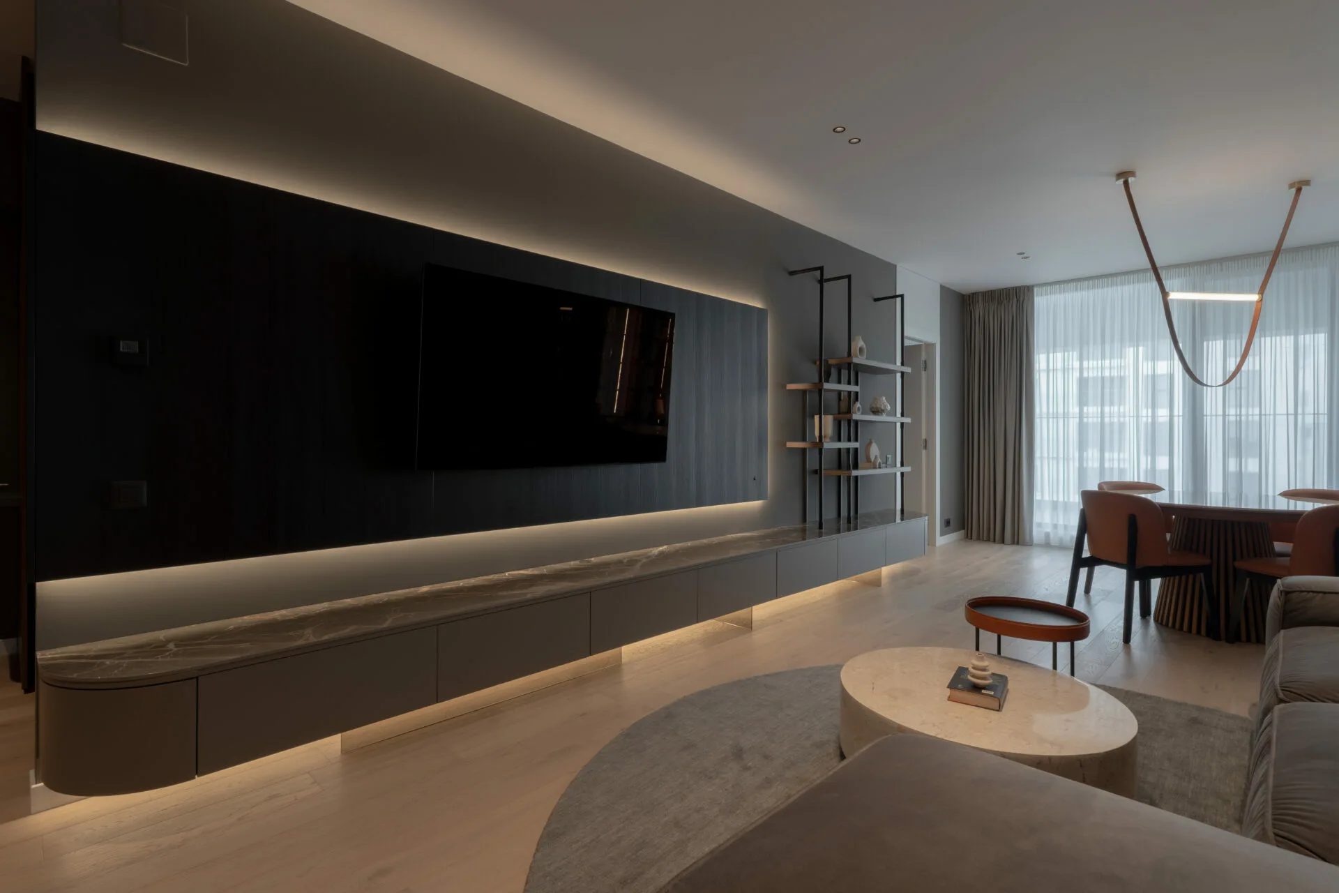 Canapeaua generoasă devine punctul de atracție, în timp ce peretele media se desfășoară pe întreaga lungime, îmbinând ceramica, MDF-ul vopsit și o bibliotecă cu structură metalică. Zona de dining introduce un contrast subtil prin nuanța de piele coniac, iar biblioteca opusă îndeplinește roluri multiple: depozitare, expunere și mascarea aparatului de aer condiționat. Dormitorul matrimonial se remarcă prin melanjul dintre peretele de rocă, realizat manual, și texturile catifelate ale patului. Zona de dressing și spațiul de machiaj, cu forme rotunjite, completează o amenajare care exprimă o viziune de design interior contemporan.