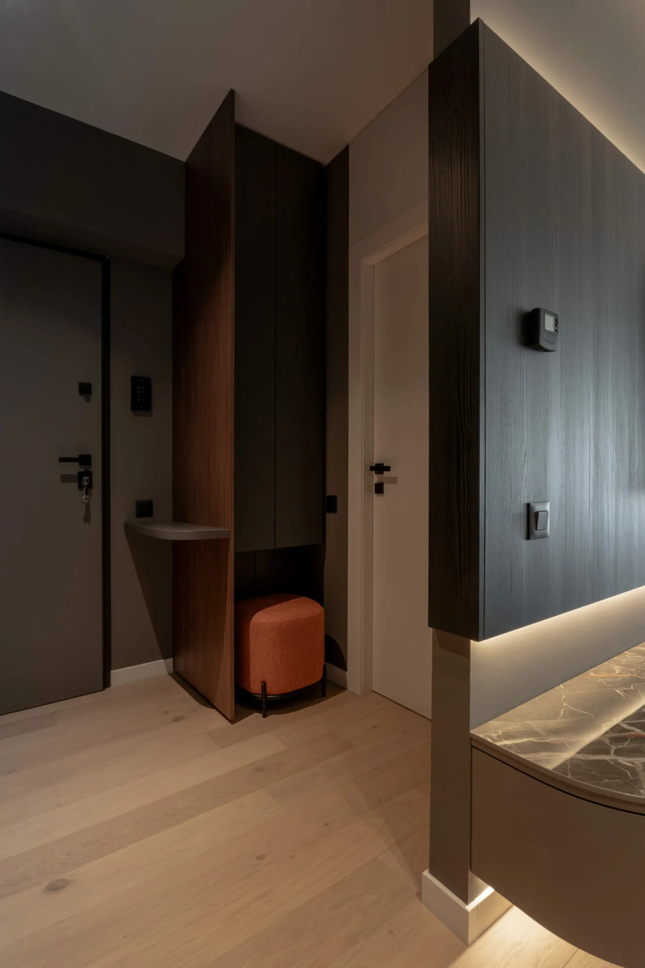 Încă de la intrare, spațiul este gândit ca o combinație între eficiență și confort vizual, cu depozitări generoase integrate și volume cu forme organice, care atenuează rigiditatea compoziției. Spațiul se deschide către zona de living și dining, concepute ca un ansamblu fluid.