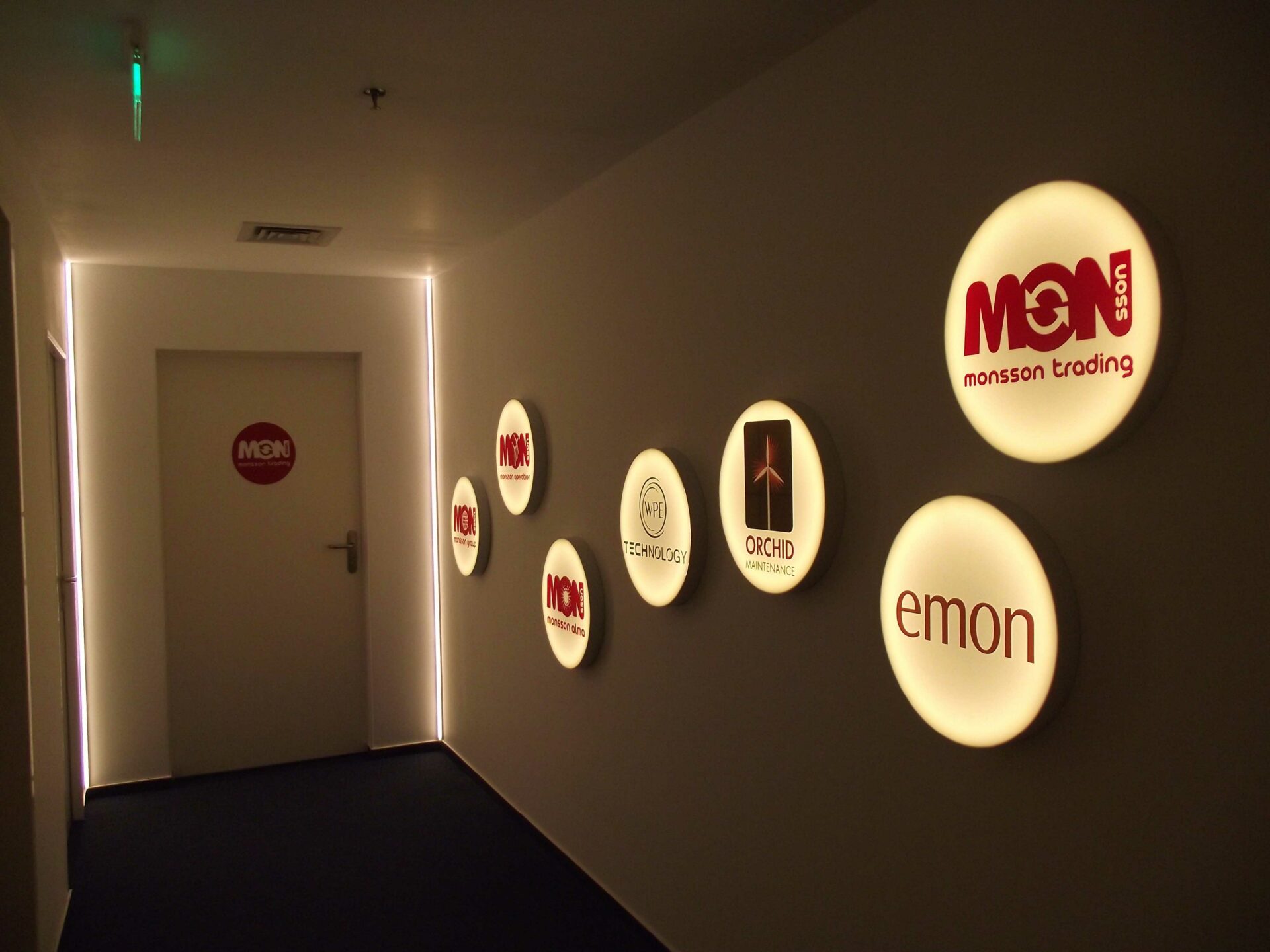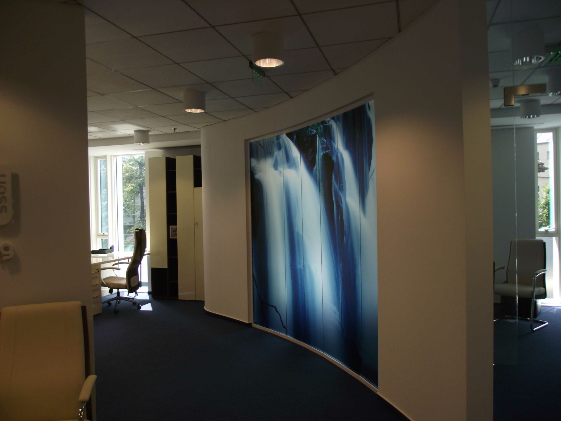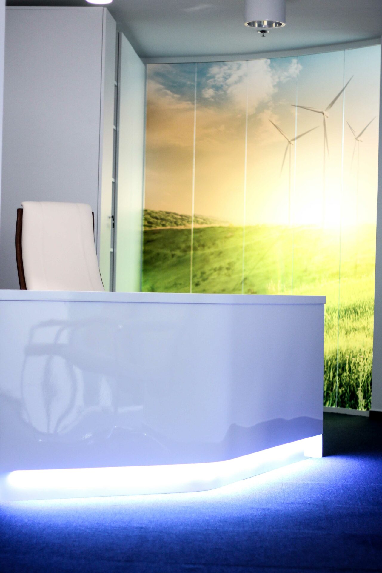 Constrângerile de poziționare și iluminare naturală a spațiului, cât și numărul de angajați ce urmau să lucreze atât în spațiile individuale, cât și în cele de tip open – respectând tematica generală de a crea un spațiu fluid care să reflecte domeniul de activitate al firmei, și anume producția și vânzarea de energie electrică obținută prin sisteme eoliene – au determinat utilizarea unor pereți curbi și a unor compartimentări atipice pentru 2014, din sticlă printată cu o cromatică care să invite natura în interior. Astfel, s-a lucrat foarte mult la latura subliminală a percepției: utilizarea luminii naturale cât și artificiale care să treacă prin printurile sticlei semitransparente (cu coeficienți calculați ai indicilor de reflectivitate și refracție și a poziționării surselor de iluminat artificial și a incidenței luminii naturale) pentru a arunca raze în camerele adiacente și a marca anumite spații într-un mod care să trimită constant cu gândul la natură și pentru a marca zona de branding, cum este peretele din spatele recepției, din sticlă printată cu o eoliană poziționată pe un câmp. Însă, din spate, soarele are transparență mărită, permițând ca iluminatul artificial al aplicei din camera adiacentă să dea impresia unui soare real.