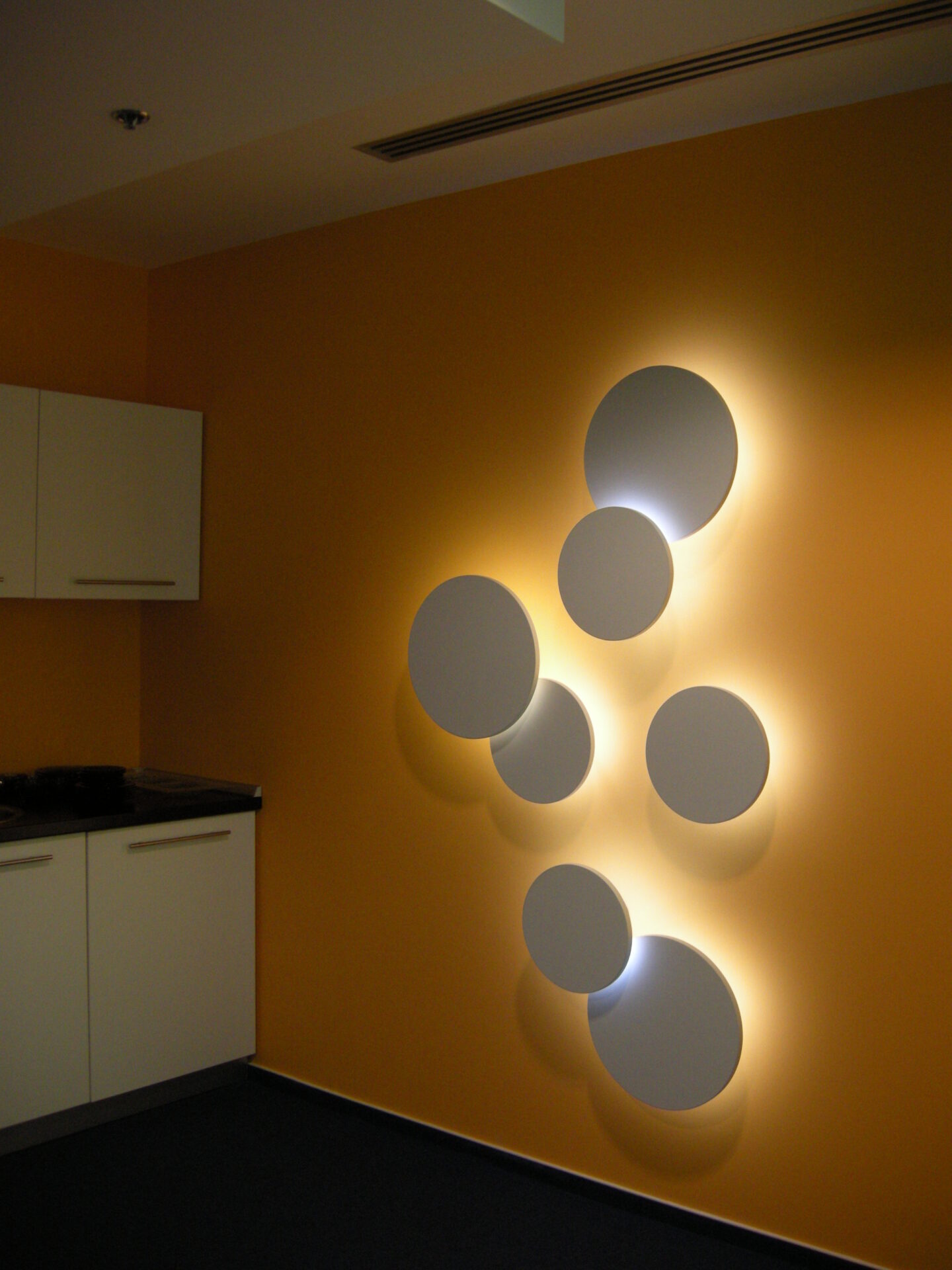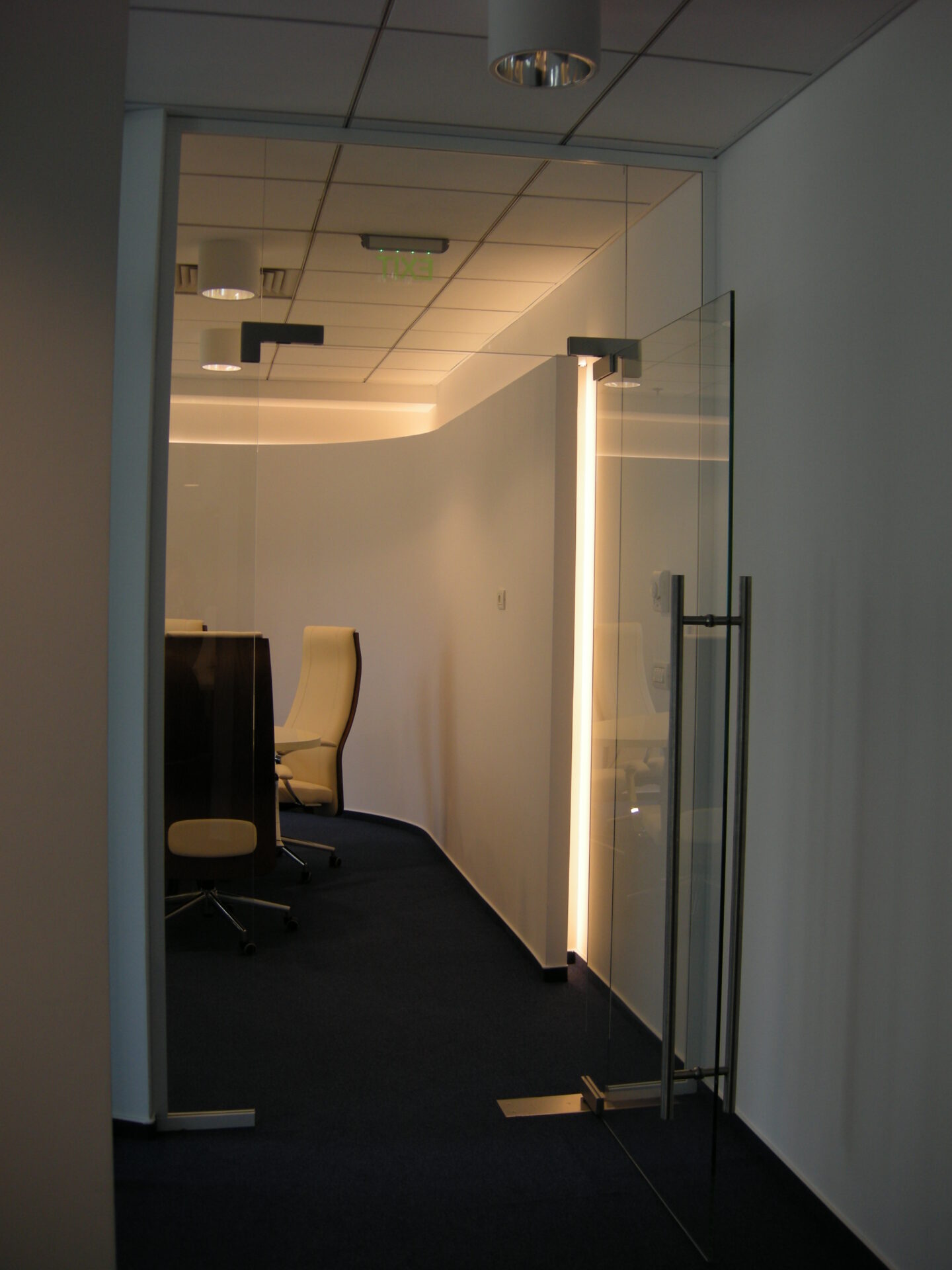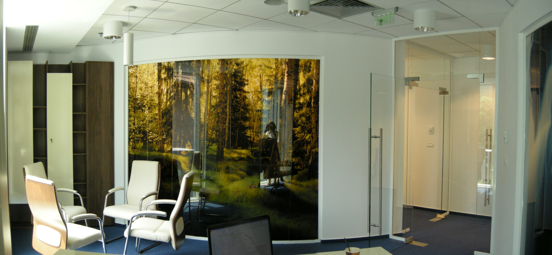 Constrângerile de poziționare și iluminare naturală a spațiului, cât și numărul de angajați ce urmau să lucreze atât în spațiile individuale, cât și în cele de tip open – respectând tematica generală de a crea un spațiu fluid care să reflecte domeniul de activitate al firmei, și anume producția și vânzarea de energie electrică obținută prin sisteme eoliene – au determinat utilizarea unor pereți curbi și a unor compartimentări atipice pentru 2014, din sticlă printată cu o cromatică care să invite natura în interior. Astfel, s-a lucrat foarte mult la latura subliminală a percepției: utilizarea luminii naturale cât și artificiale care să treacă prin printurile sticlei semitransparente (cu coeficienți calculați ai indicilor de reflectivitate și refracție și a poziționării surselor de iluminat artificial și a incidenței luminii naturale) pentru a arunca raze în camerele adiacente și a marca anumite spații într-un mod care să trimită constant cu gândul la natură și pentru a marca zona de branding, cum este peretele din spatele recepției, din sticlă printată cu o eoliană poziționată pe un câmp. Însă, din spate, soarele are transparență mărită, permițând ca iluminatul artificial al aplicei din camera adiacentă să dea impresia unui soare real.