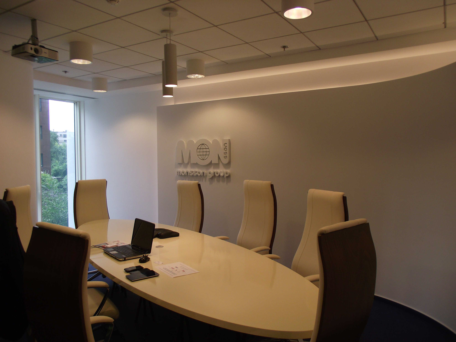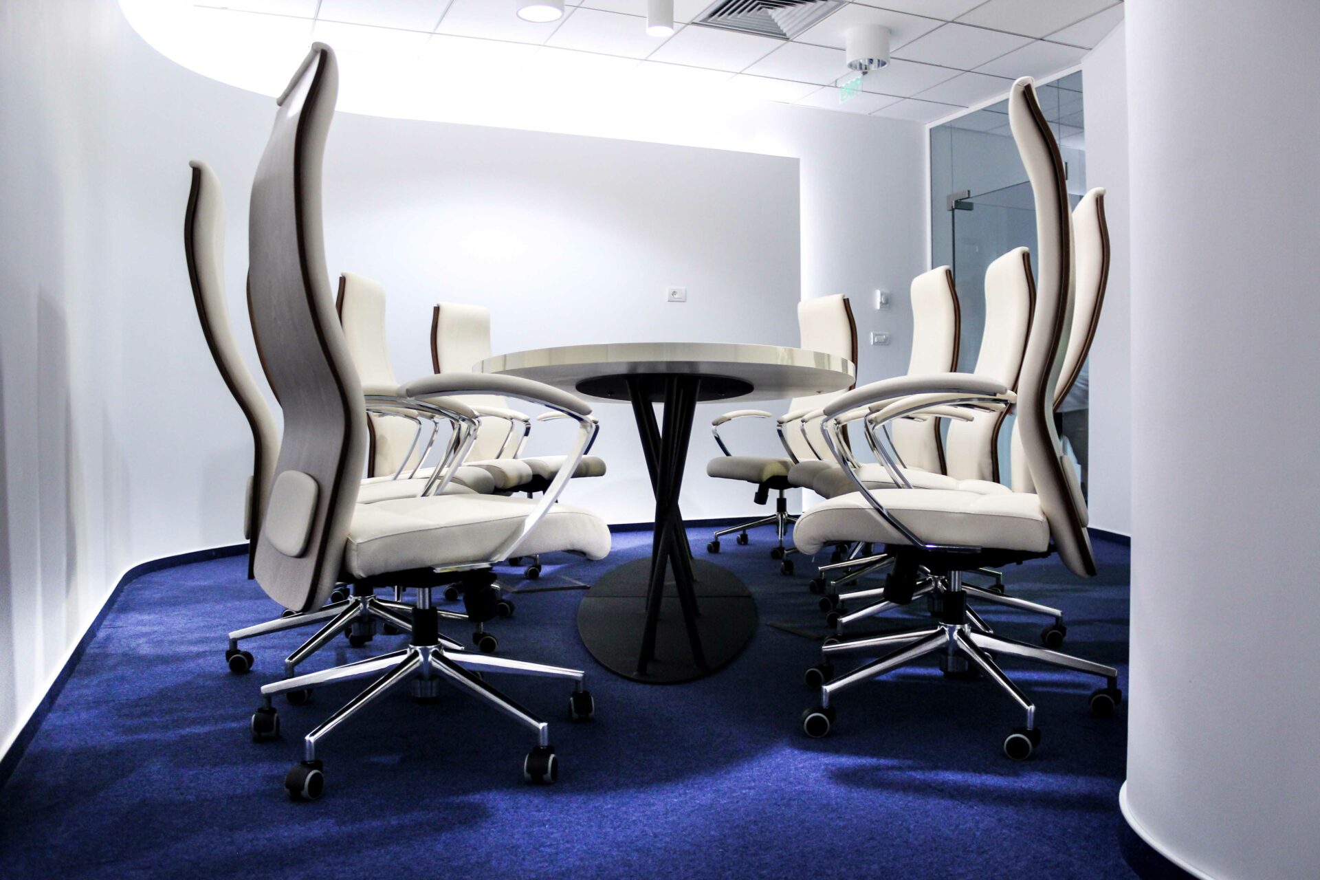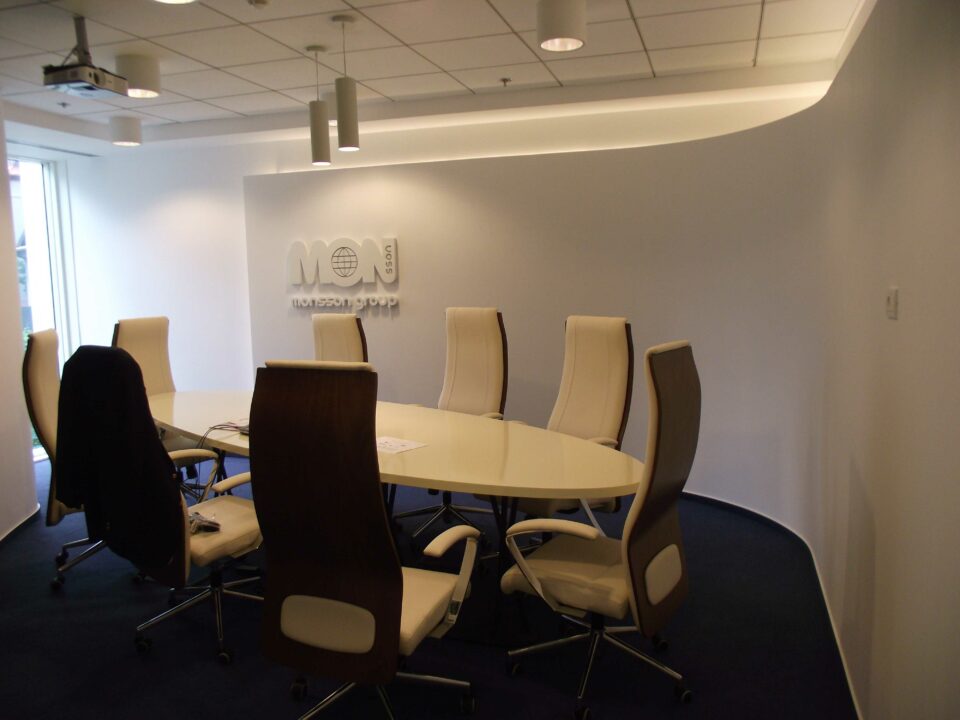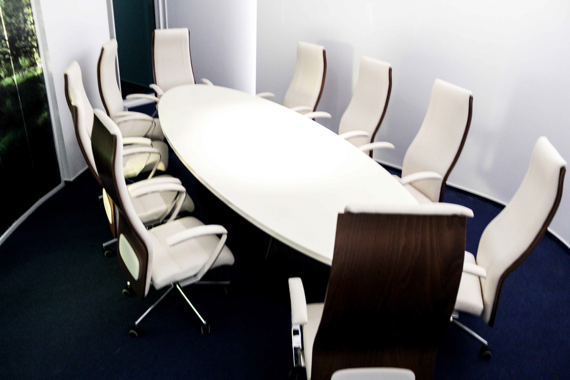 Sala de ședințe este gândită pornind de la ideea unei mese rotunde de discuții, însă adaptabilitatea la spațiul existent a impus o formă concavă, cu un retroiluminat folosit pentru a crea o ambianță primitoare și caldă, și utilizarea unui mobilier custom-made pentru a genera un număr cât mai mare de utilizatori; în definirea acesteia s-a recurs la inventarea unor forme ale piciorului mesei pentru a reitera ideea unui element natural și anume pădurea ca element de susținere. S-a acordat o atenție deosebită detaliilor, astfel că s-a mers mai departe de printul de pe sticlă cu motiv natural din zona adiacentă a biroului managerului, cu un grad de transparență care să permită o intimitate, dar și destul de permisiv pentru a se observa dacă sala de ședințe este ocupată, menținându-se o zonă clară a sticlei în zona de acces în spațiul respectiv. În definirea compartimentării s-a ținut seama și de unghiurile de perspectivă accesibile în funcție de poziționare în locație, jonglându-se cu elementul de intimitate pentru a crea acea atmosferă de relaxare într-un mediu restrâns și deficitat de iluminat natural.