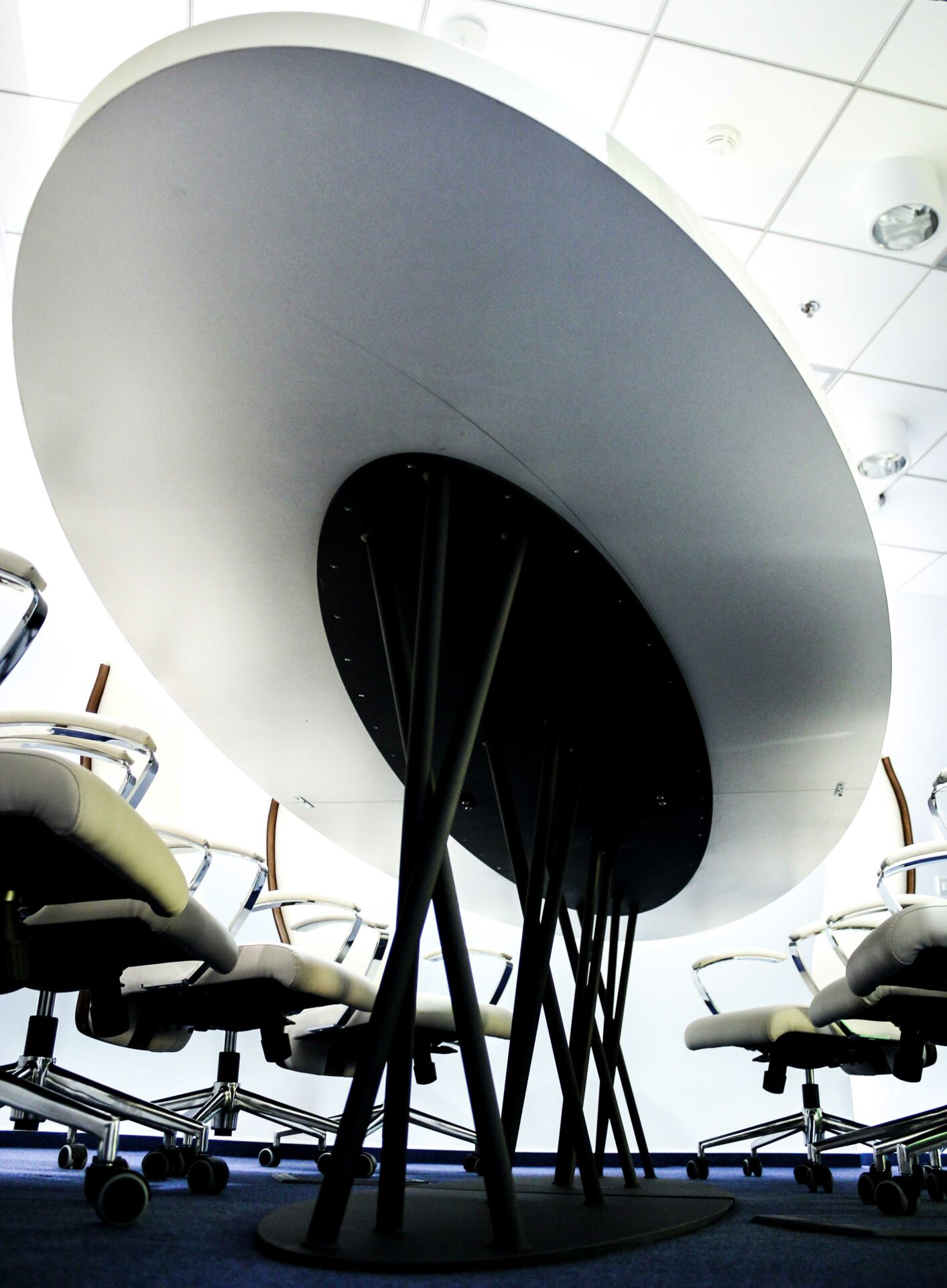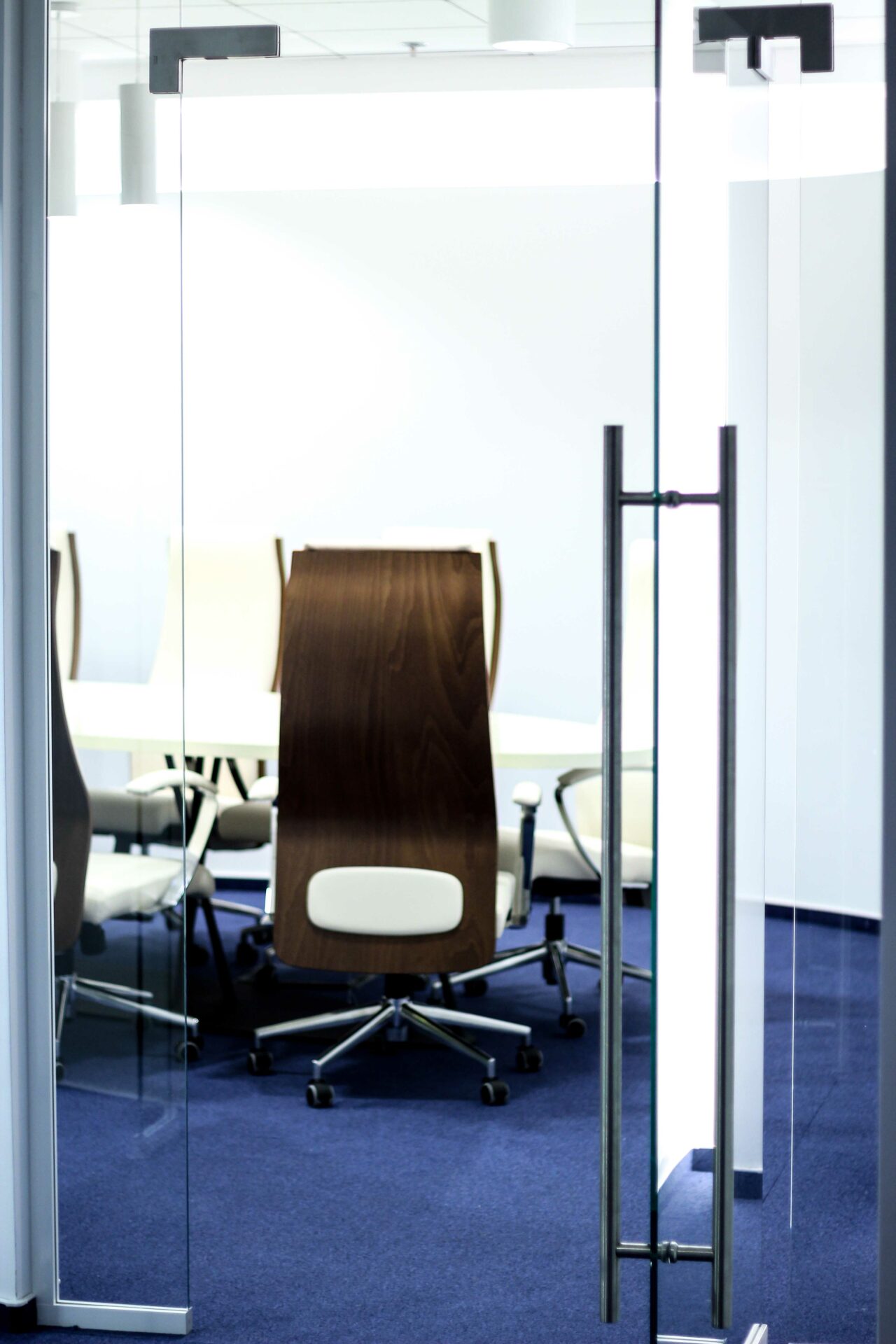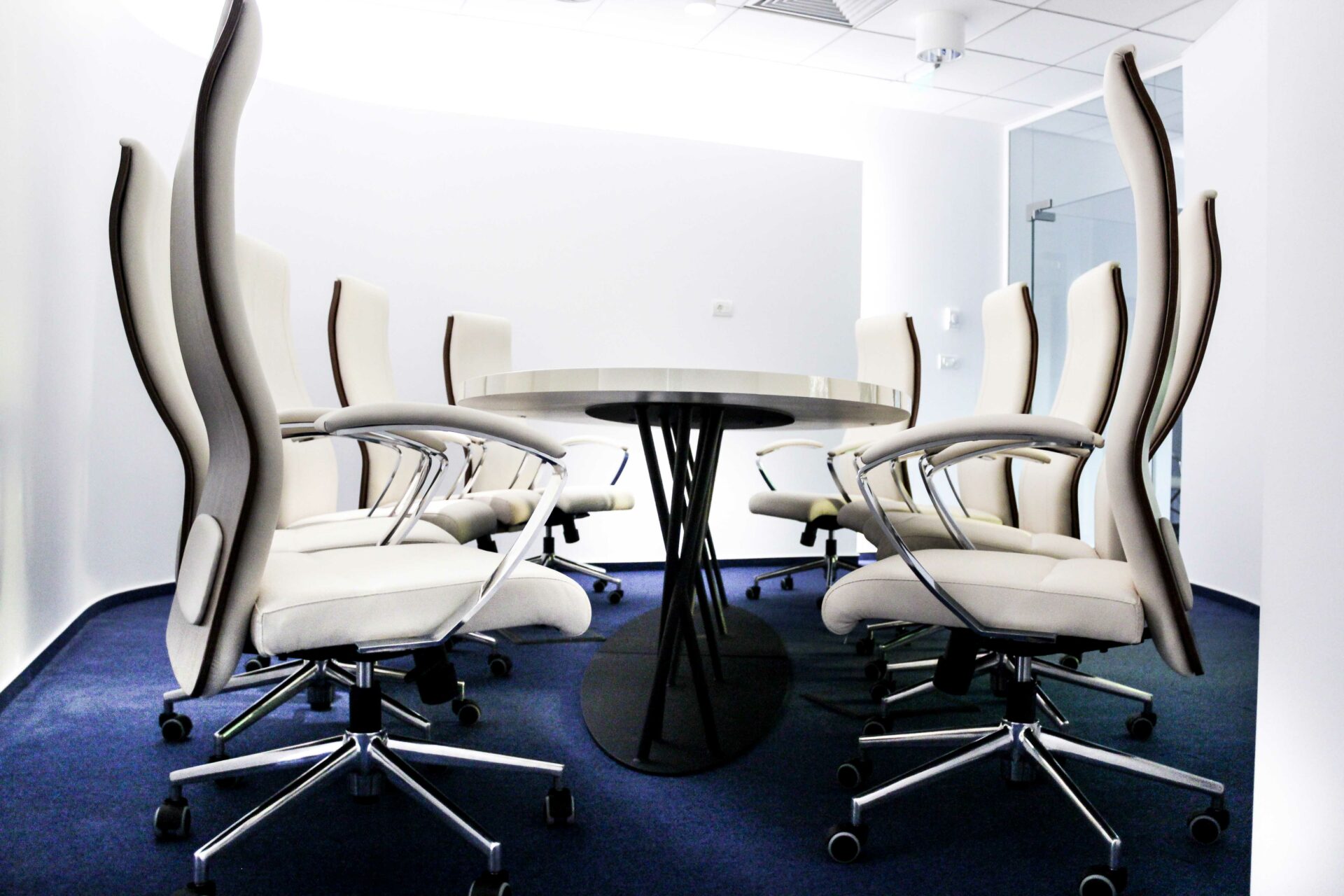Sala de ședințe este gândită pornind de la ideea unei mese rotunde de discuții, însă adaptabilitatea la spațiul existent a impus o formă concavă, cu un retroiluminat folosit pentru a crea o ambianță primitoare și caldă, și utilizarea unui mobilier custom-made pentru a genera un număr cât mai mare de utilizatori; în definirea acesteia s-a recurs la inventarea unor forme ale piciorului mesei pentru a reitera ideea unui element natural și anume pădurea ca element de susținere. S-a acordat o atenție deosebită detaliilor, astfel că s-a mers mai departe de printul de pe sticlă cu motiv natural din zona adiacentă a biroului managerului, cu un grad de transparență care să permită o intimitate, dar și destul de permisiv pentru a se observa dacă sala de ședințe este ocupată, menținându-se o zonă clară a sticlei în zona de acces în spațiul respectiv. În definirea compartimentării s-a ținut seama și de unghiurile de perspectivă accesibile în funcție de poziționare în locație, jonglându-se cu elementul de intimitate pentru a crea acea atmosferă de relaxare într-un mediu restrâns și deficitat de iluminat natural.