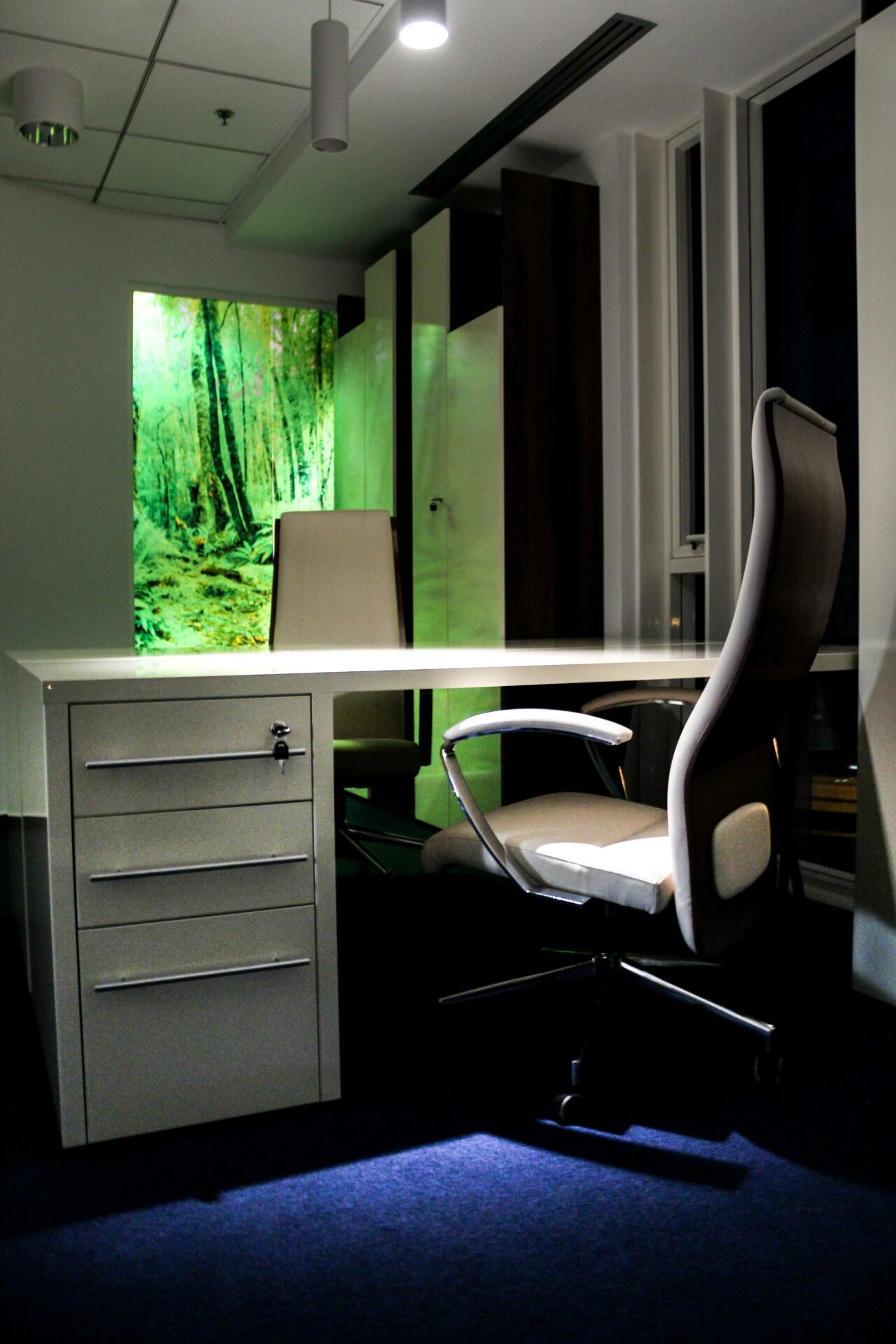 Biroul managerial este gândit astfel încât poziția directorului este în zona mai amplă, iar invitații în zona îngustată, spre a crea un dublu sens: în contextul negocierilor, spațiul să joace un rol de dominare, dar în momentul primirii să direcționeze și, prin natura umană de a se simți mai bine în zone mai deschise, să ducă cu gândul la o deschidere din partea celui care îi primește. Birourile din zona open sunt gândite astfel încât să fie flancate de pereți concavi care să dea impresia de amploare a spațiului, a unui mediu relaxant prin folosirea finisajelor și poziționării surselor de iluminat. În opoziție, birourile individuale reflectă o direcție mai restrânsă, fără a crea un efect claustrofobic, prin alternarea pereților solizi cu cei din sticlă printată cu motive naturale.