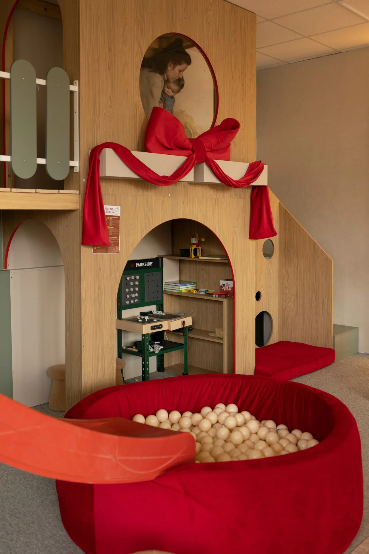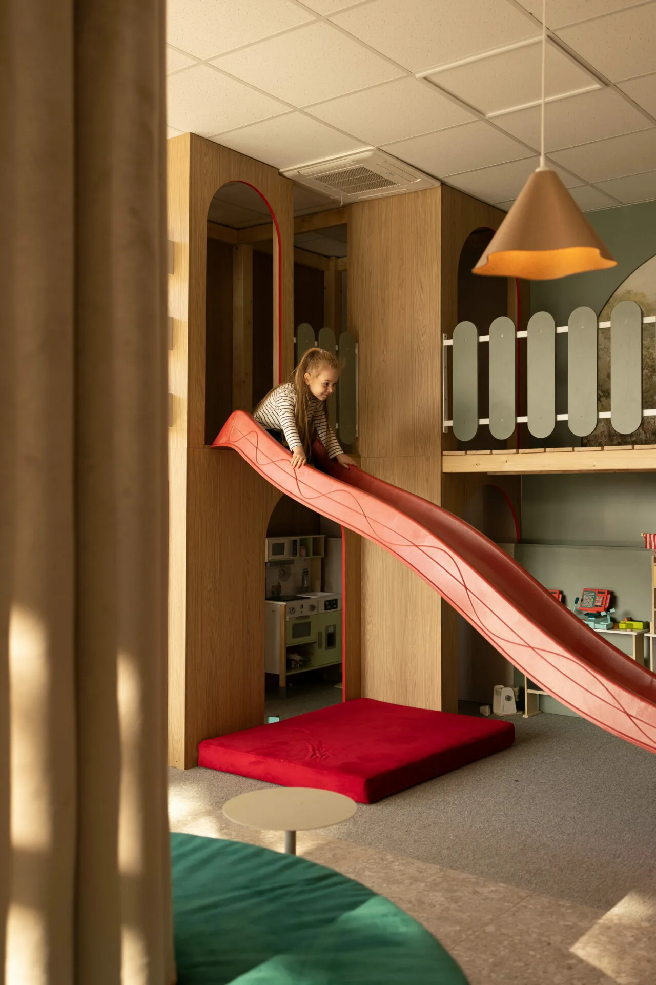 Cromatica adoptată este una veselă, menită să inspire căldură și să invite la joacă, dar și emblematică și recognoscibilă, prin accentele puternice de roșu.