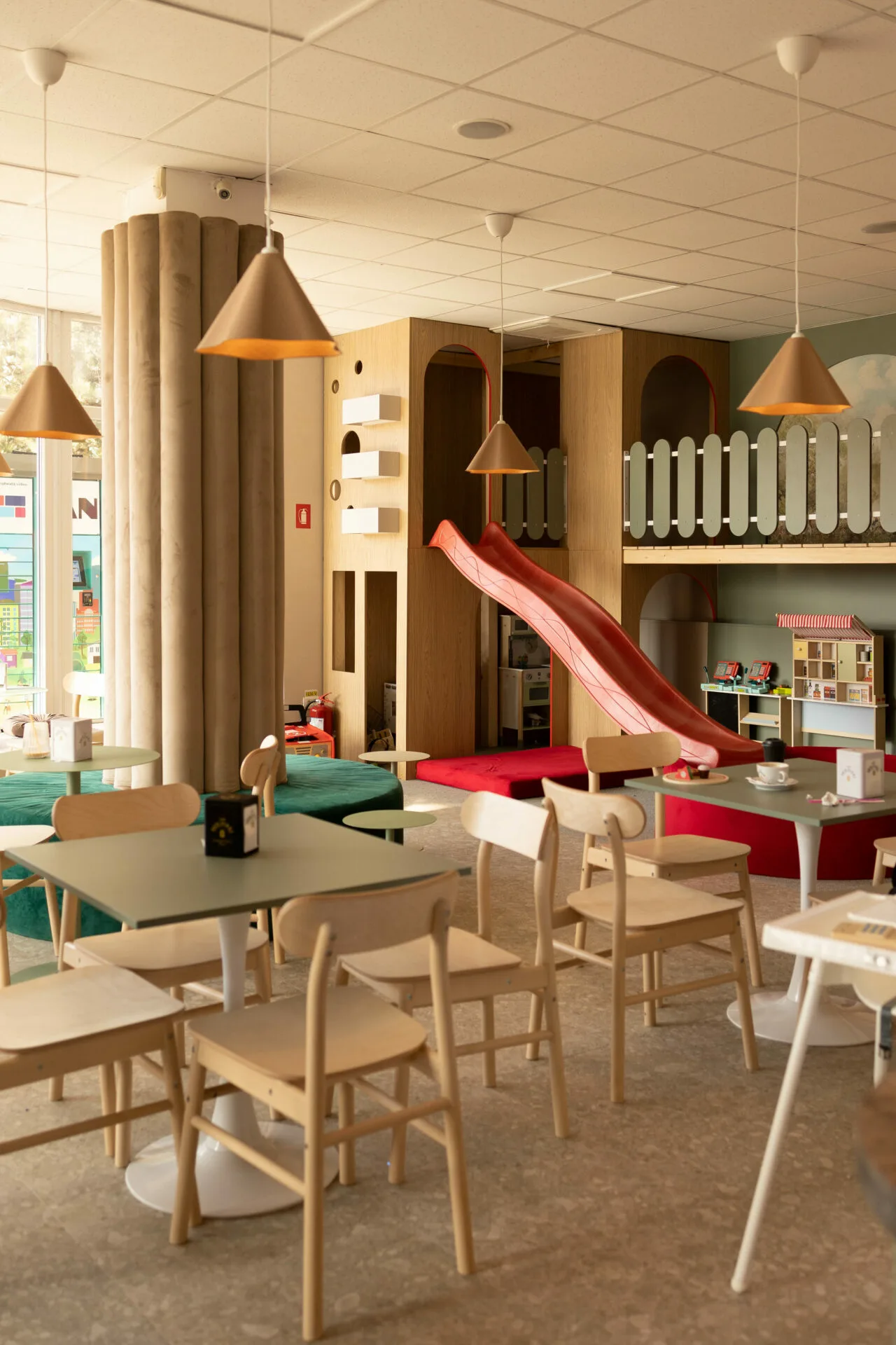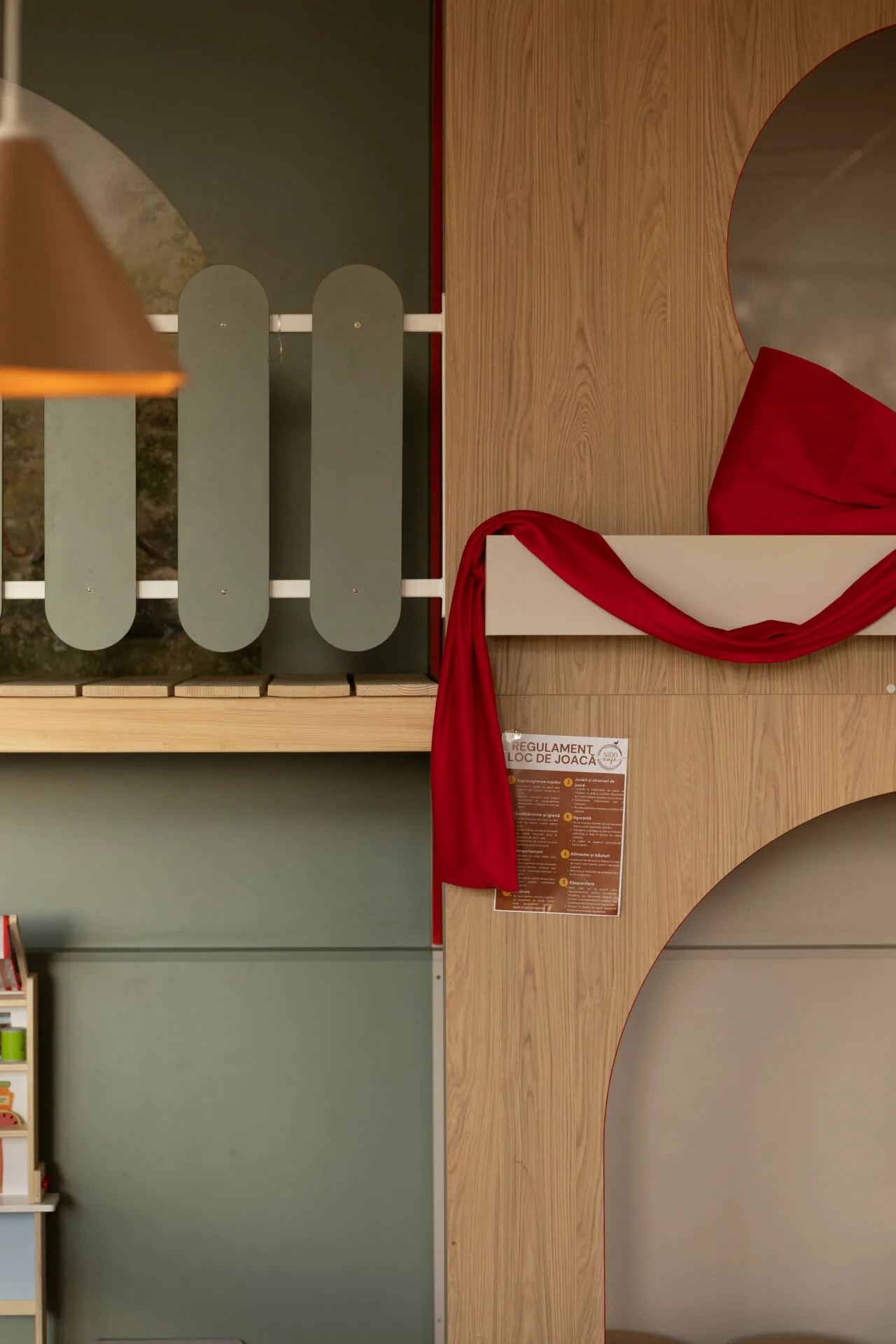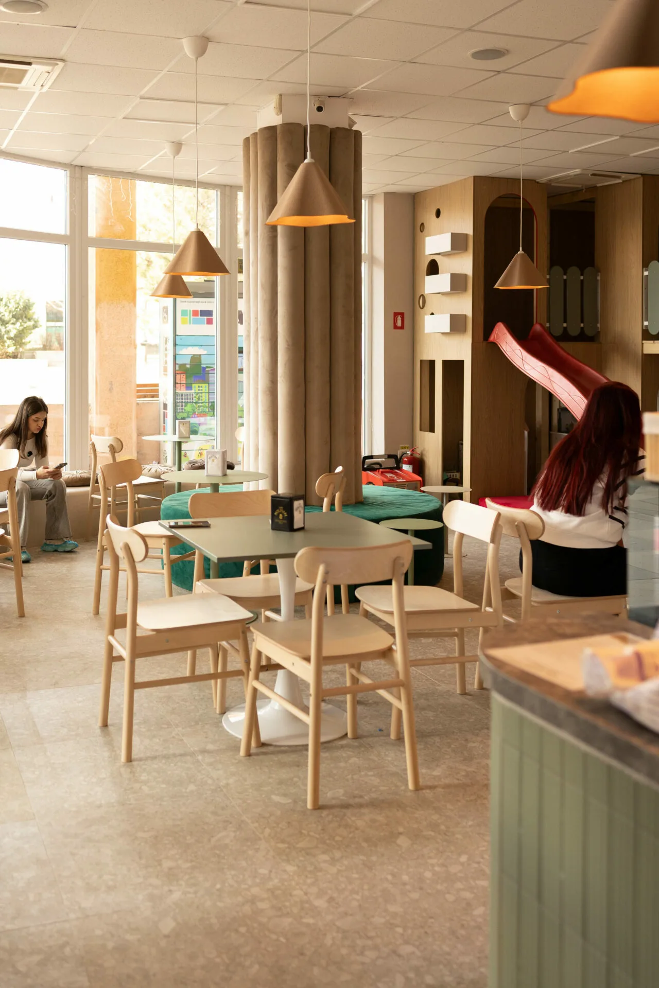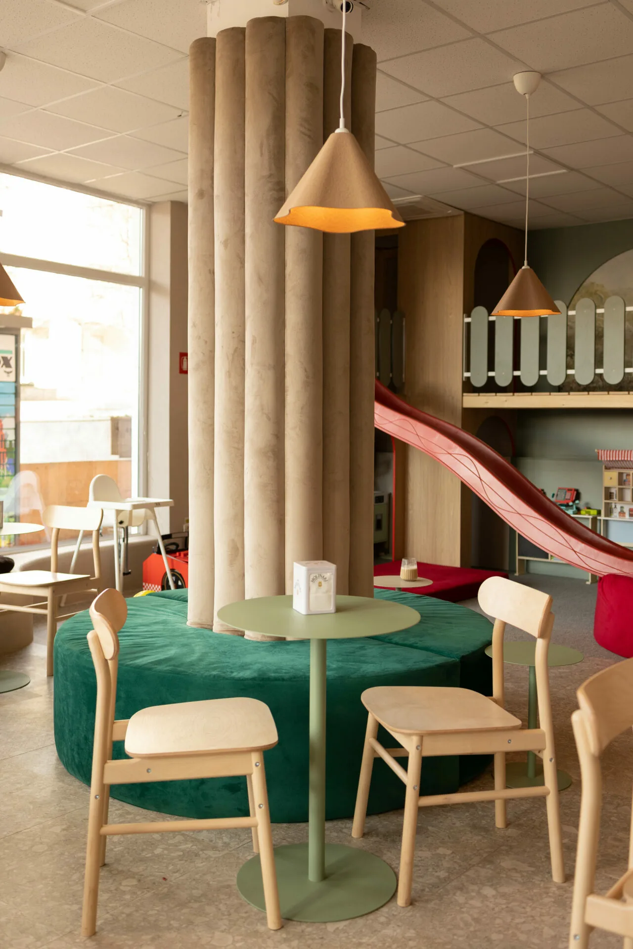 Proiectul NIDO cafe realizat de LOOM ce a luat viață într-un timp record, cu un buget redus, într-un spațiu care a avut nevoie de o renovare și o recompartimentare completă. Conceptul a fost gândit în așa fel încât părinții să aibă vizibilitate asupra spațiului de joacă din orice punct al cafenelei. Am profitat astfel de geometria curbată a peretelui exterior și ne-am folosit de elementul structural central pentru a crea zonele de servire pentru vizitatori.