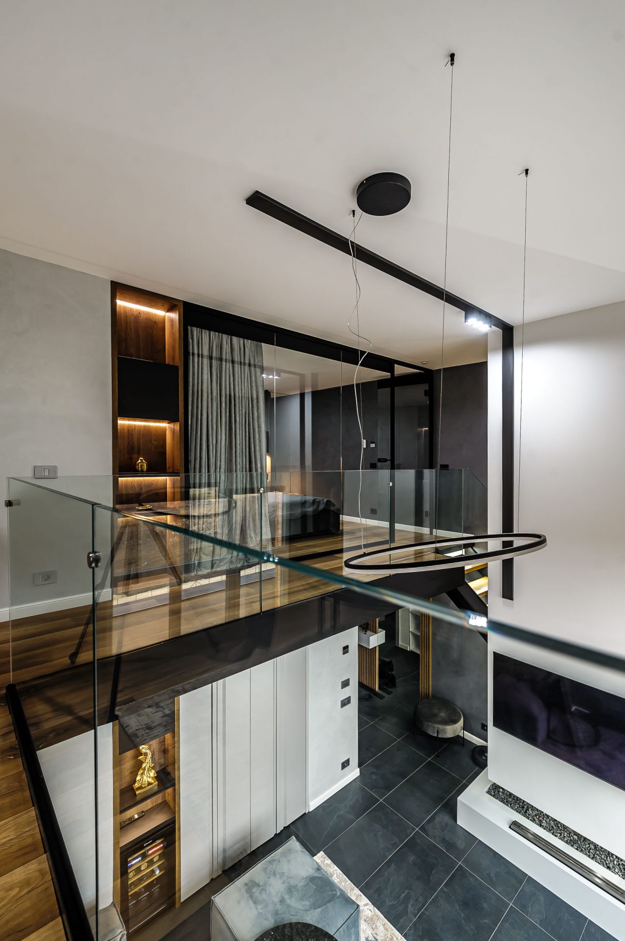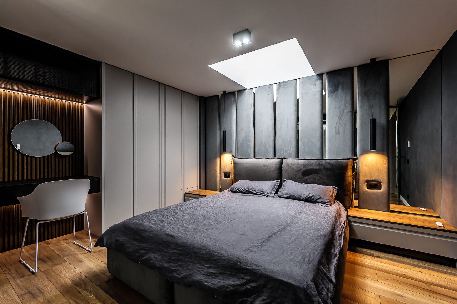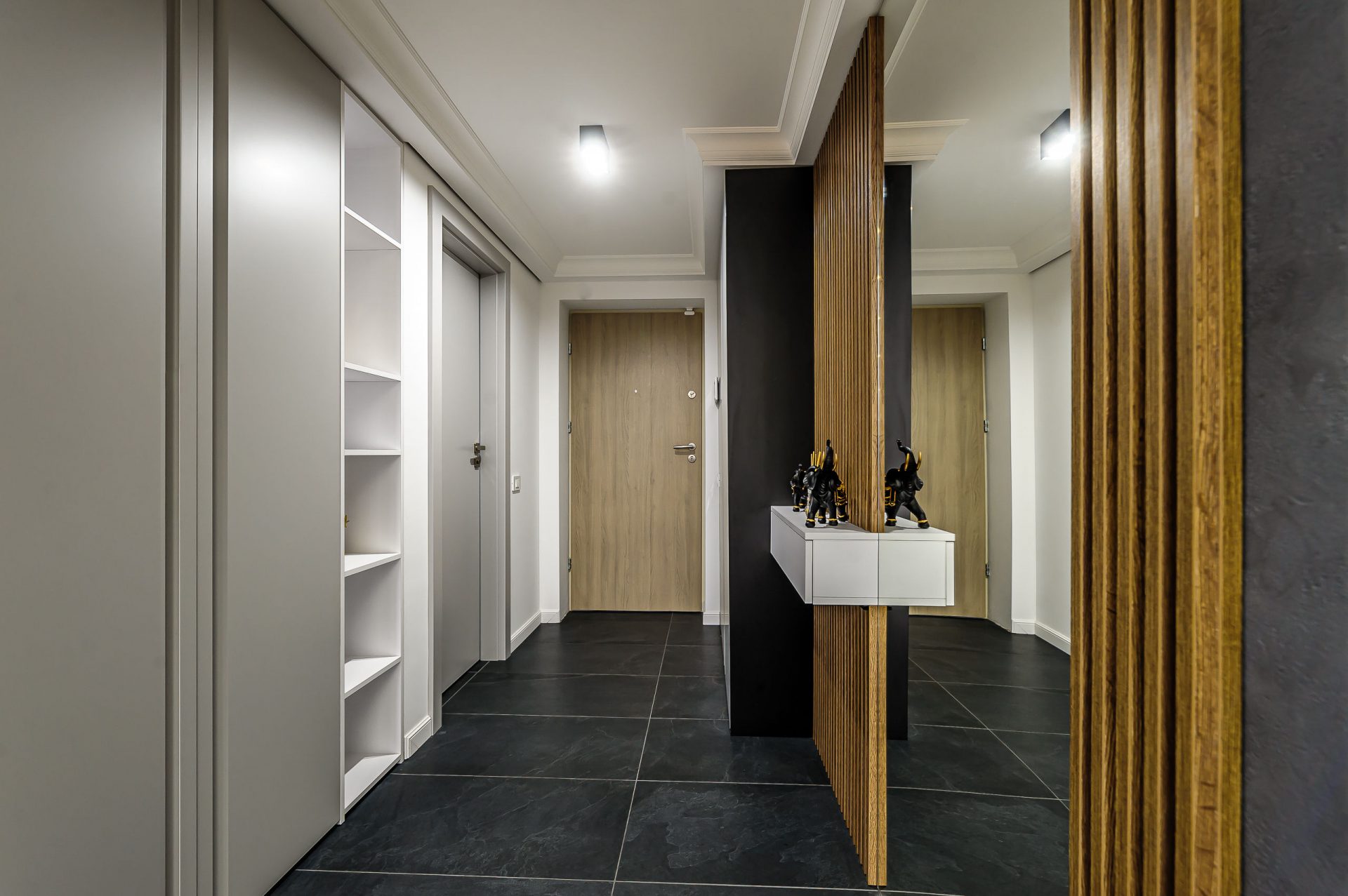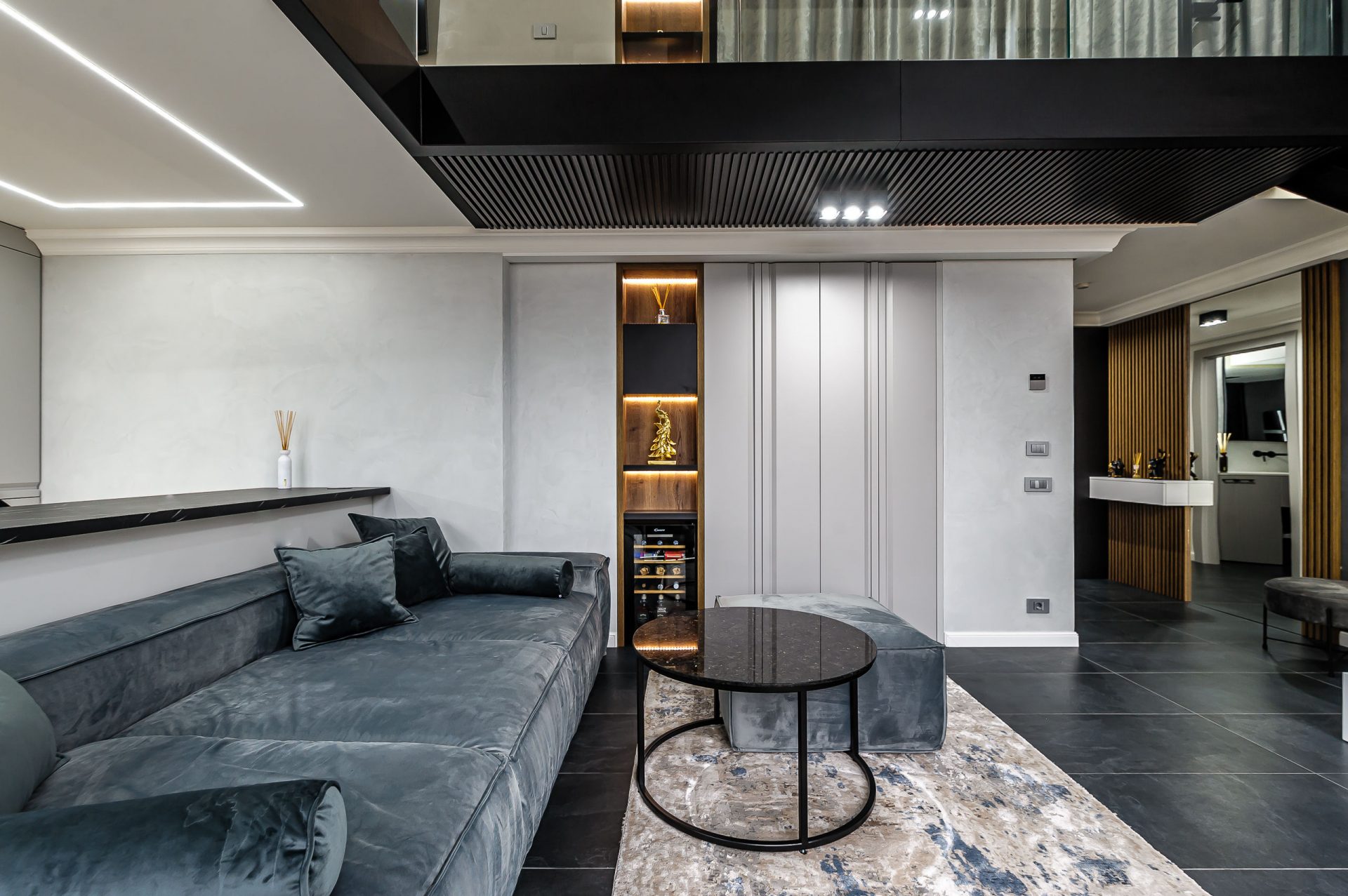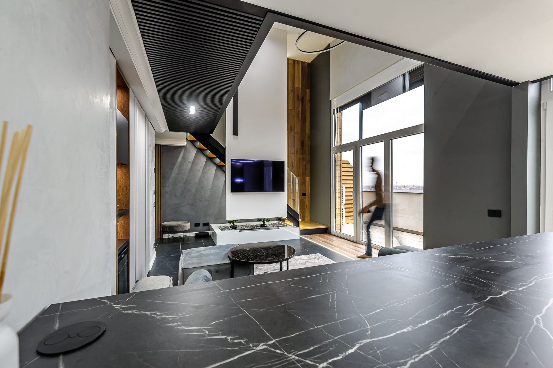 Dorinta clientului a fost de a obtine un apartament atat practic cat si foarte estetic, spre stilul luxury modern masculin. Dorinta a fost de a avea o amenajare de penthouse cu un contrast puternic intre antracit si negru. Pentru asta, arhitectii au delimitat pardoseala cu o lumina led, care marcheaza zonele de circulatie, alternand intre texturile din lemn si texturile antracit – pe pardoseala o gresie aspect ardezie si pe perete o tencuiala decorativa.