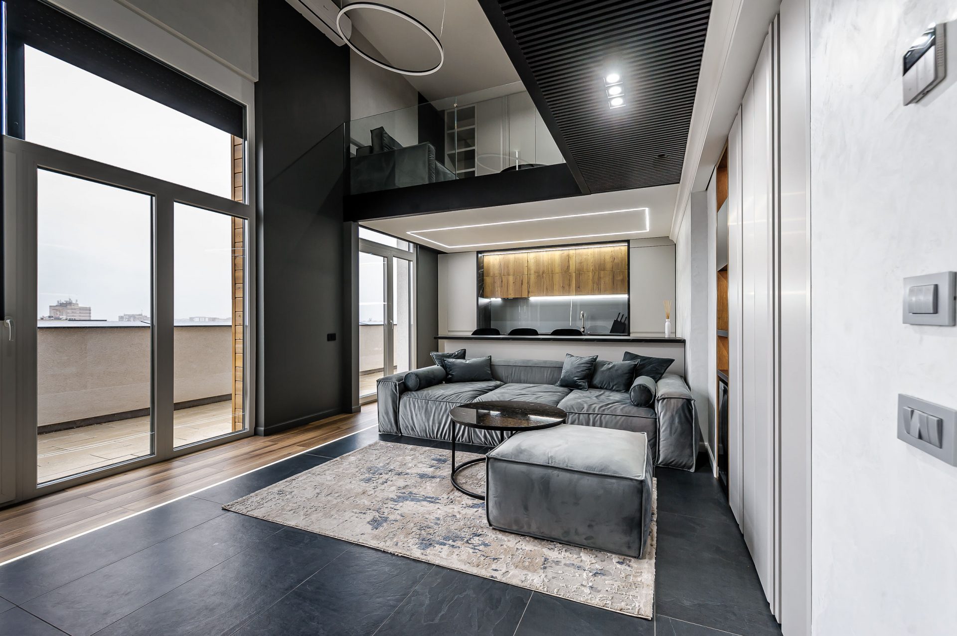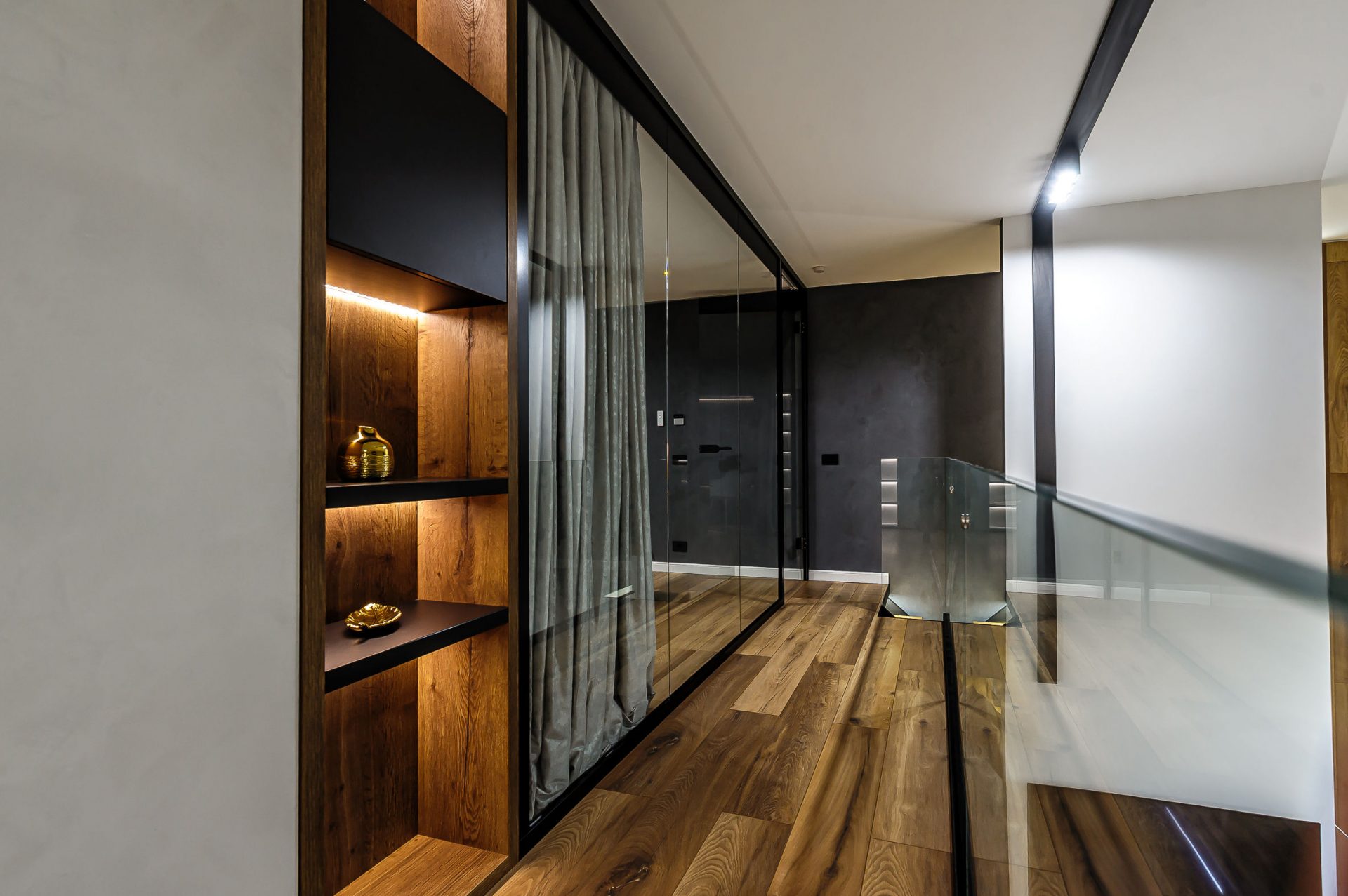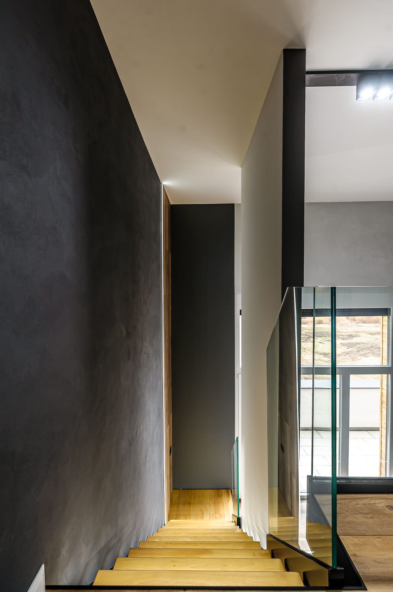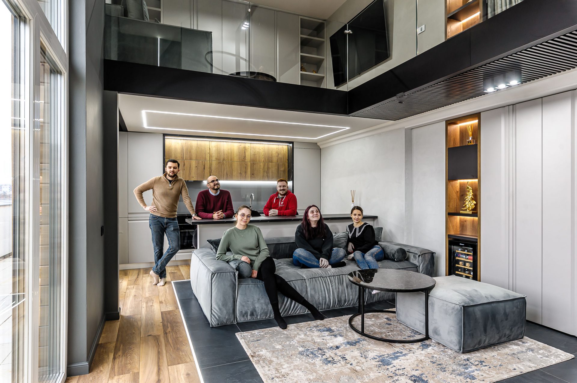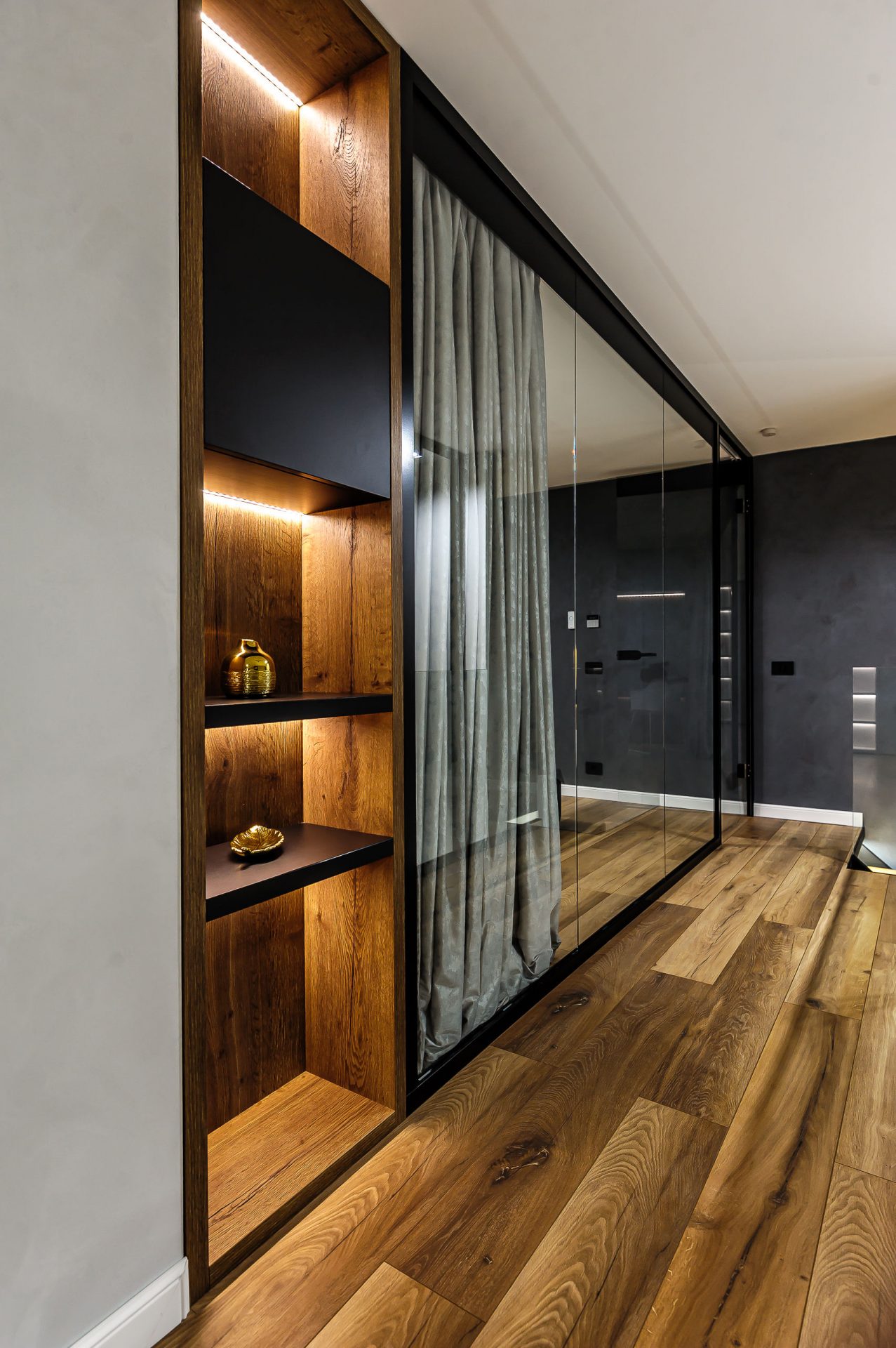 Dorinta clientului a fost de a obtine un apartament atat practic cat si foarte estetic, spre stilul luxury modern masculin. Dorinta a fost de a avea o amenajare de penthouse cu un contrast puternic intre antracit si negru. Pentru asta, arhitectii au delimitat pardoseala cu o lumina led, care marcheaza zonele de circulatie, alternand intre texturile din lemn si texturile antracit – pe pardoseala o gresie aspect ardezie si pe perete o tencuiala decorativa.