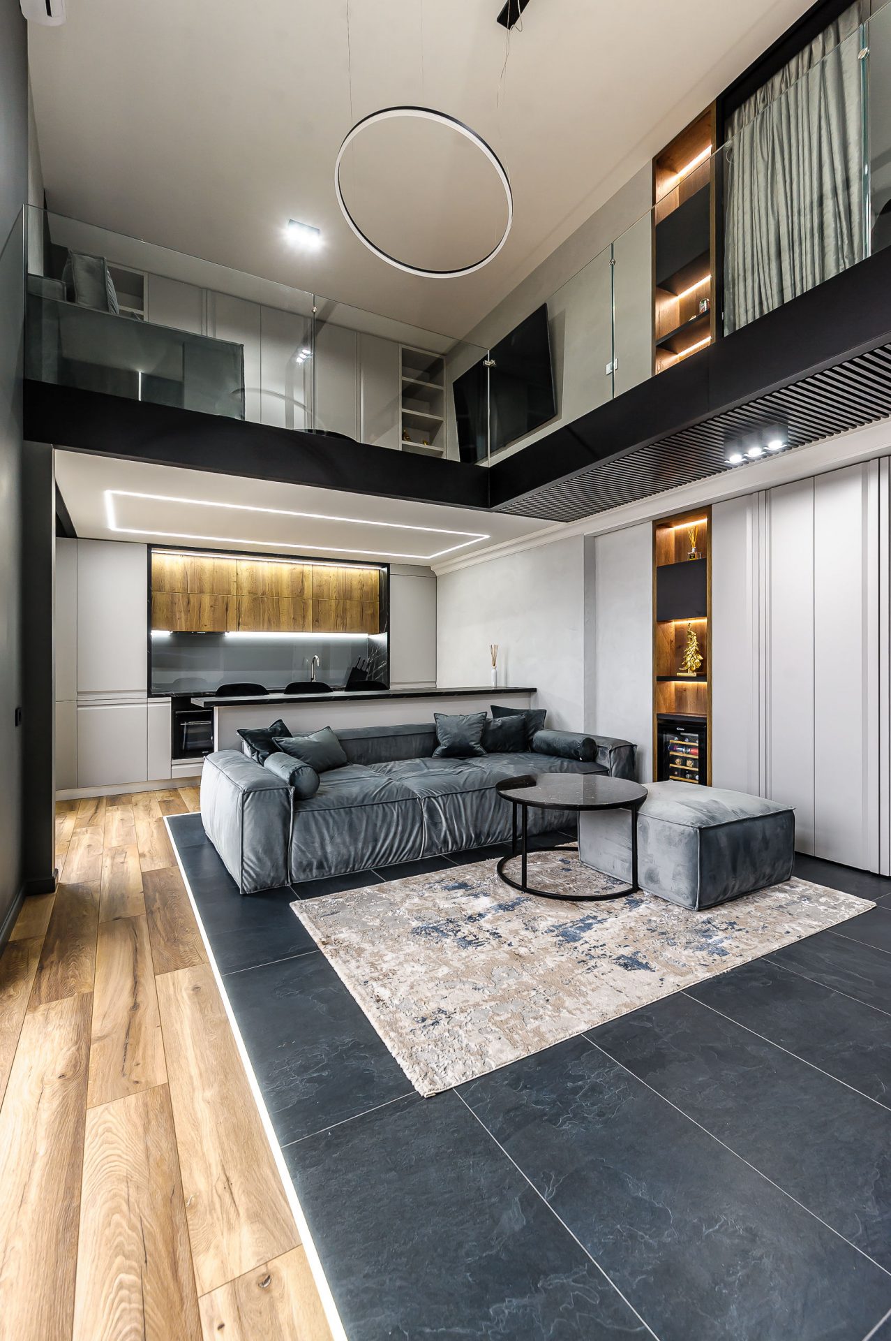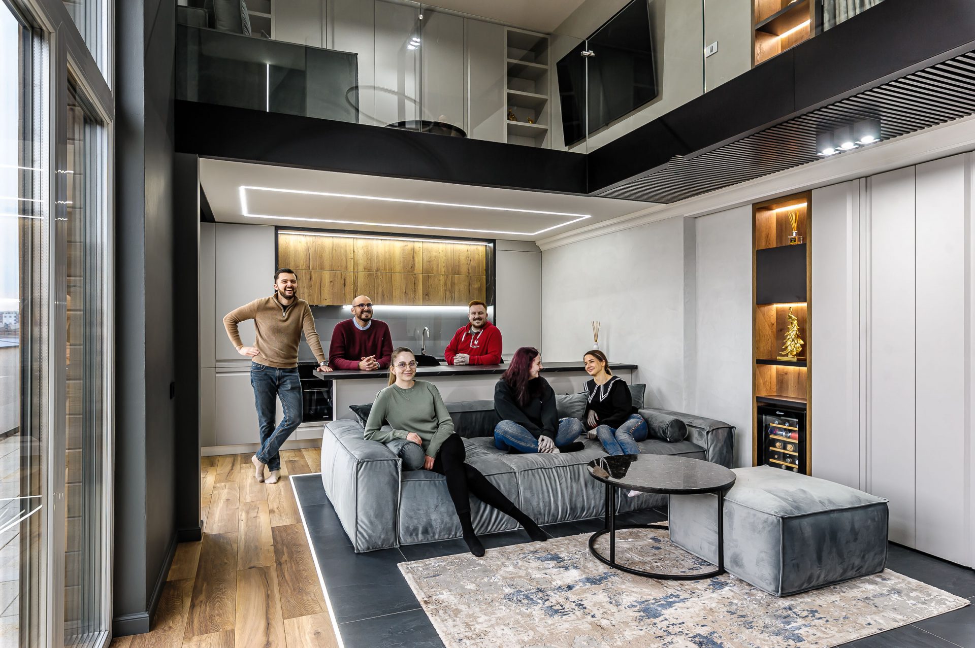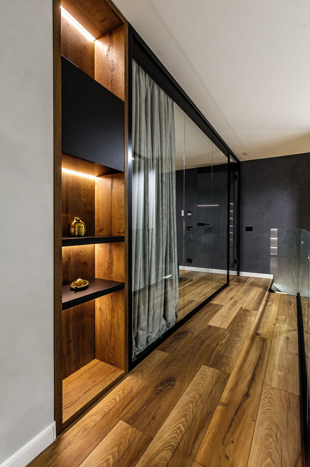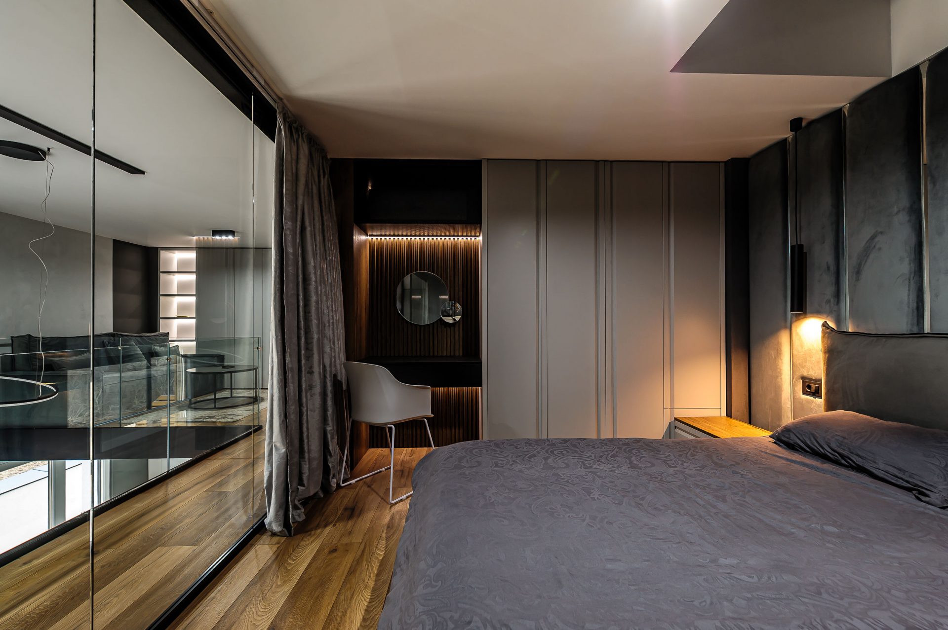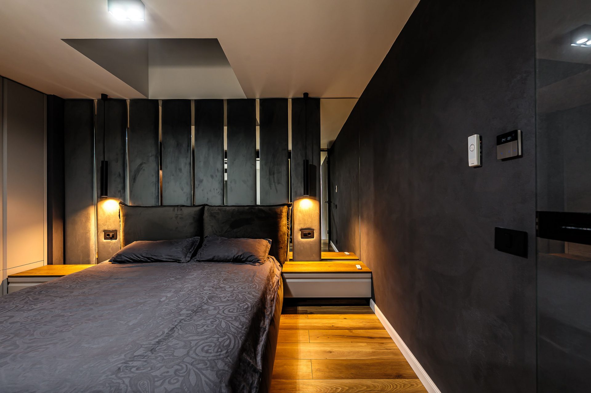 Dorinta clientului a fost de a obtine un apartament atat practic cat si foarte estetic, spre stilul luxury modern masculin. Dorinta a fost de a avea o amenajare de penthouse cu un contrast puternic intre antracit si negru. Pentru asta, arhitectii au delimitat pardoseala cu o lumina led, care marcheaza zonele de circulatie, alternand intre texturile din lemn si texturile antracit – pe pardoseala o gresie aspect ardezie si pe perete o tencuiala decorativa.