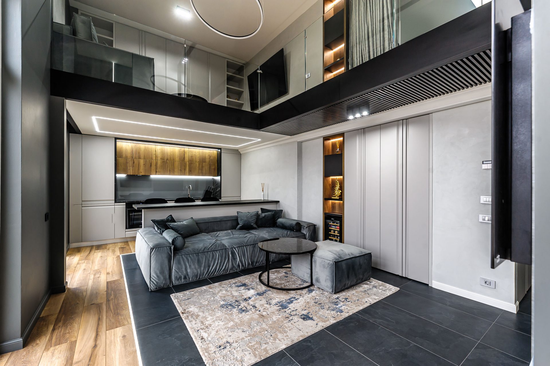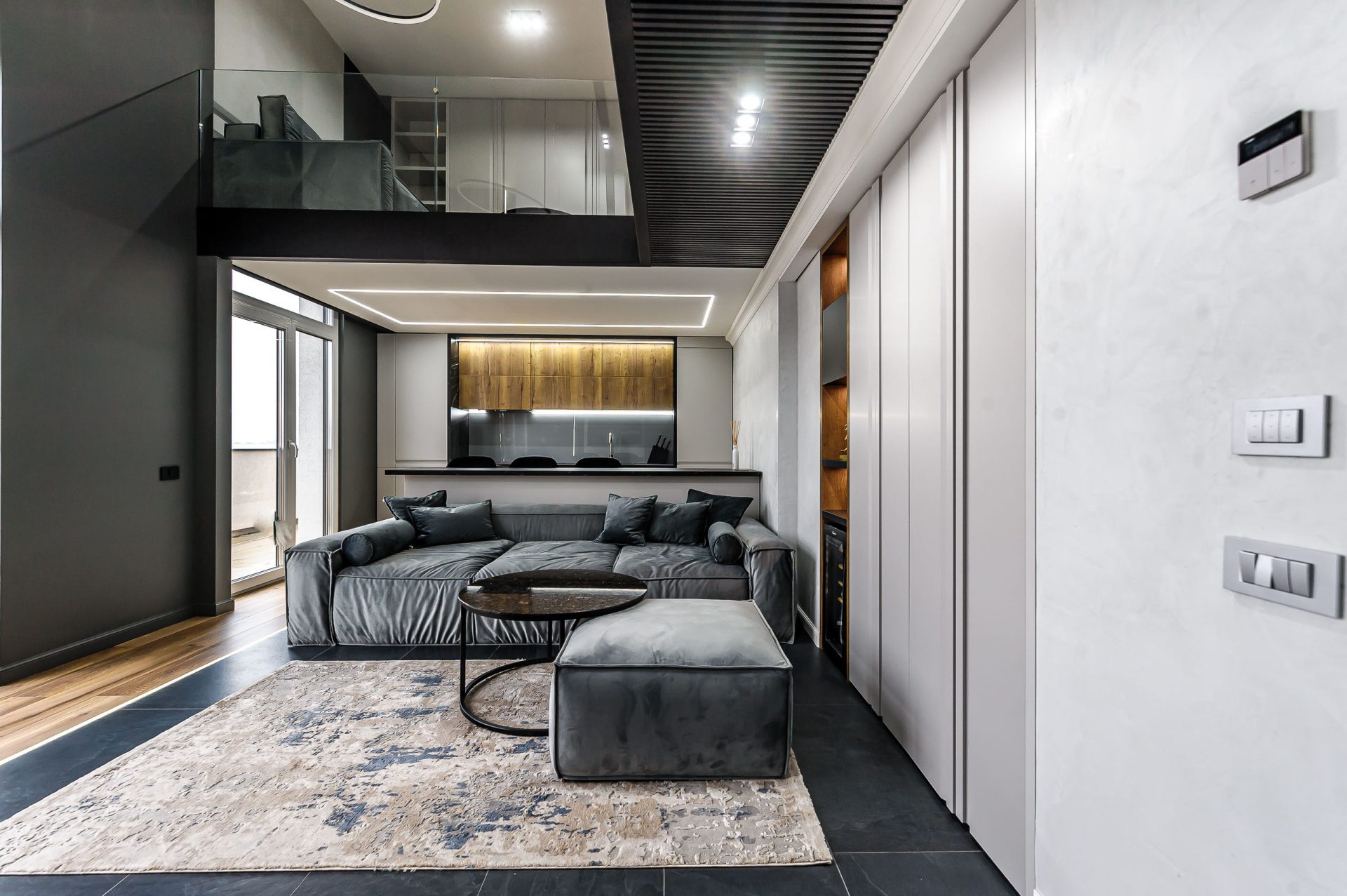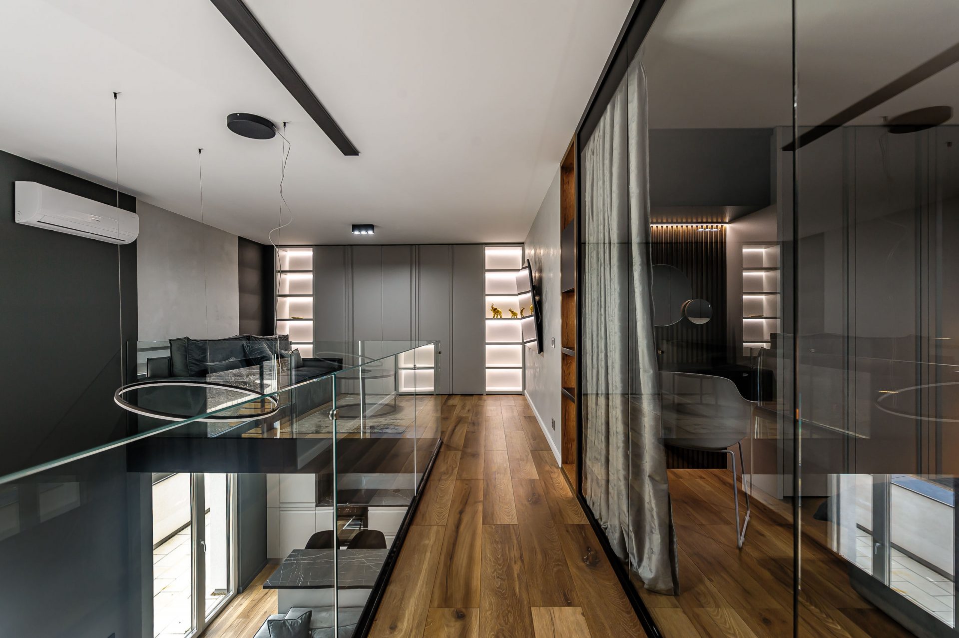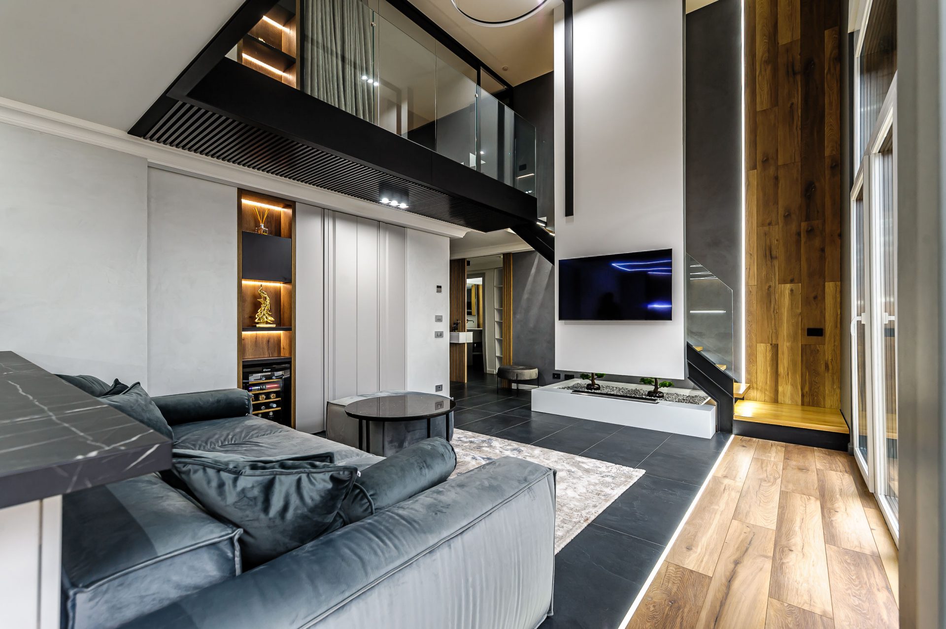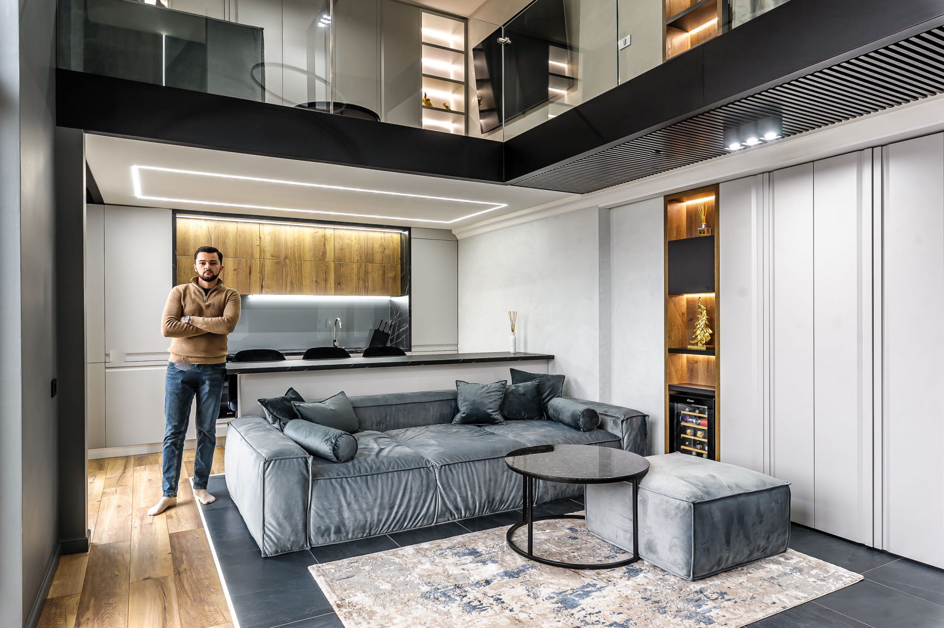 Dorinta clientului a fost de a obtine un apartament atat practic cat si foarte estetic, spre stilul luxury modern masculin. Dorinta a fost de a avea o amenajare de penthouse cu un contrast puternic intre antracit si negru. Pentru asta, arhitectii au delimitat pardoseala cu o lumina led, care marcheaza zonele de circulatie, alternand intre texturile din lemn si texturile antracit – pe pardoseala o gresie aspect ardezie si pe perete o tencuiala decorativa.