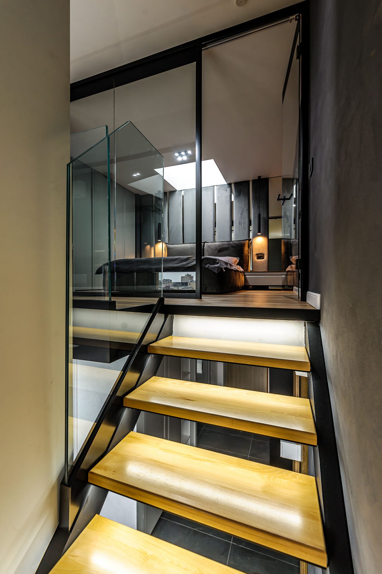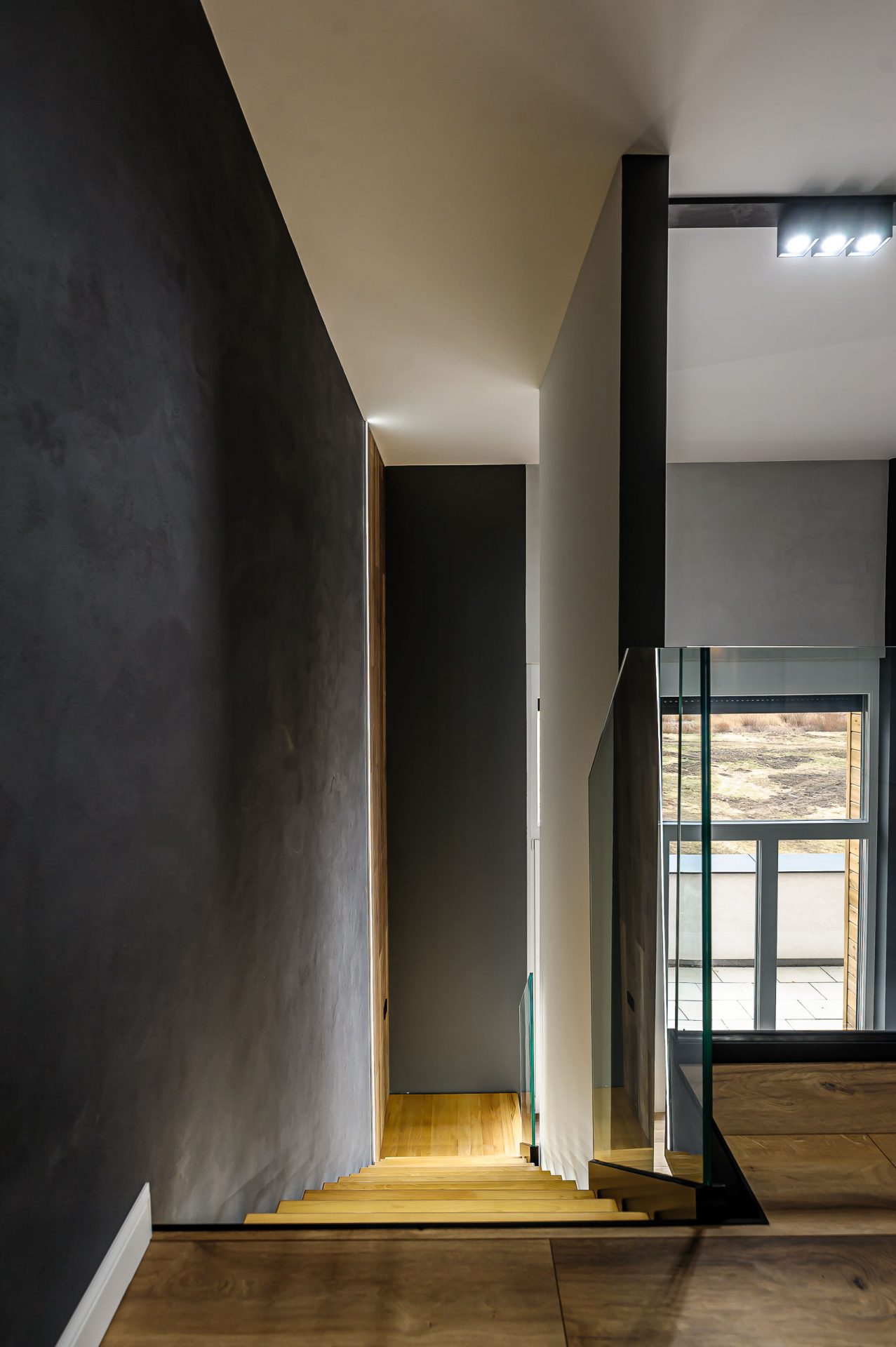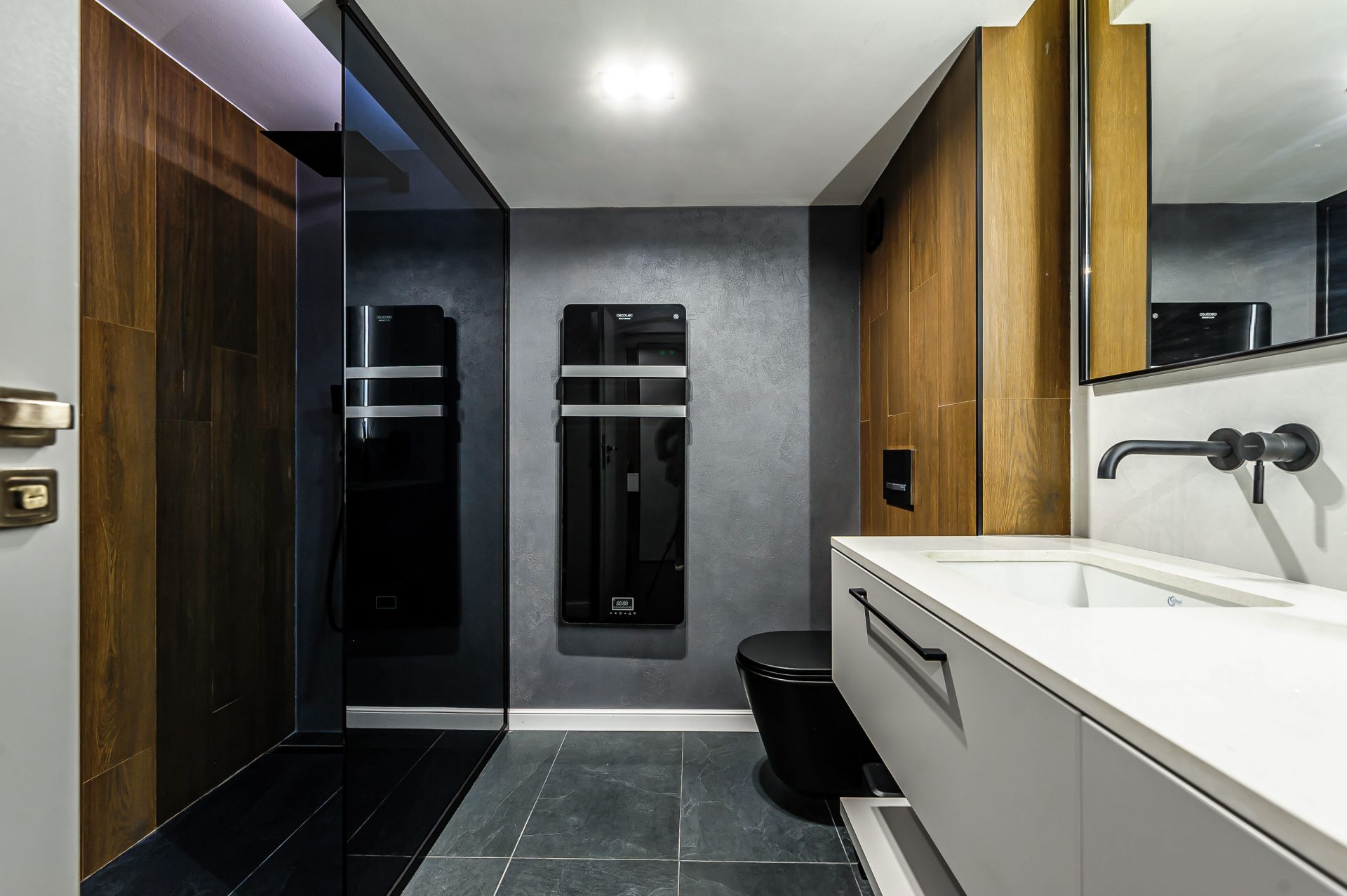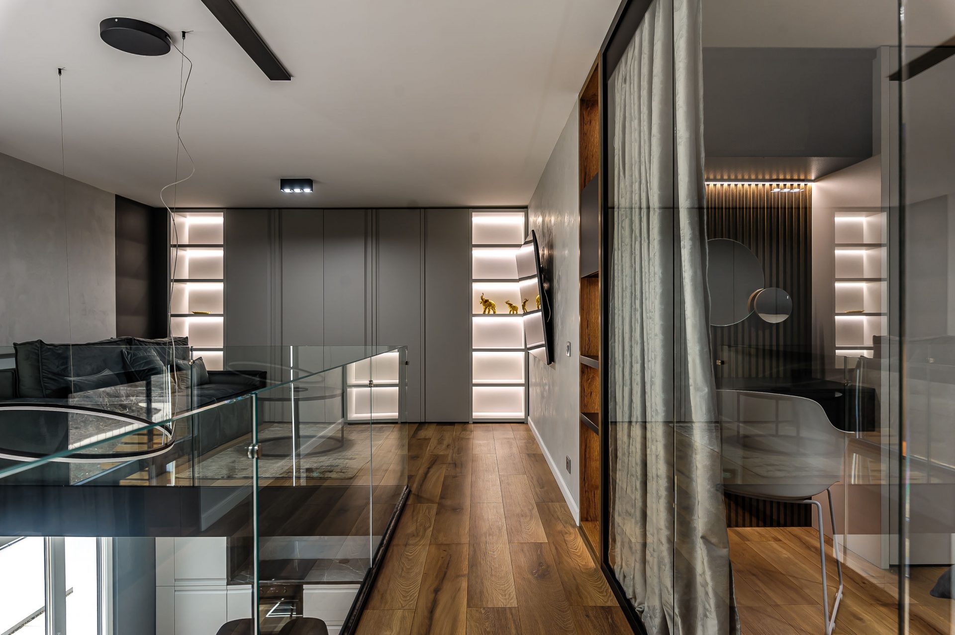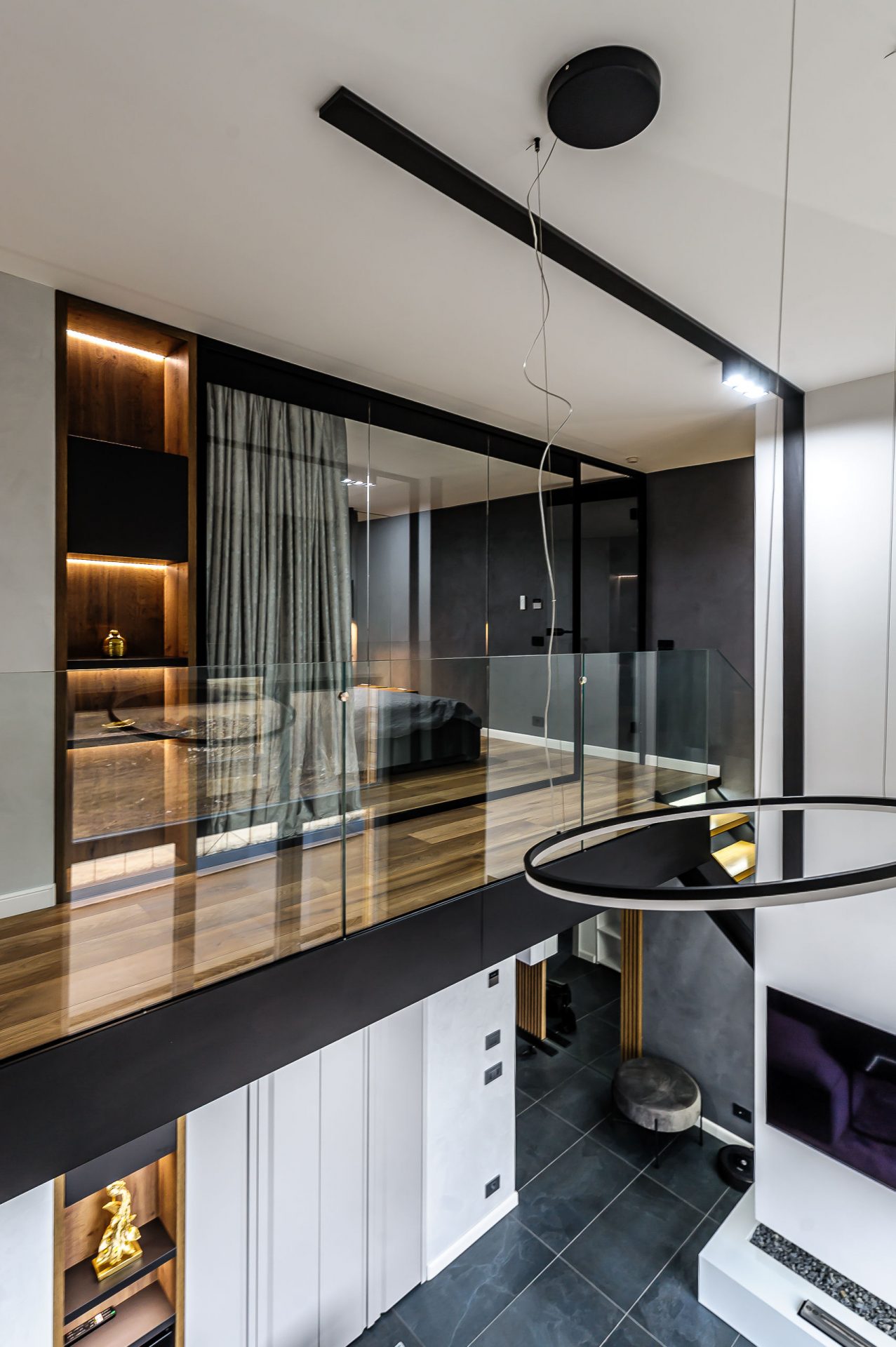 Dorinta clientului a fost de a obtine un apartament atat practic cat si foarte estetic, spre stilul luxury modern masculin. Dorinta a fost de a avea o amenajare de penthouse cu un contrast puternic intre antracit si negru. Pentru asta, arhitectii au delimitat pardoseala cu o lumina led, care marcheaza zonele de circulatie, alternand intre texturile din lemn si texturile antracit – pe pardoseala o gresie aspect ardezie si pe perete o tencuiala decorativa.