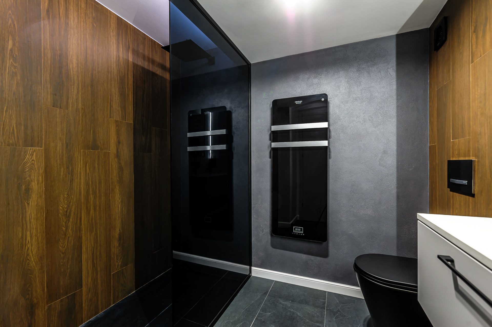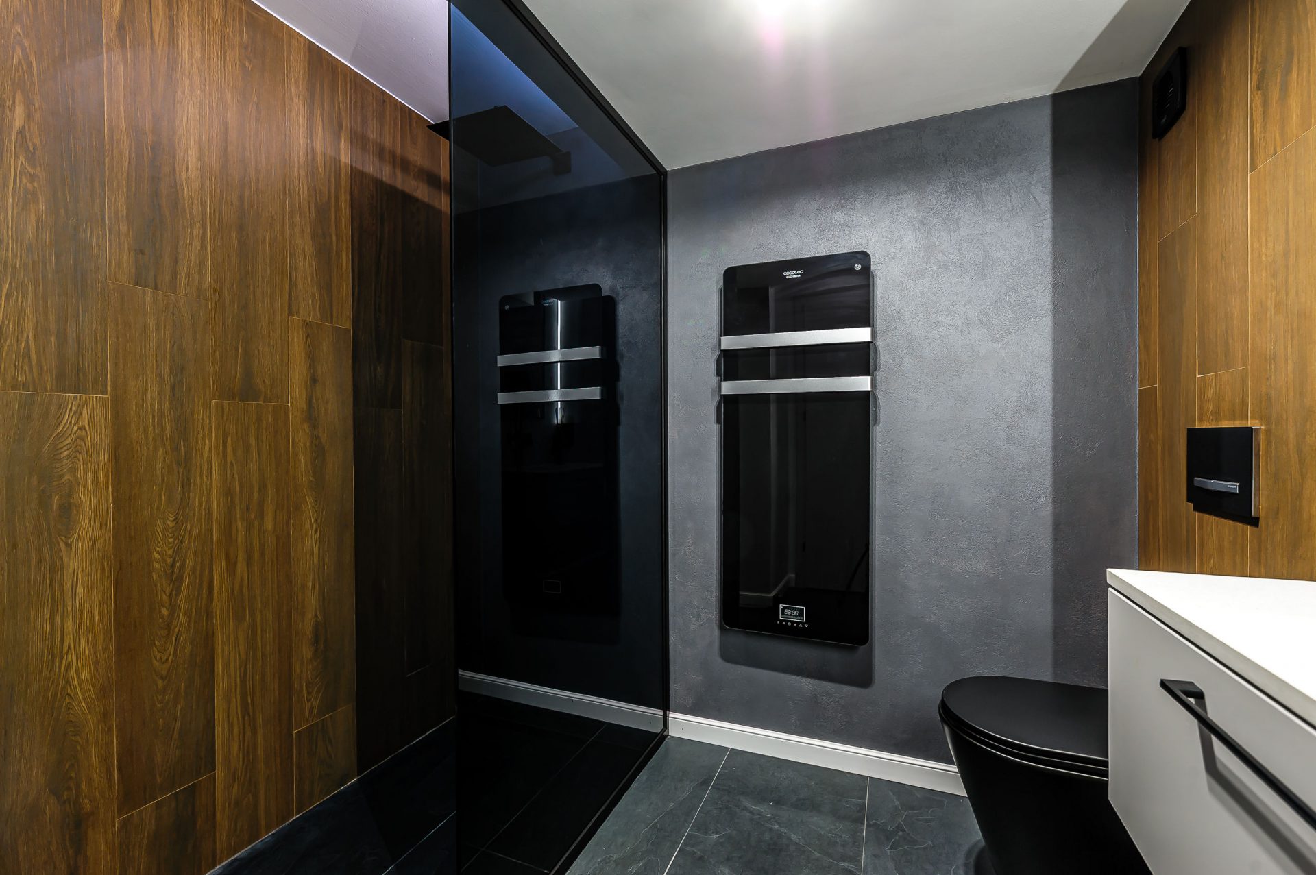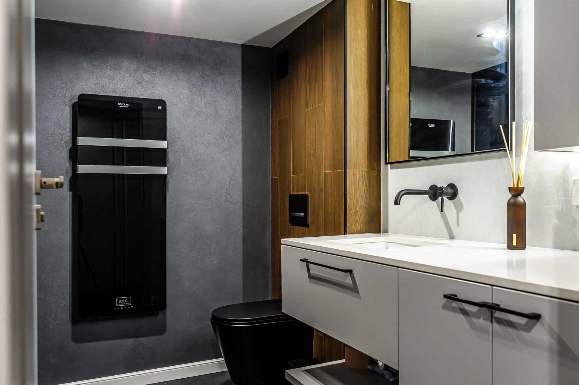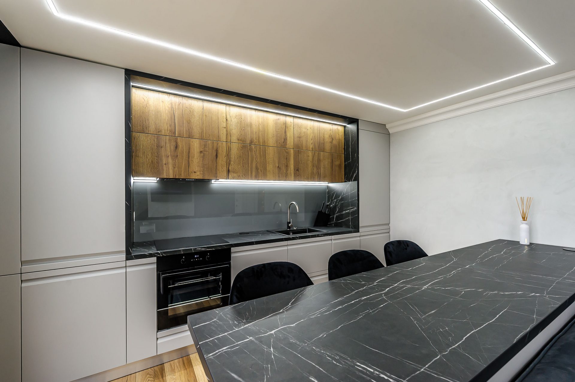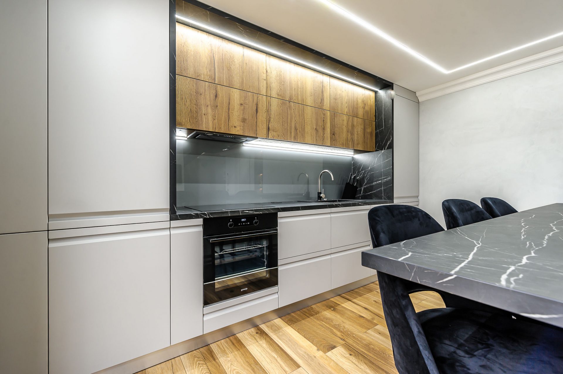 Dorinta clientului a fost de a obtine un apartament atat practic cat si foarte estetic, spre stilul luxury modern masculin. Dorinta a fost de a avea o amenajare de penthouse cu un contrast puternic intre antracit si negru. Pentru asta, arhitectii au delimitat pardoseala cu o lumina led, care marcheaza zonele de circulatie, alternand intre texturile din lemn si texturile antracit – pe pardoseala o gresie aspect ardezie si pe perete o tencuiala decorativa.