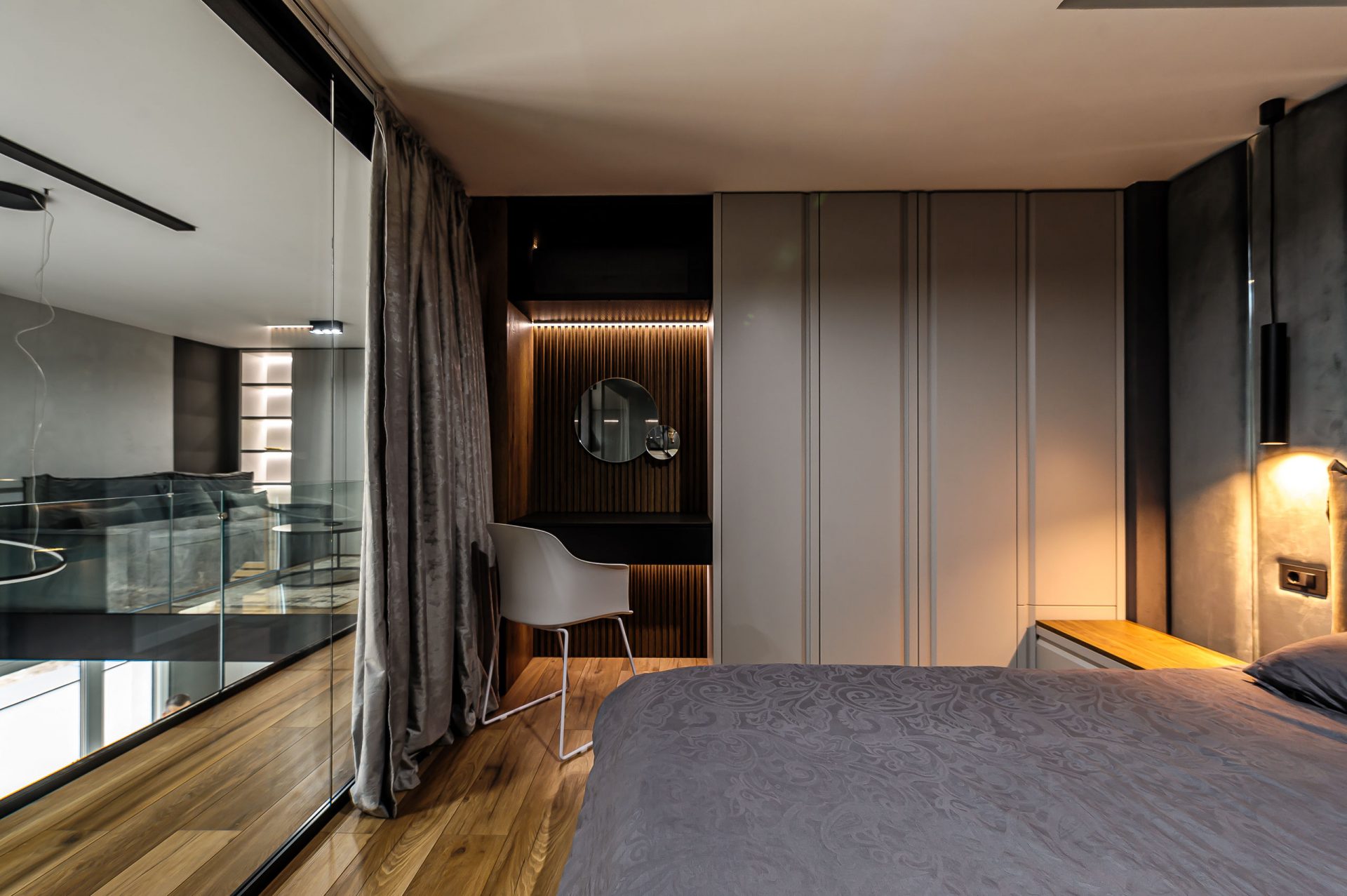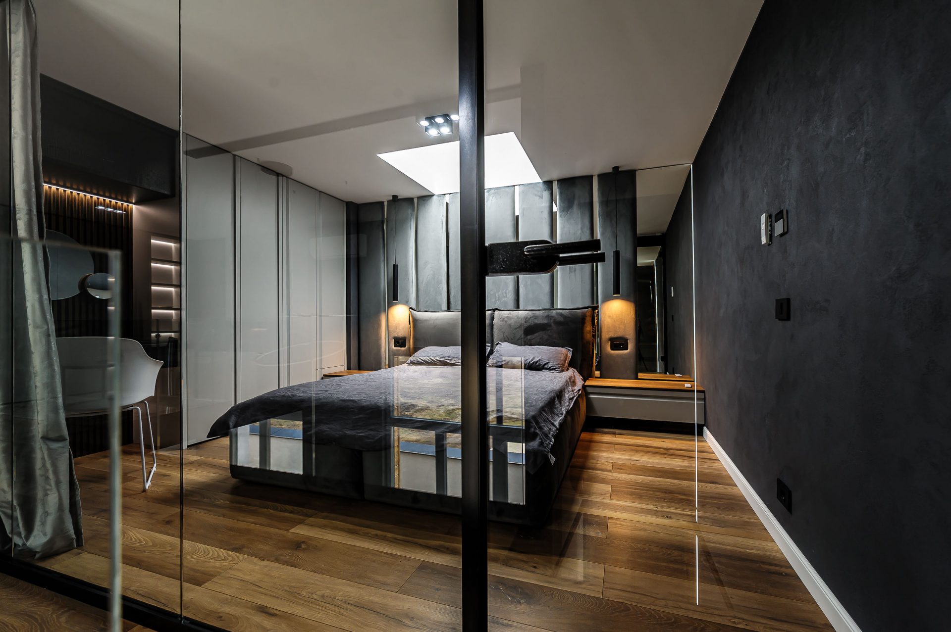 Dormitorul matrimonial este foarte practic, avand luminator in tavan cu rulou electric si deschidere/inchidere electrica. S-a dorit o legatura vizuala cu spatiul openspace, astfel s-a renuntat la un perete si a fost inlocuit cu sticla. Draperia electrica reda intimitate dormitorului.