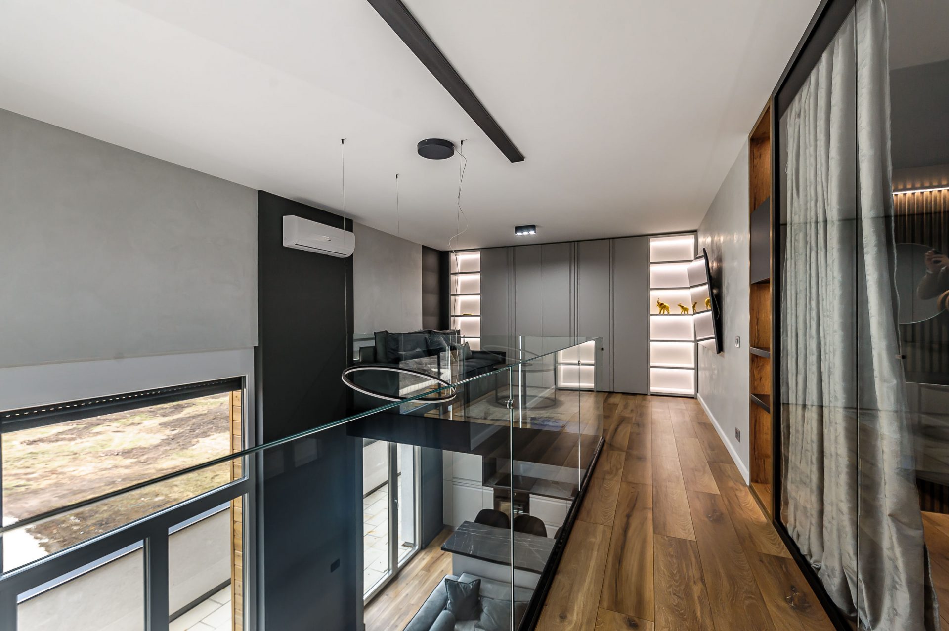 Spatiul secundar de la etaj are rol de spatiu de relaxare, vizionare TV, inainte de somn. Beneficiarul nu a dorit un dormitor cu TV insa a dorit un televizor mare pentru vizionare filme impreuna cu partenera, iar in living-room nu a fost posibila montarea unui televizor foarte mare.