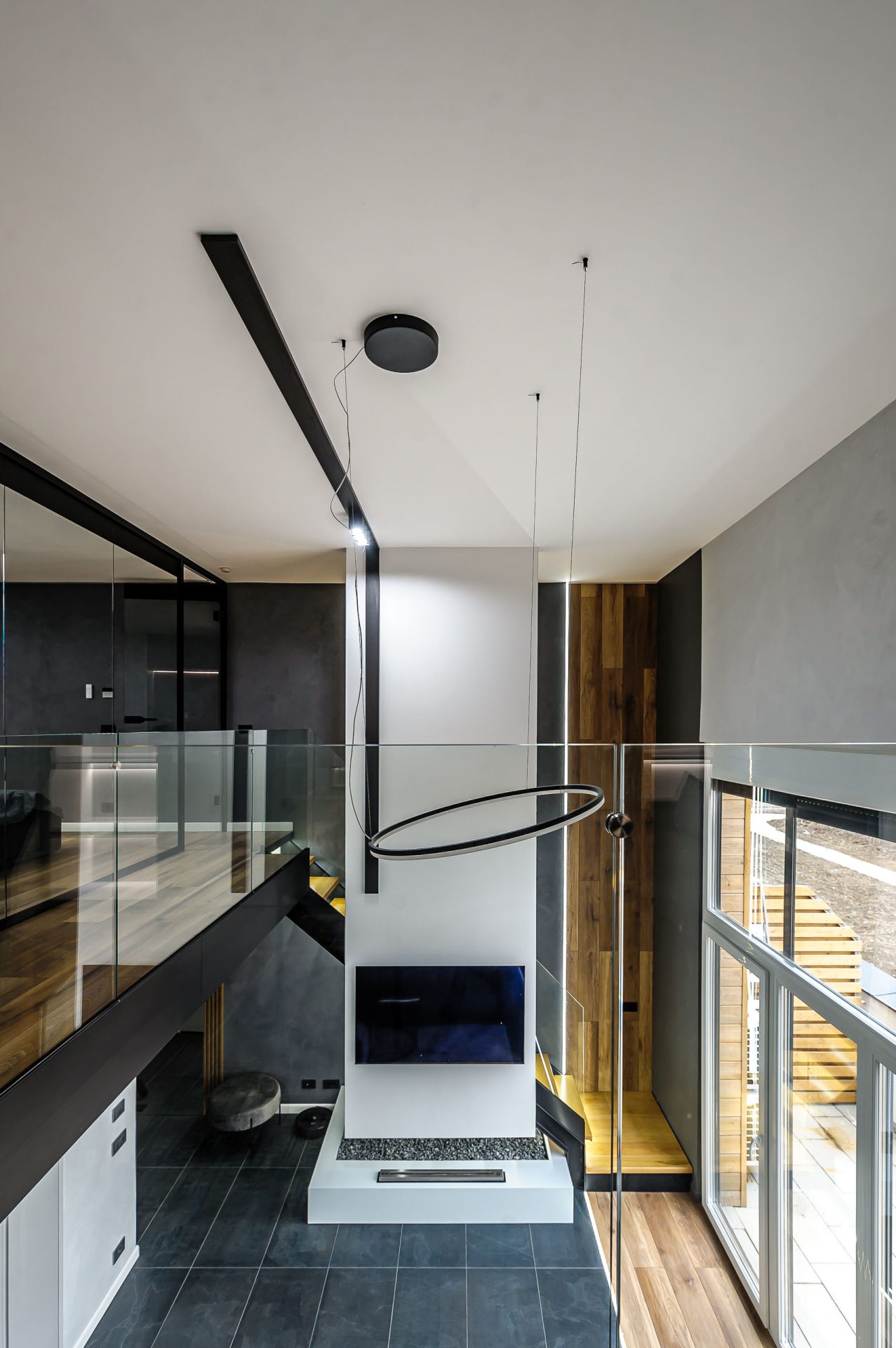 Pozitionarea televizorului a fost provocarea principala intrucat beneficiarul a dorit sa vada de pe canapea atat afara cat si la televizor in acelasi timp. Astfel, s-a realizat un perete suspendat din tavan, sustinut de catre scara metalica. Sub acest perete avem un semineu cu bioetanol care ofera un efect foarte modern. Piesa metalica de sub casa scarii a fost realizata la comanda pentru a ingloba vegetatie artificiala + semineul cu bioetanol.