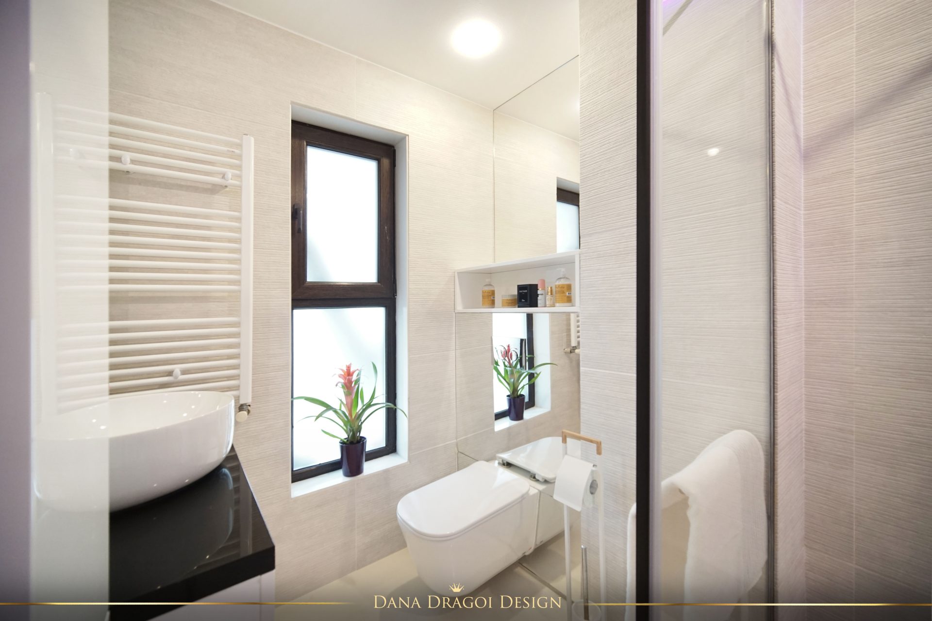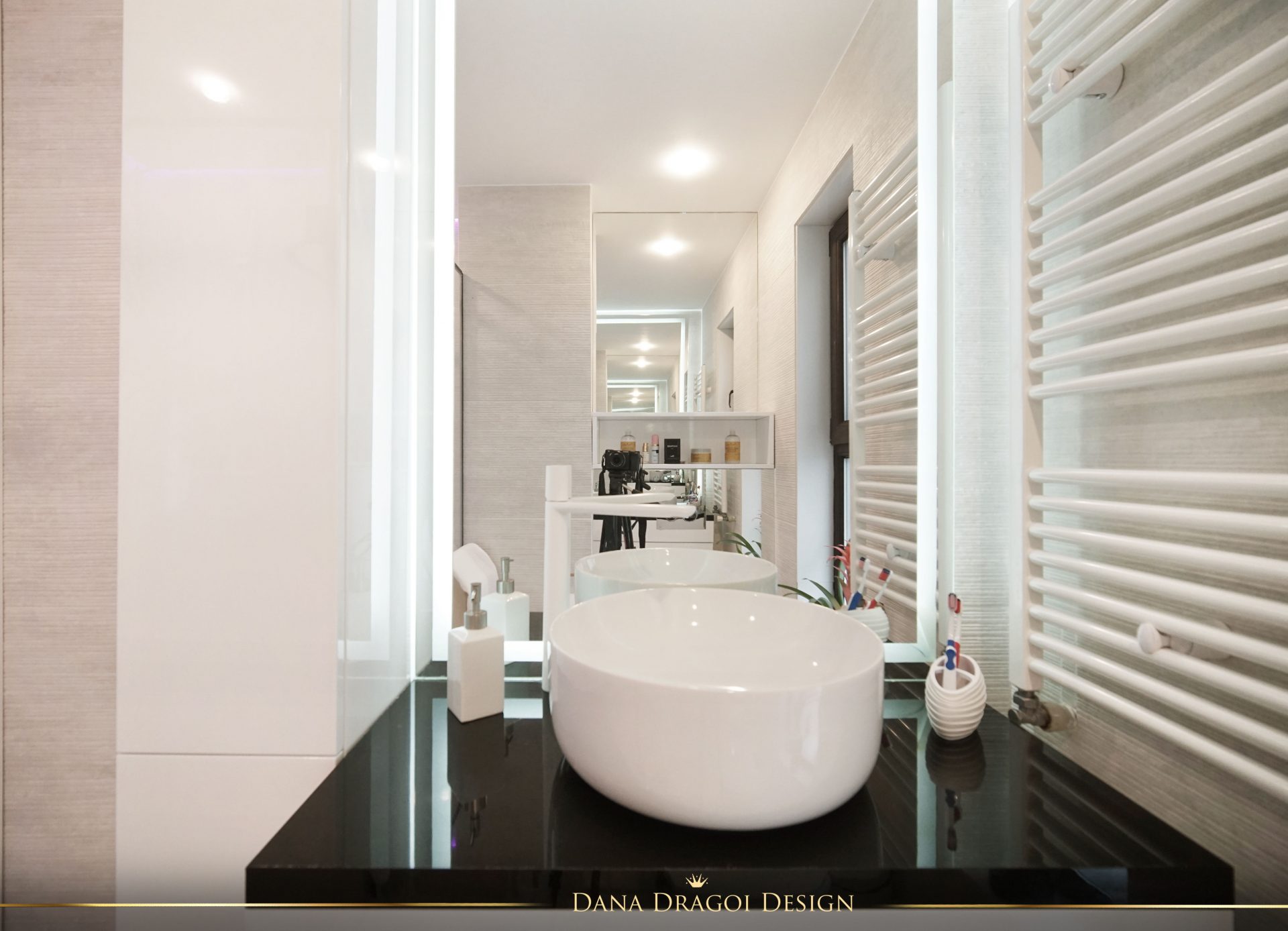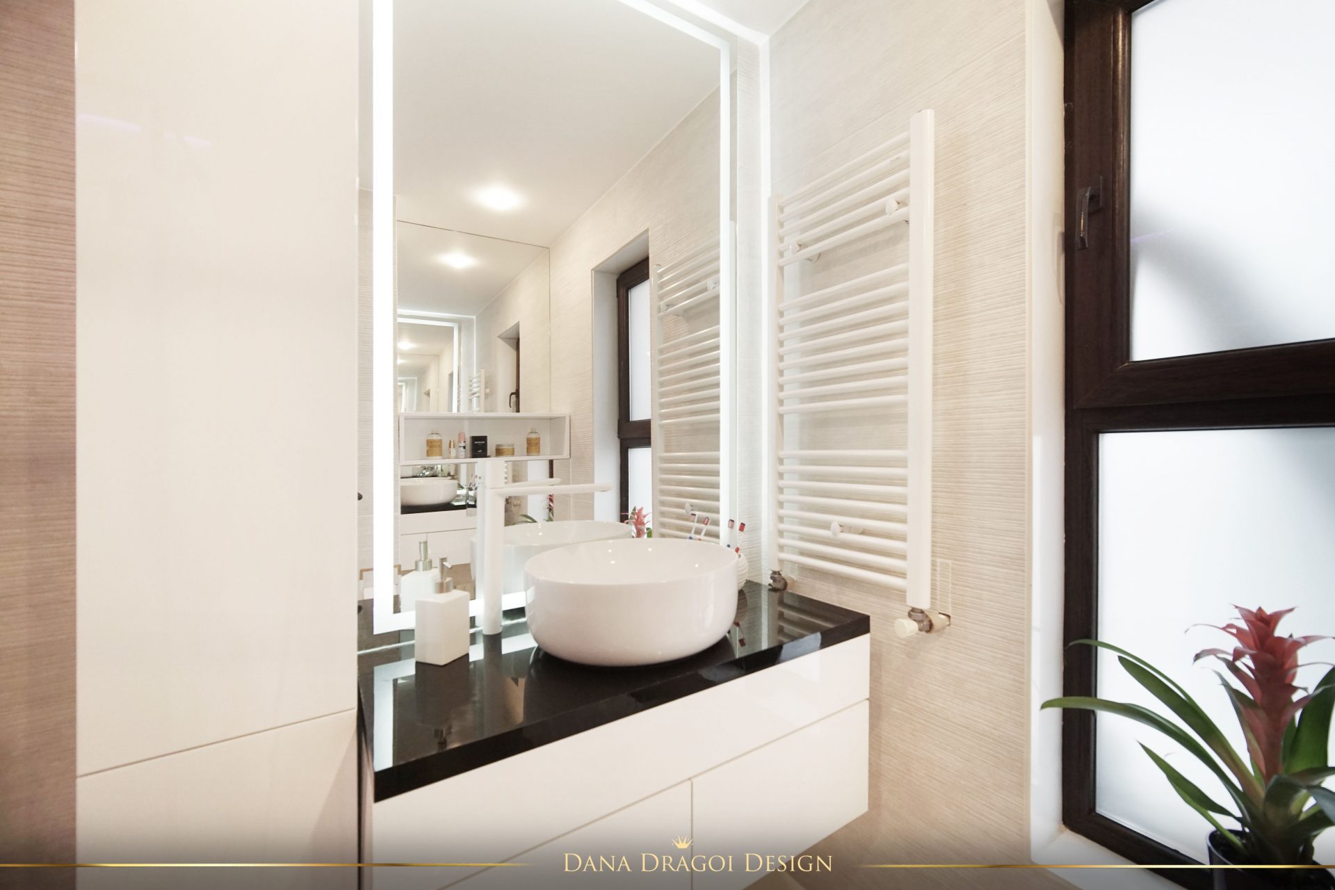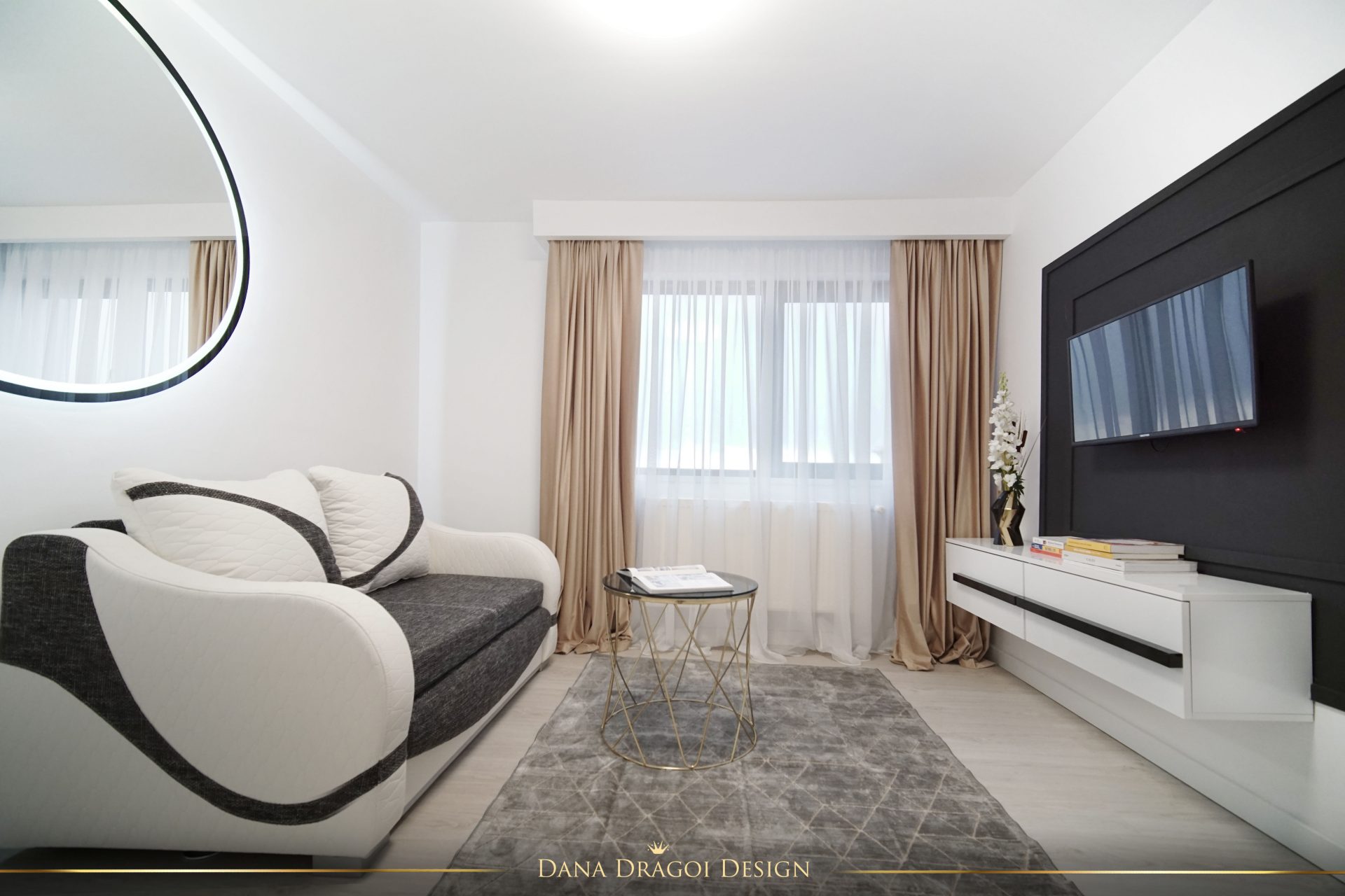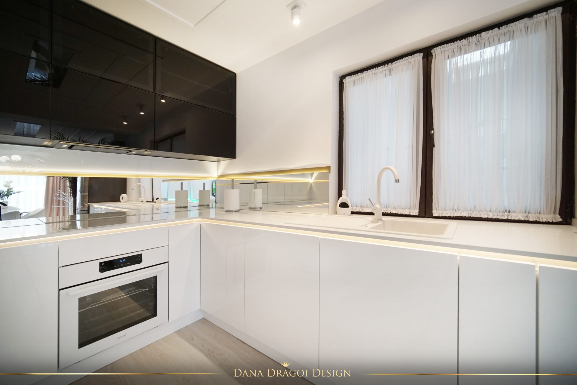 Fiind o casă de dimensiuni reduse și pe lungimi, și pe înălțimi, am transmis lumina naturală în profunzime, folosind alburi și oglinzi. Interioarele par mai mari și mai primitoare. Accentele de negru și auriu aduc masculinitate și prețiozitate într-un joc al contrastelor regăsit în fiecare cameră.