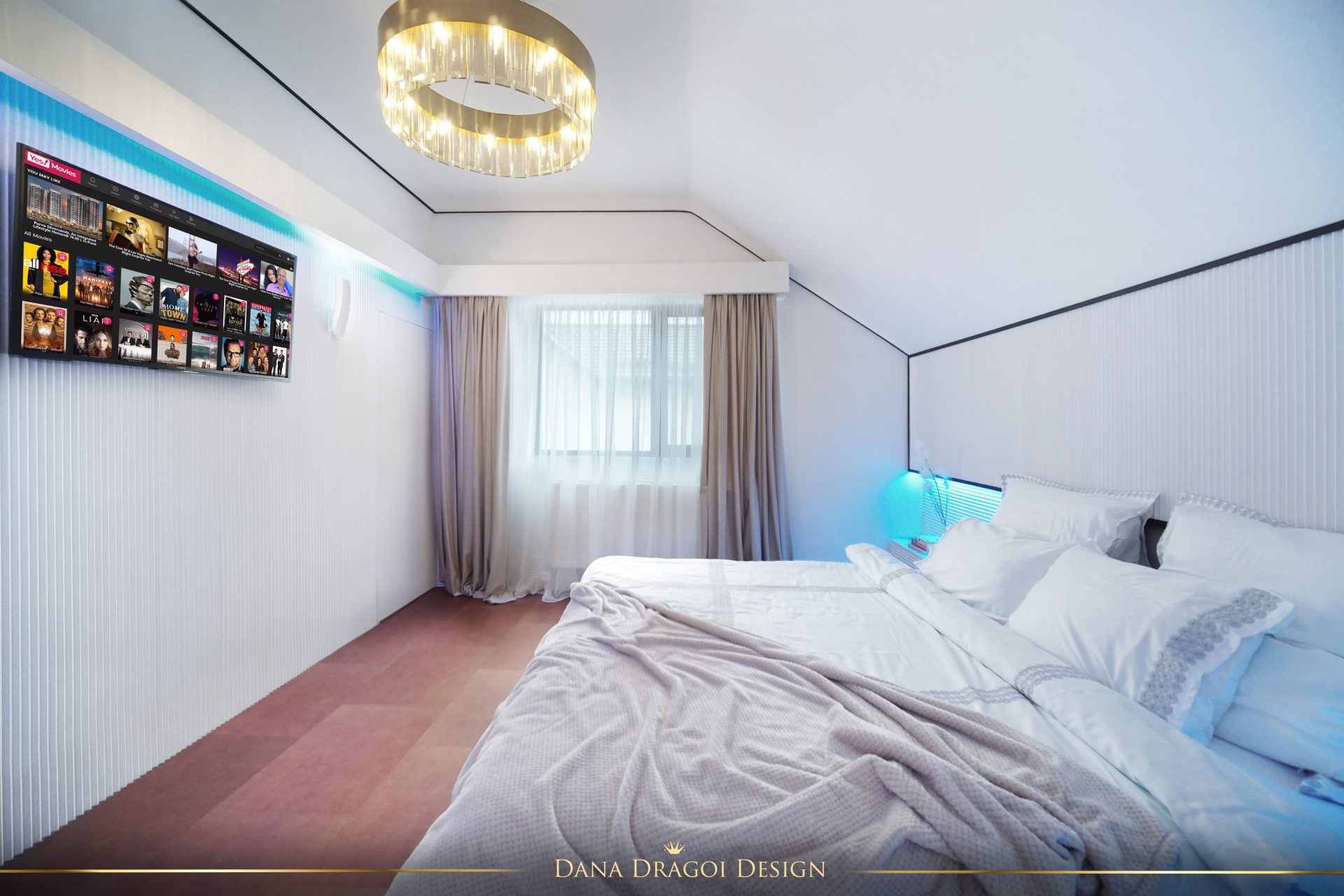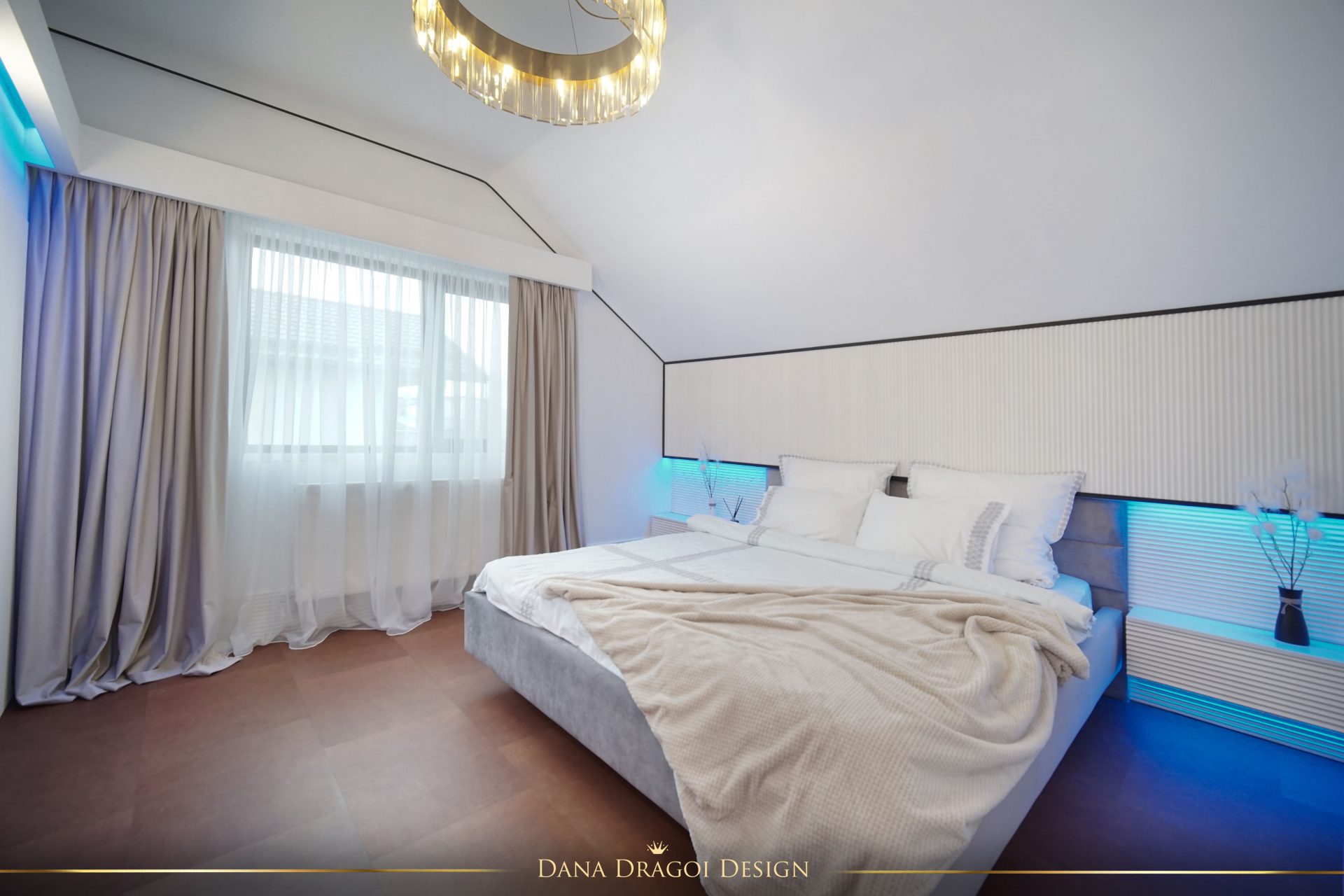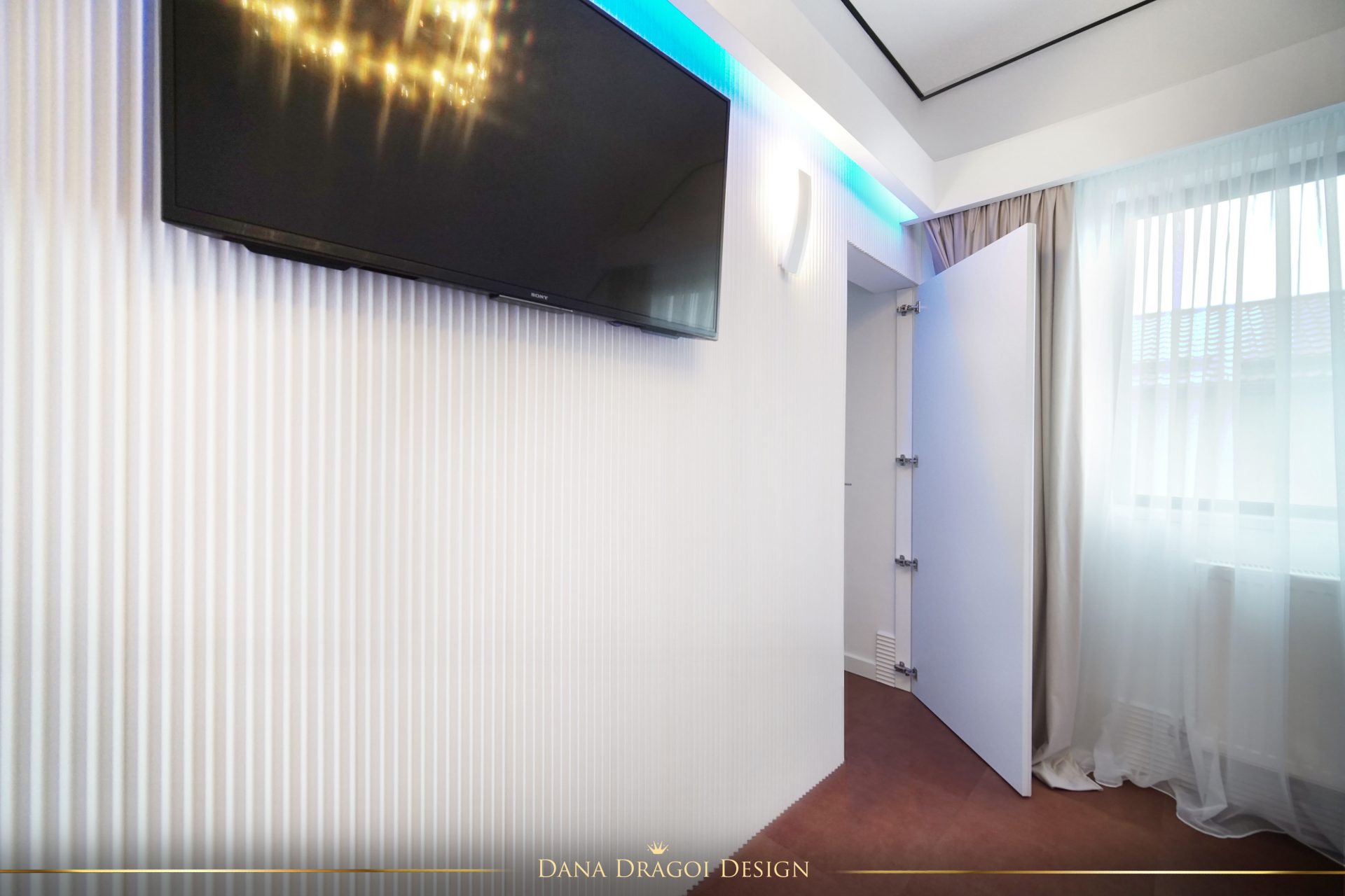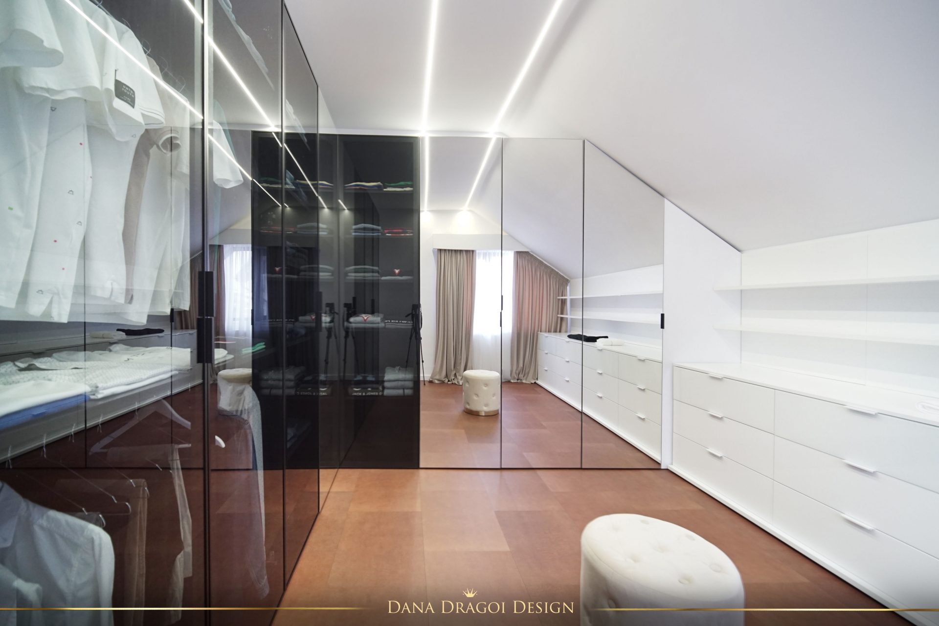 În dormitorul matrimonial și în dressing, la ferestre, am creat scafe cu capac fix superior, care să permită prinderea perdelelor și draperiilor.