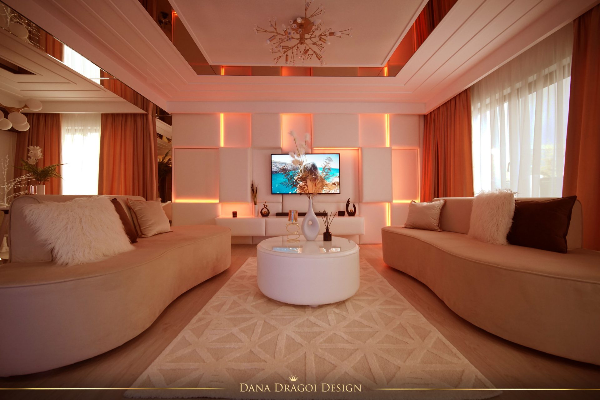 Exceptând canapeaua și măsuța cafea din camera oaspeților, masa și scaunele din dining, tot mobilierul și placările din casă au fost făcute integral pe comandă, din PAL, sticlă, MDF mat și lucios. Cu ajutorul desenelor și informațiilor necesare în completare pentru realizarea lor (culori, materiale, texturi, tapițerii, șamd.), alături de rezolvarea provocărilor spațiilor și ale necesităților beneficiarului, amenajarea a rezultat ca fiind confortabilă, unică, ferită de monotonie.
