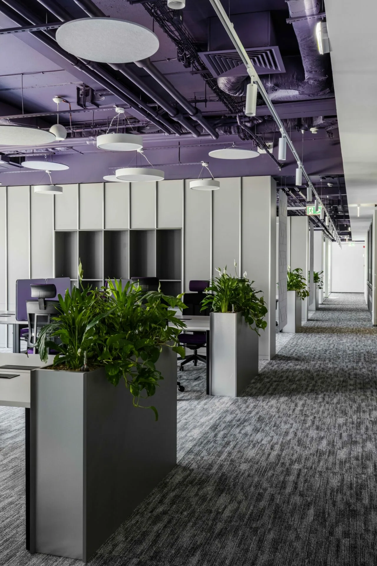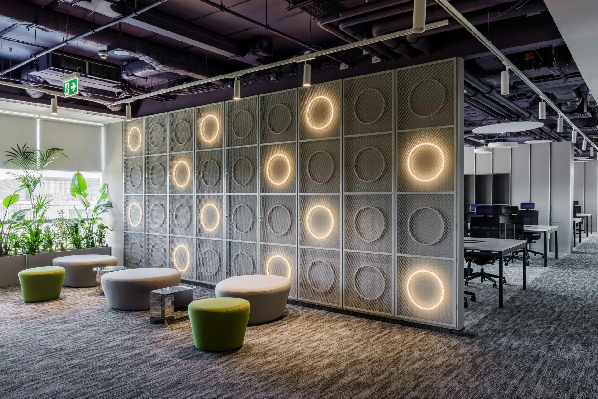 Integrarea brandingului joacă un rol central, fiind realizată prin paleta cromatică a plafonului tehnic și a mobilierului, completată de accentele de verde. Forma corpurilor de iluminat și detaliile acustice circulare consolidează această direcție, prin repetiție și proporție.