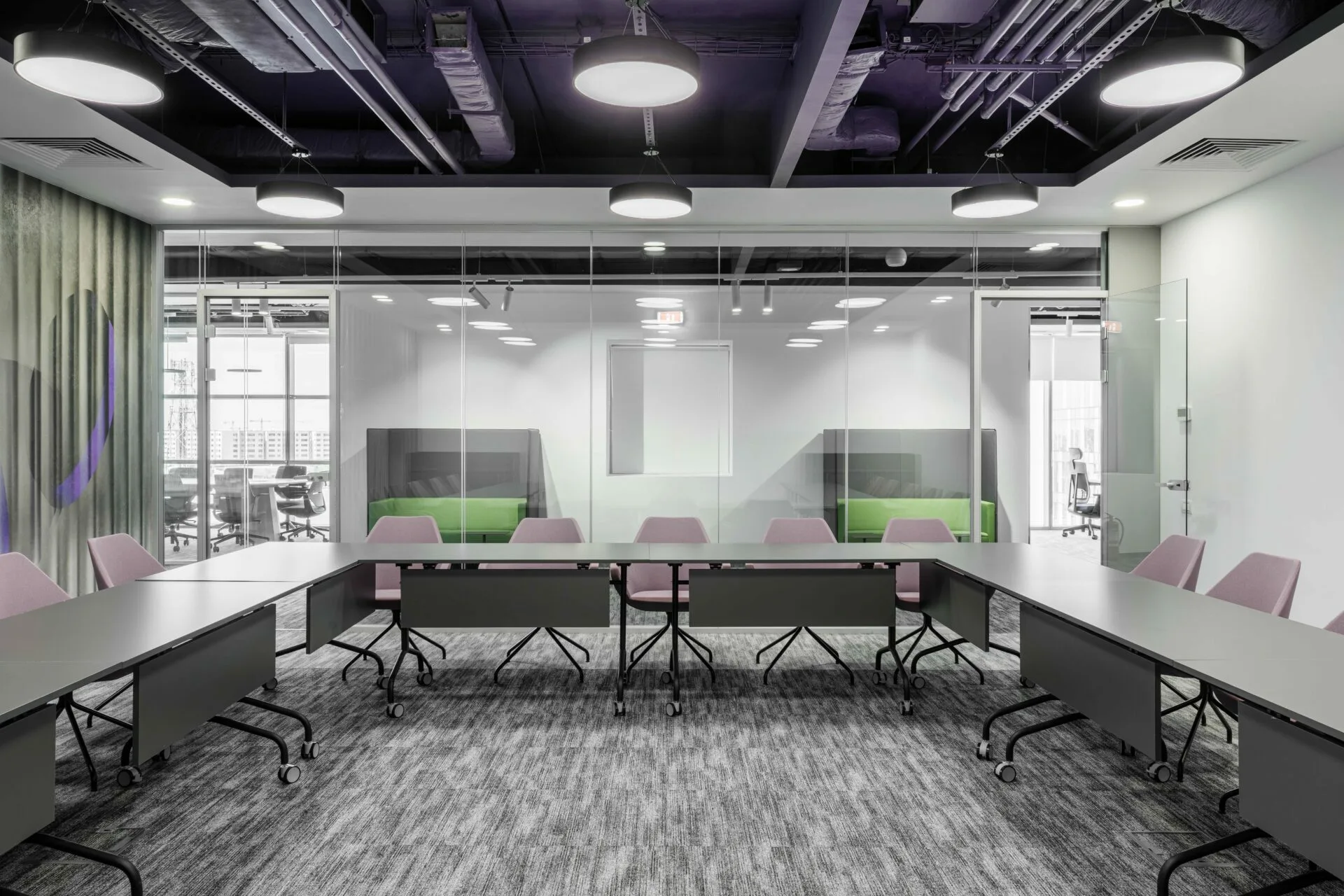 Proiectul Purple Matter configurează un sediu unitar pentru două entități bancare distincte, organizat într-un layout deschis, cu zone de lucru, săli de întâlnire și o intrare cu rol de reper vizual. Designul integrează brandingul, flexibilitatea și soluții sustenabile într-o amenajare coerentă și adaptabilă.