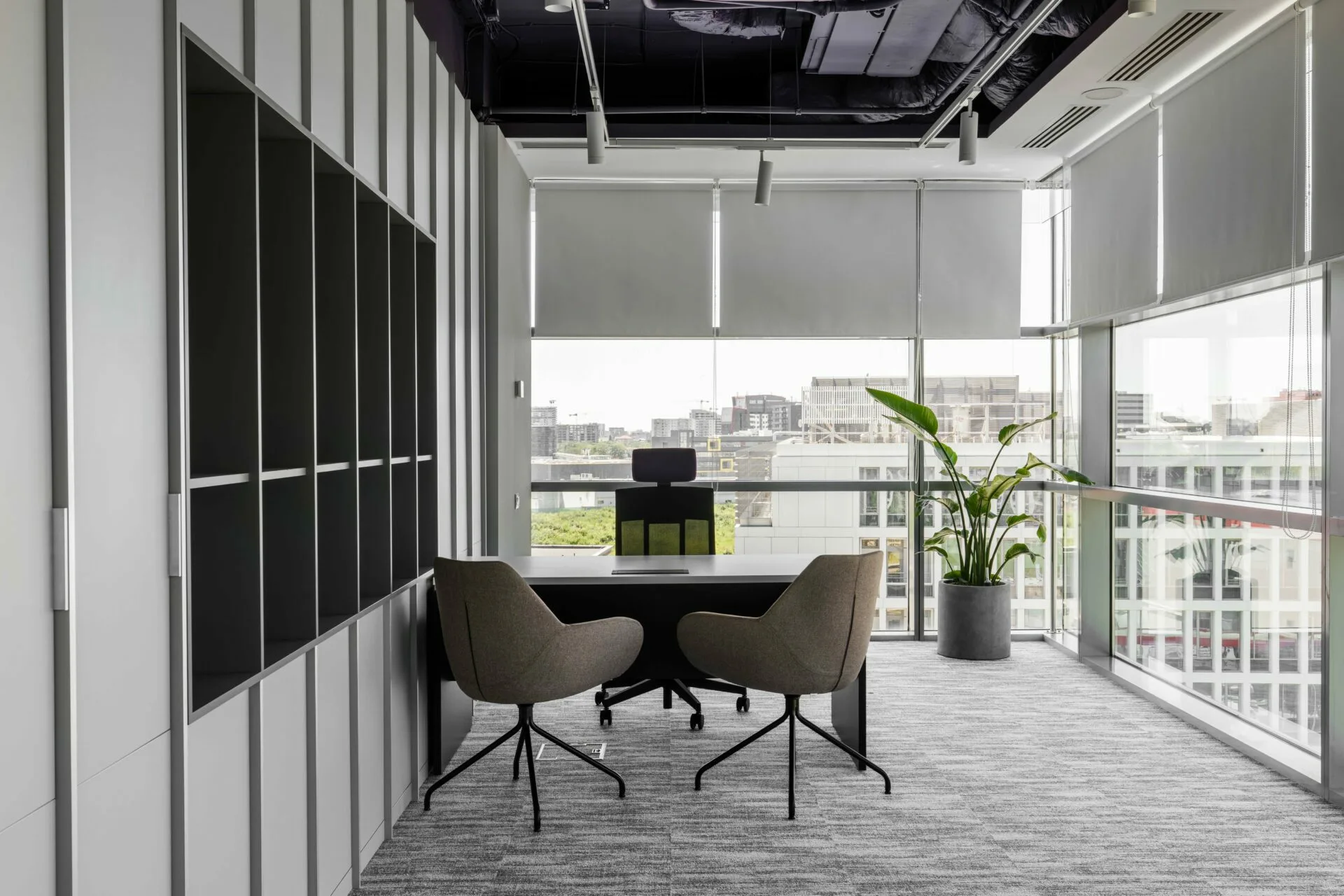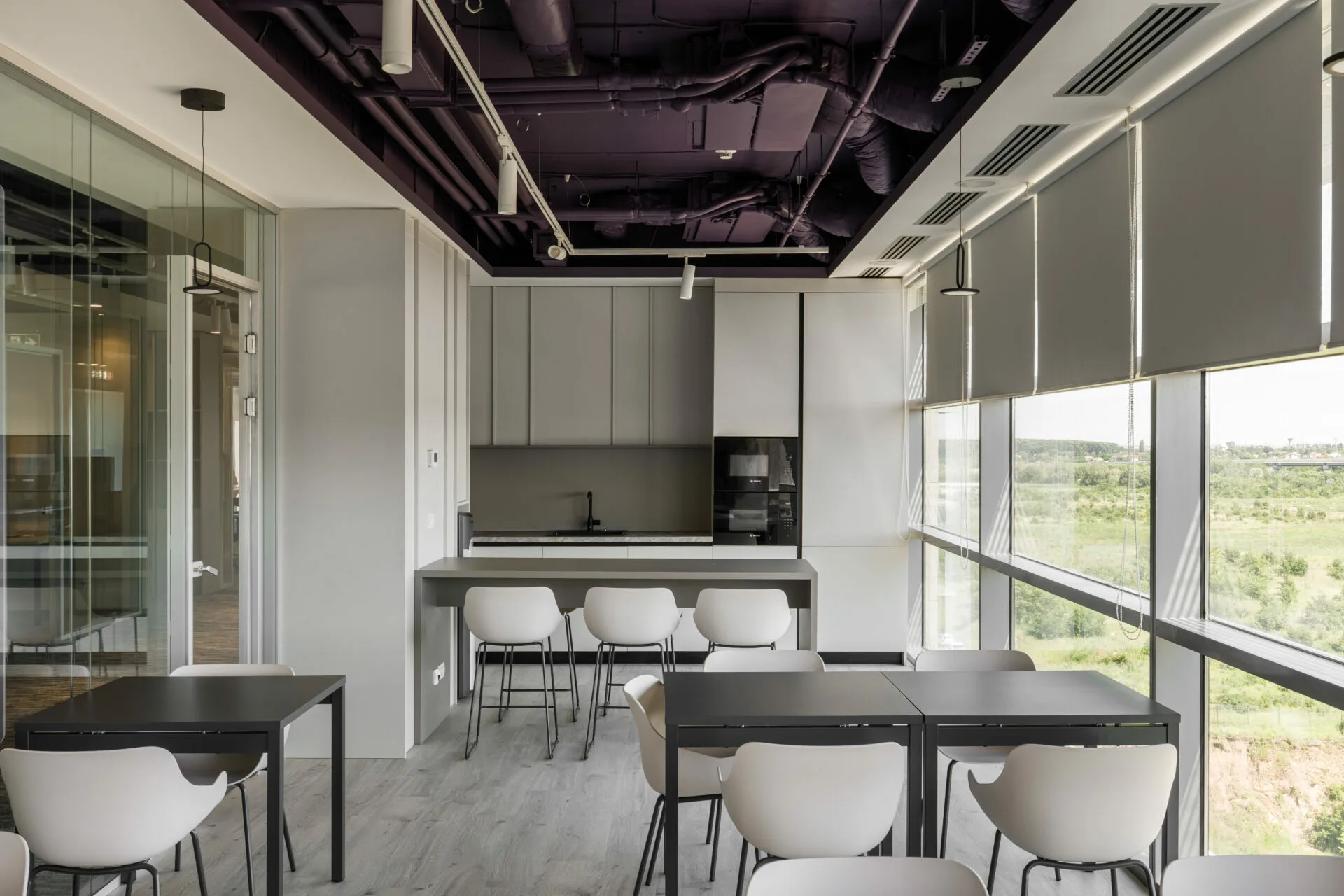 Componenta sustenabilă a intervenției se reflectă în păstrarea compartimentărilor existente, reinterpretate funcțional, cu intervenții punctuale realizate prin partiții de sticlă și pereți noi. Plafonul a fost reconfigurat parțial, iar instalațiile existente au fost adaptate cerințelor tehnice actuale, rezultând un spațiu flexibil, eficient și complet funcțional.