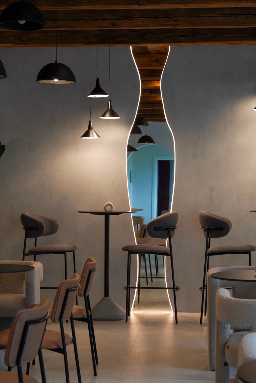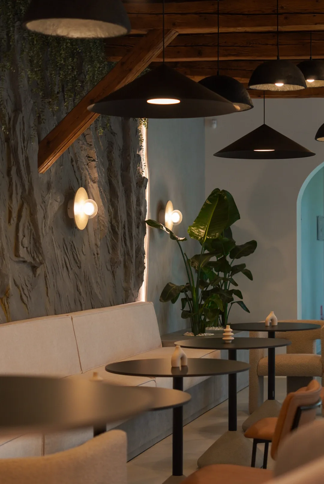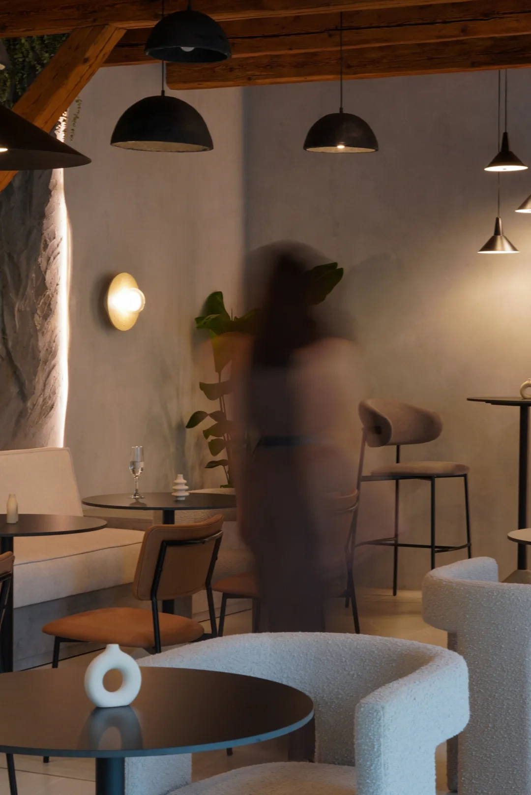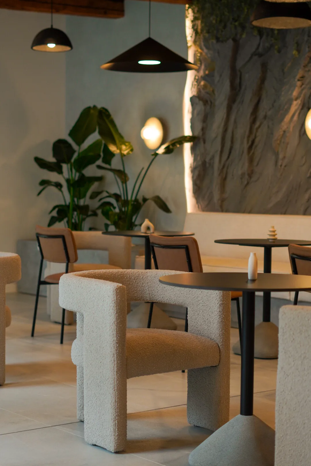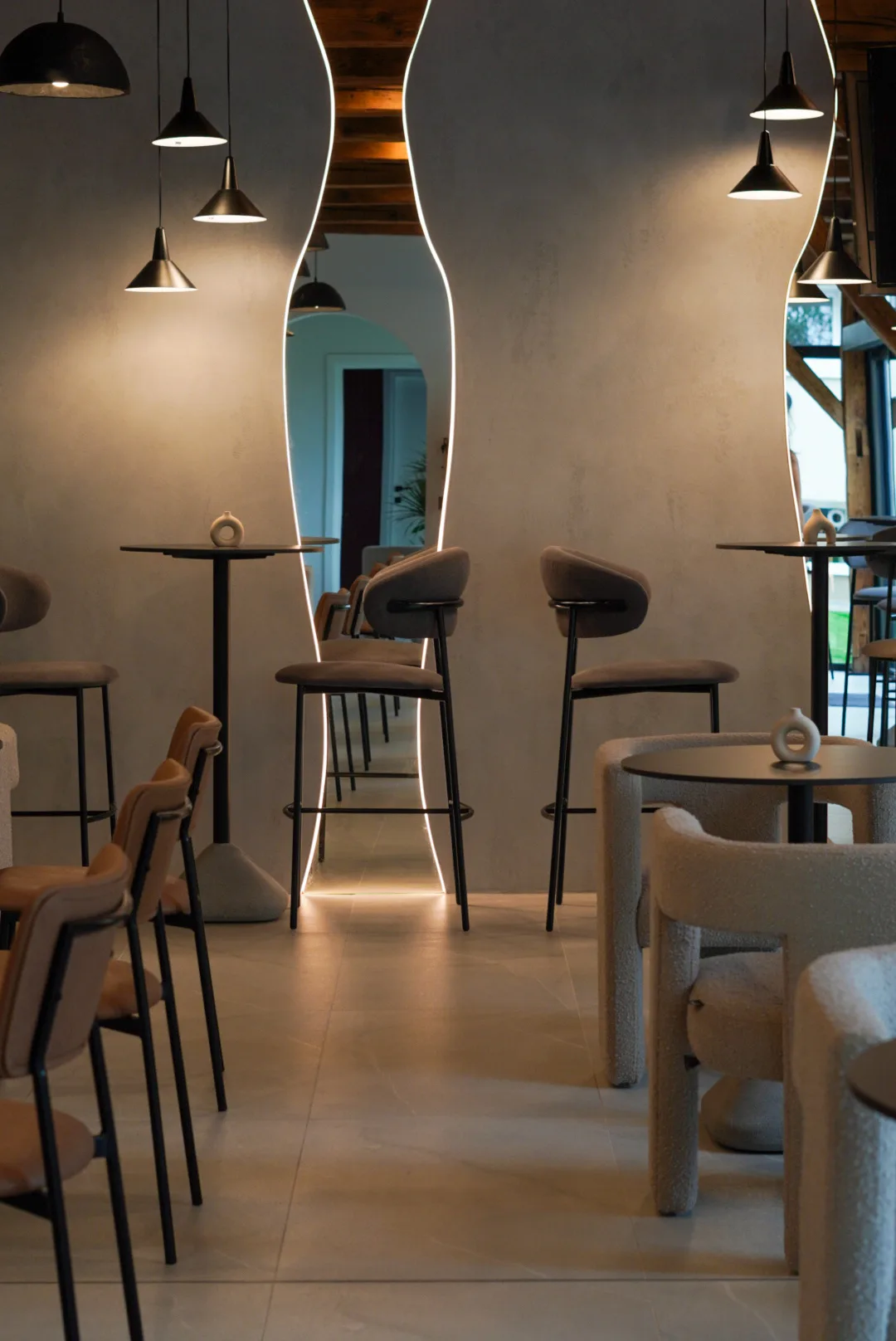 Finisajele cu aspect mineral, amprenta de beton folosită, adaugă profunzime și un caracter tactil subtil, în timp ce mobilierul cu forme rotunjite și linii simple contribuie la senzația de confort și intimitate. Iluminatul joacă un rol esențial în definirea atmosferei, printr-o combinație de corpuri suspendate cu design minimalist, aplici ambientale și accente de lumină încastrate, bandă led la nivelul onglinzilor cu forme fluide, lumina încastrată în riflaje și perete la zona bufetului.
