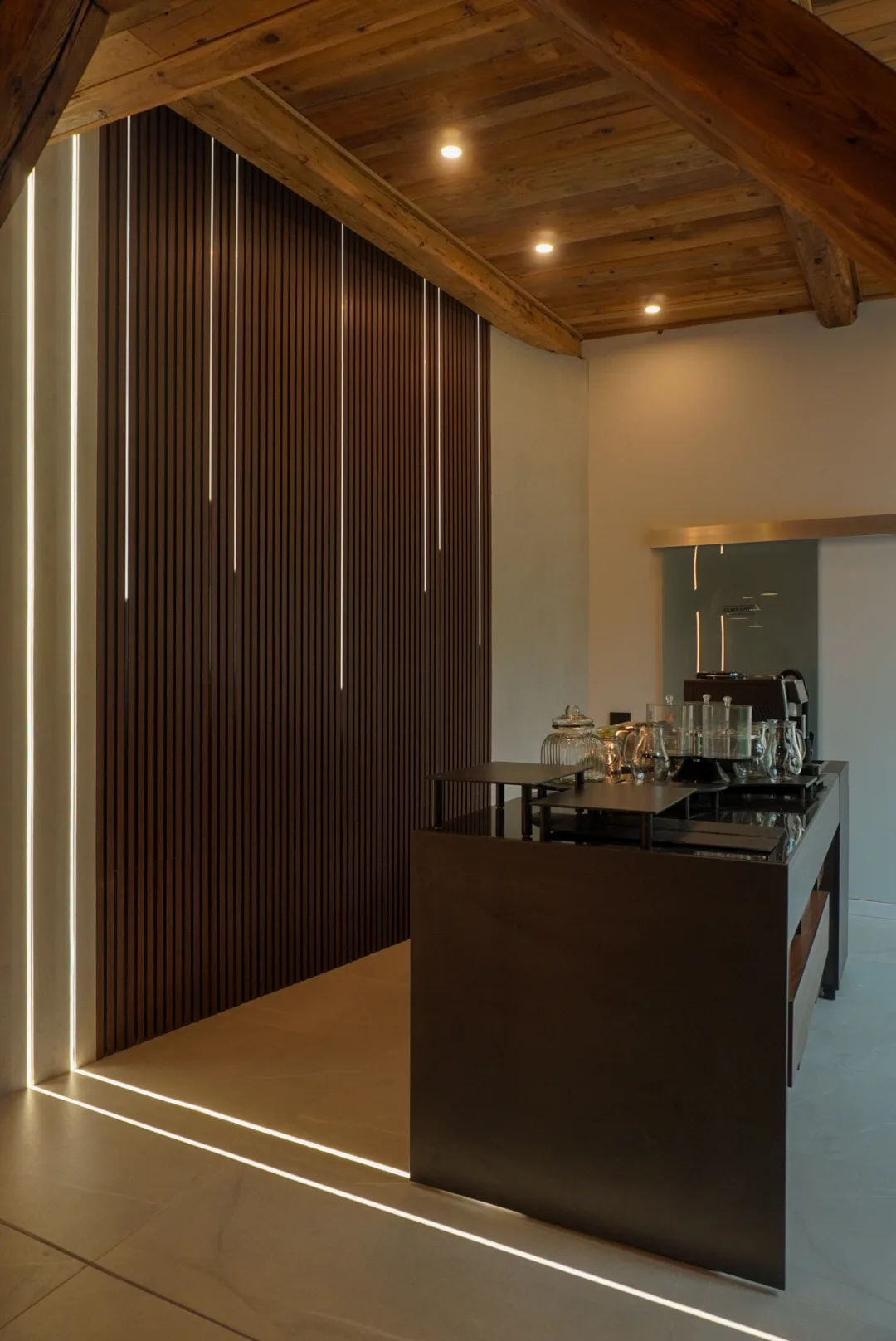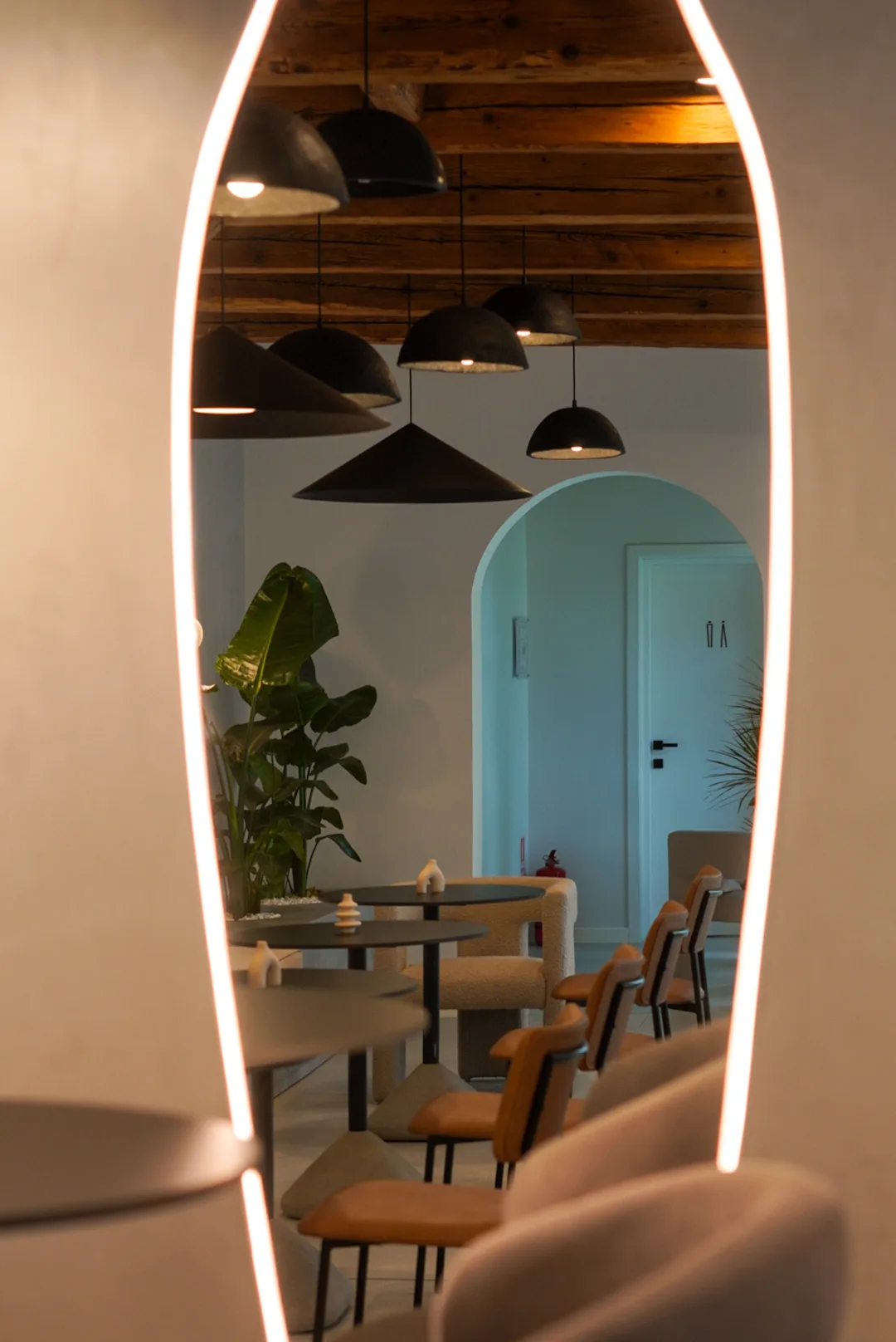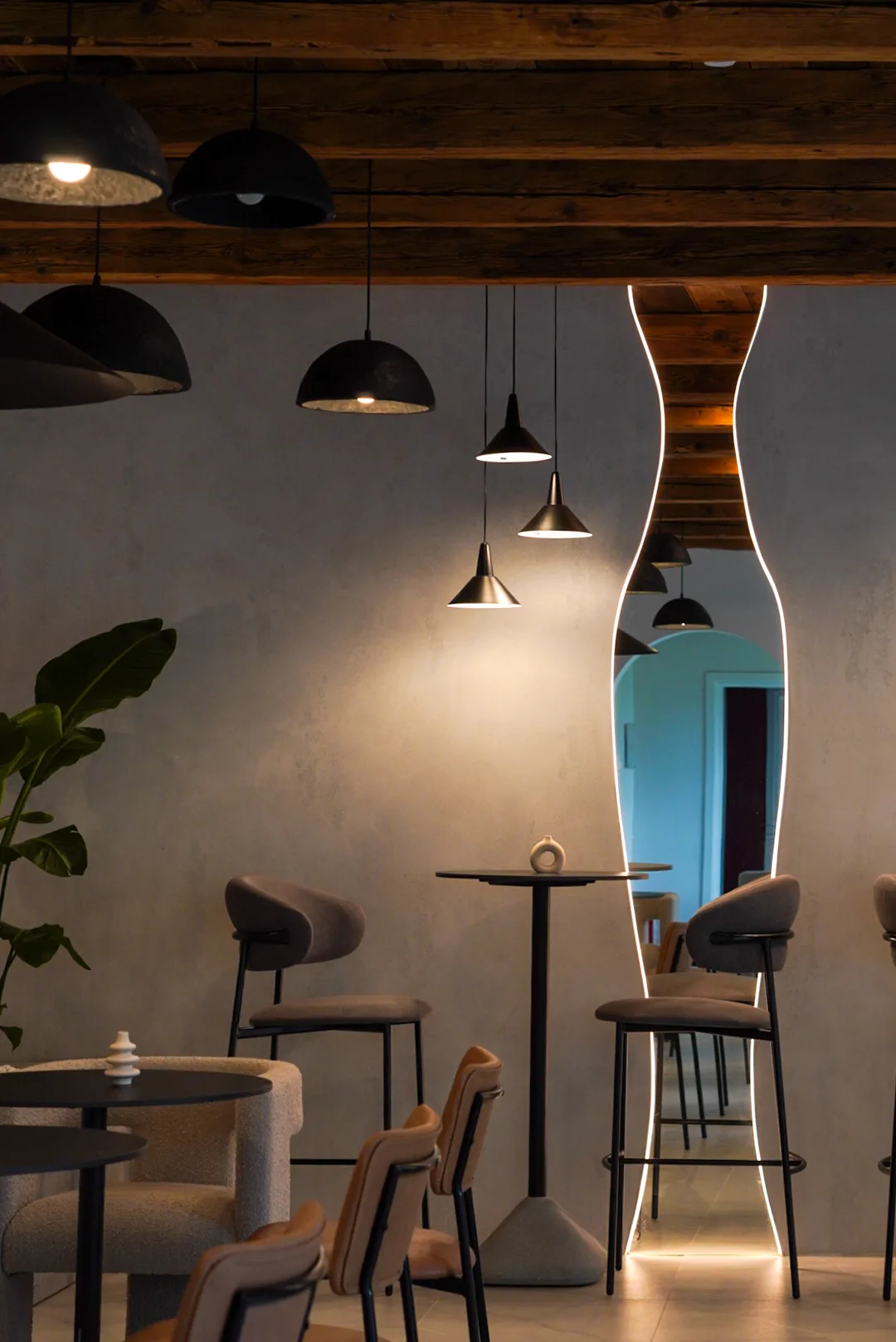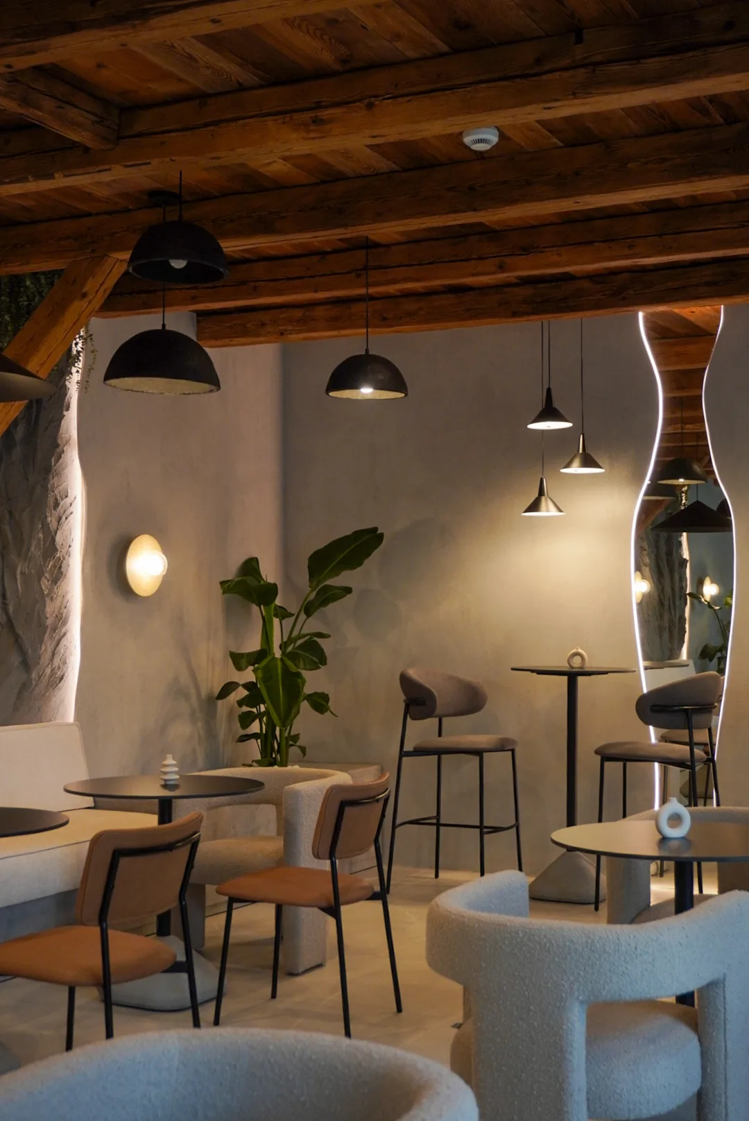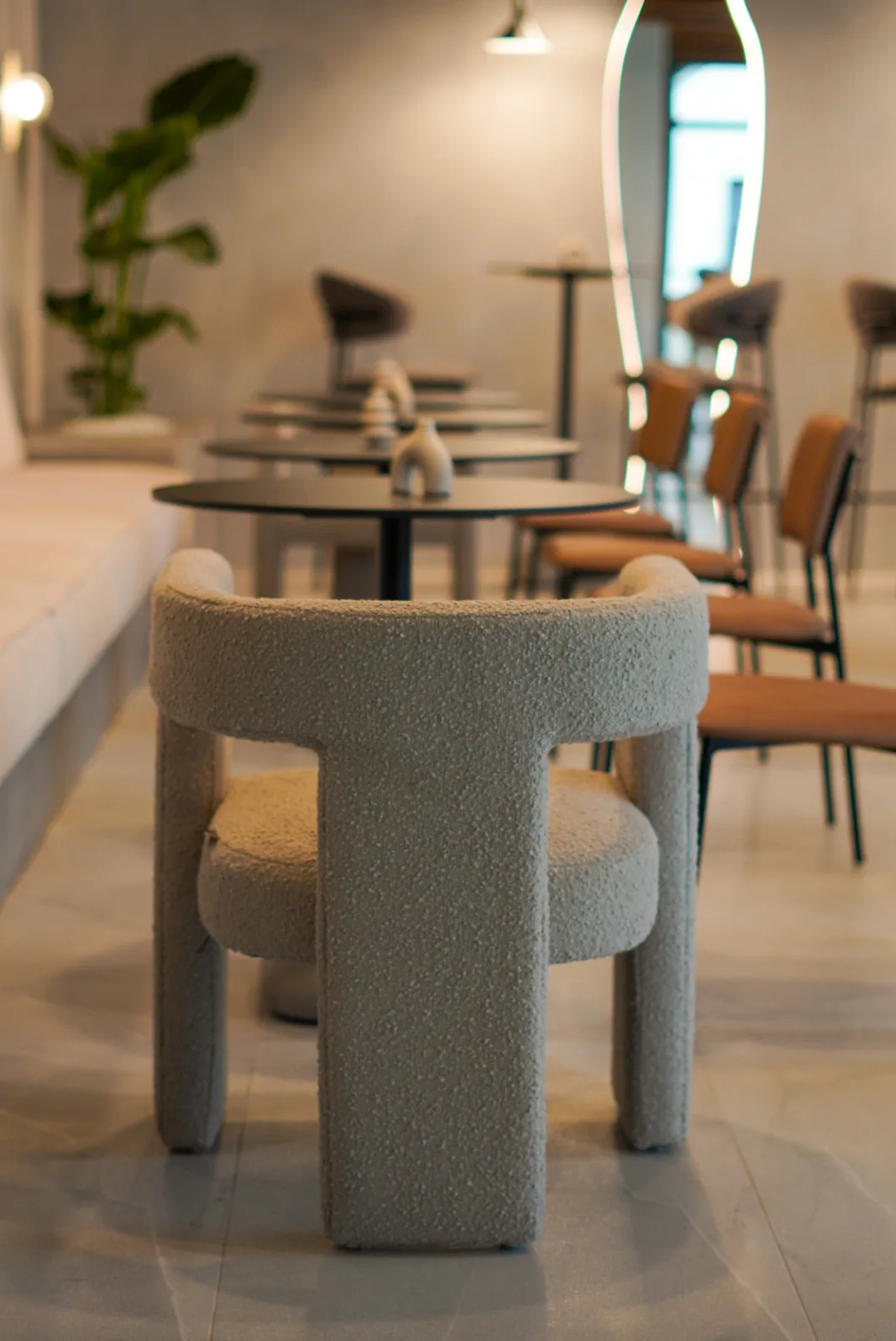 Finisajele cu aspect mineral, amprenta de beton folosită, adaugă profunzime și un caracter tactil subtil, în timp ce mobilierul cu forme rotunjite și linii simple contribuie la senzația de confort și intimitate. Iluminatul joacă un rol esențial în definirea atmosferei, printr-o combinație de corpuri suspendate cu design minimalist, aplici ambientale și accente de lumină încastrate, bandă led la nivelul onglinzilor cu forme fluide, lumina încastrată în riflaje și perete la zona bufetului.