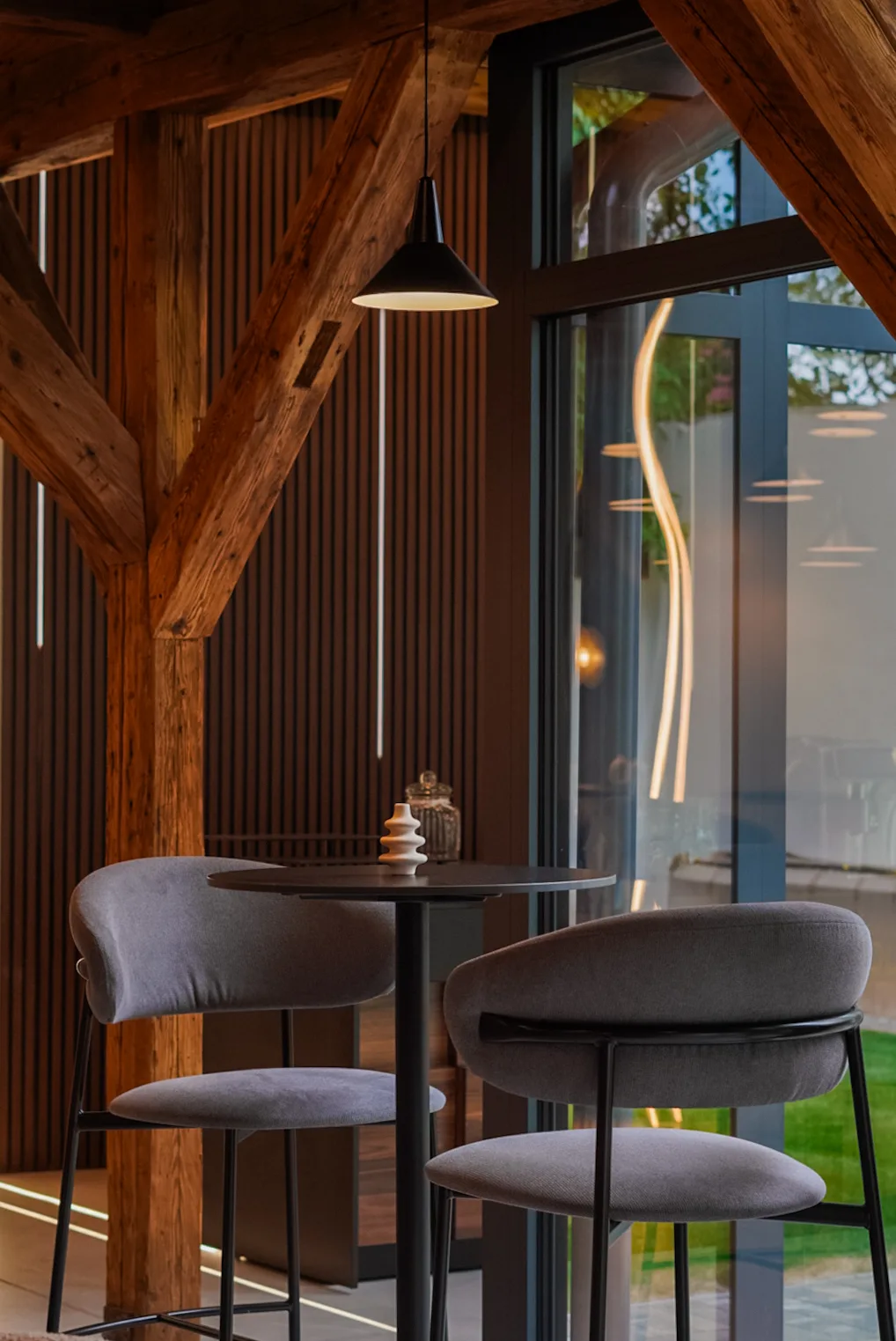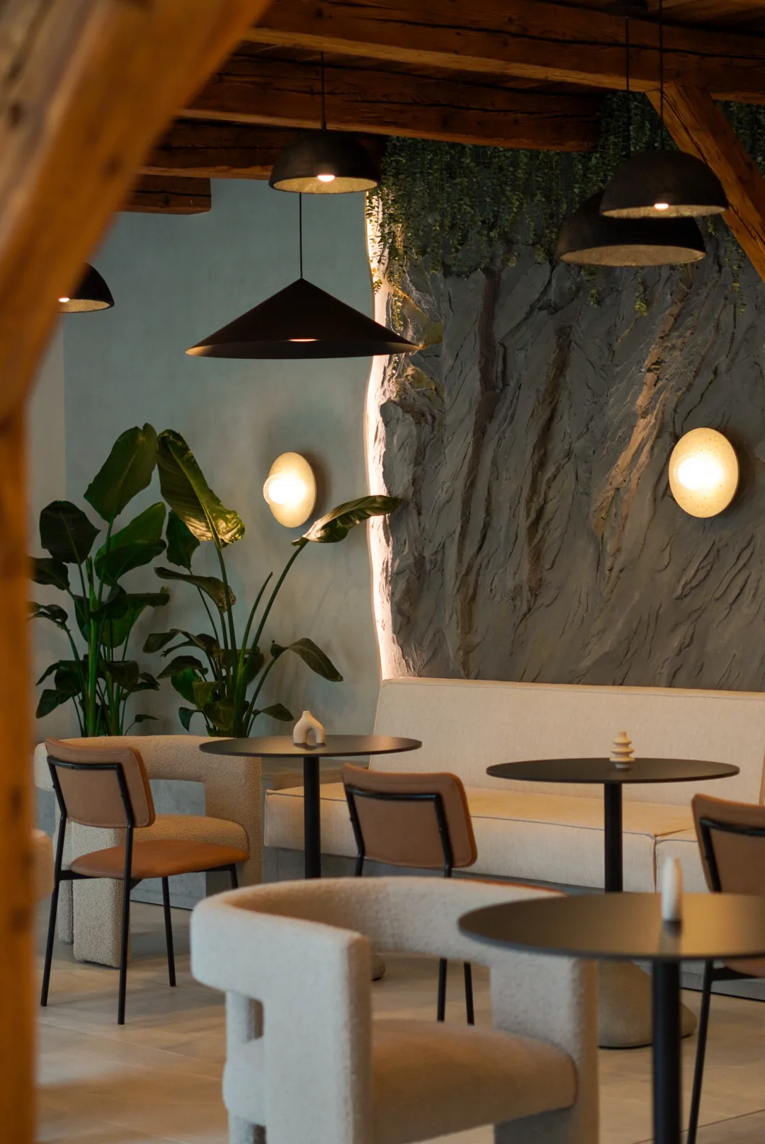 Restaurant Sennse Boutique Hotel din Sibiu este conceput ca un spațiu de refugiu urban, în care am pus accent pe echilibru, materialitate și o relație discretă cu natura, prin roca decorativă propusă în zona canapelei și plantele naturale care completează zona. Finalizat în 2025, proiectul propune o atmosferă calmă și luminoasă, potrivită ritmului lent al dimineților și experienței de mic dejun într-un concept boutique. Paleta cromatică este construită din nuanțe neutre de gri, maro, bej și verde, completate de nuanță caldă a structurii de lemn aparente.