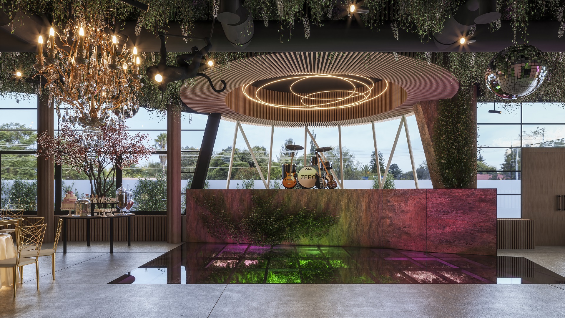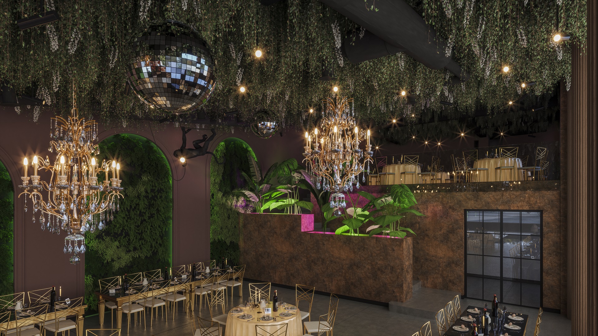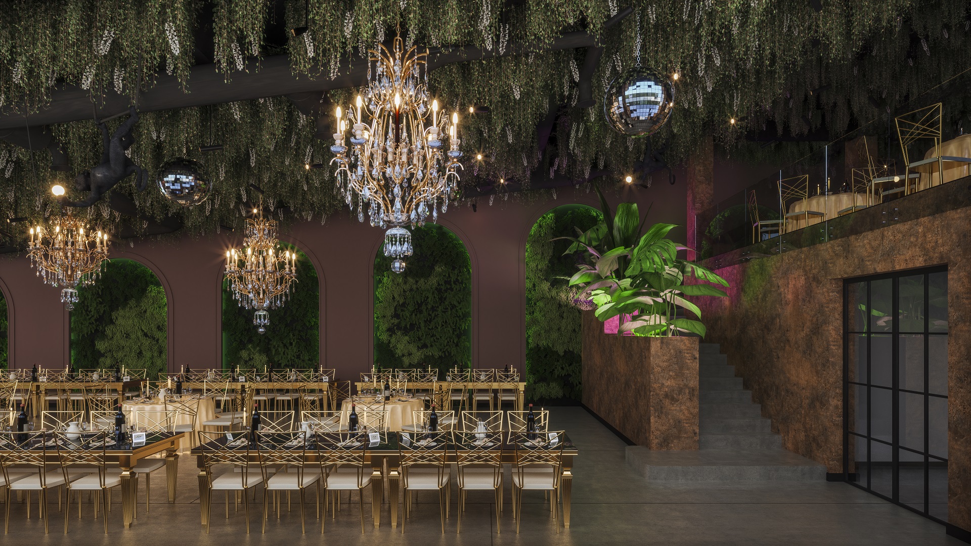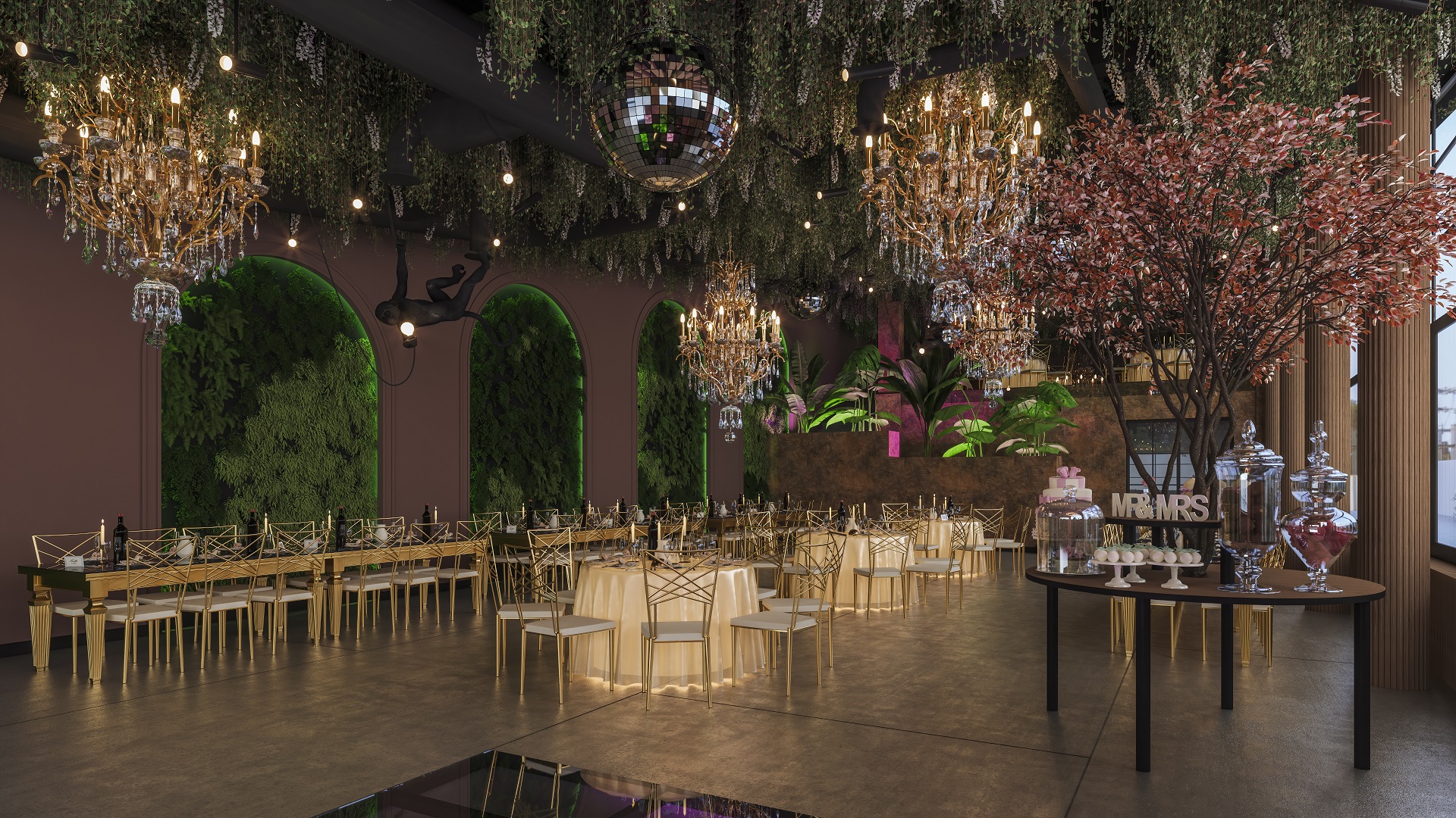 Plantele sunt amplasate strategic în încăpere, aducând prospetime și viață, iar elementele din beton și lemn adaugă un caracter industrial și natural în același timp. Designul nostru pune în valoare simplitatea și autenticitatea, creând un cadru perfect pentru evenimente deosebite, unde oamenii se pot bucura de frumusețea naturală și confortul modern în același loc. Decorul luxury este subliniat prin detalii fine și materiale de cea mai înaltă calitate, oferind o atmosferă exclusivă și sofisticată.