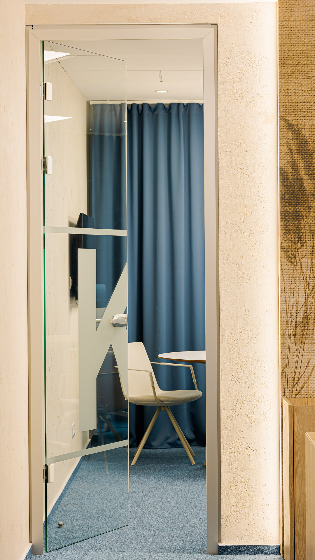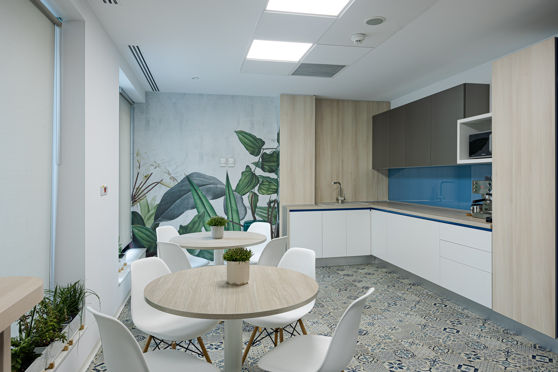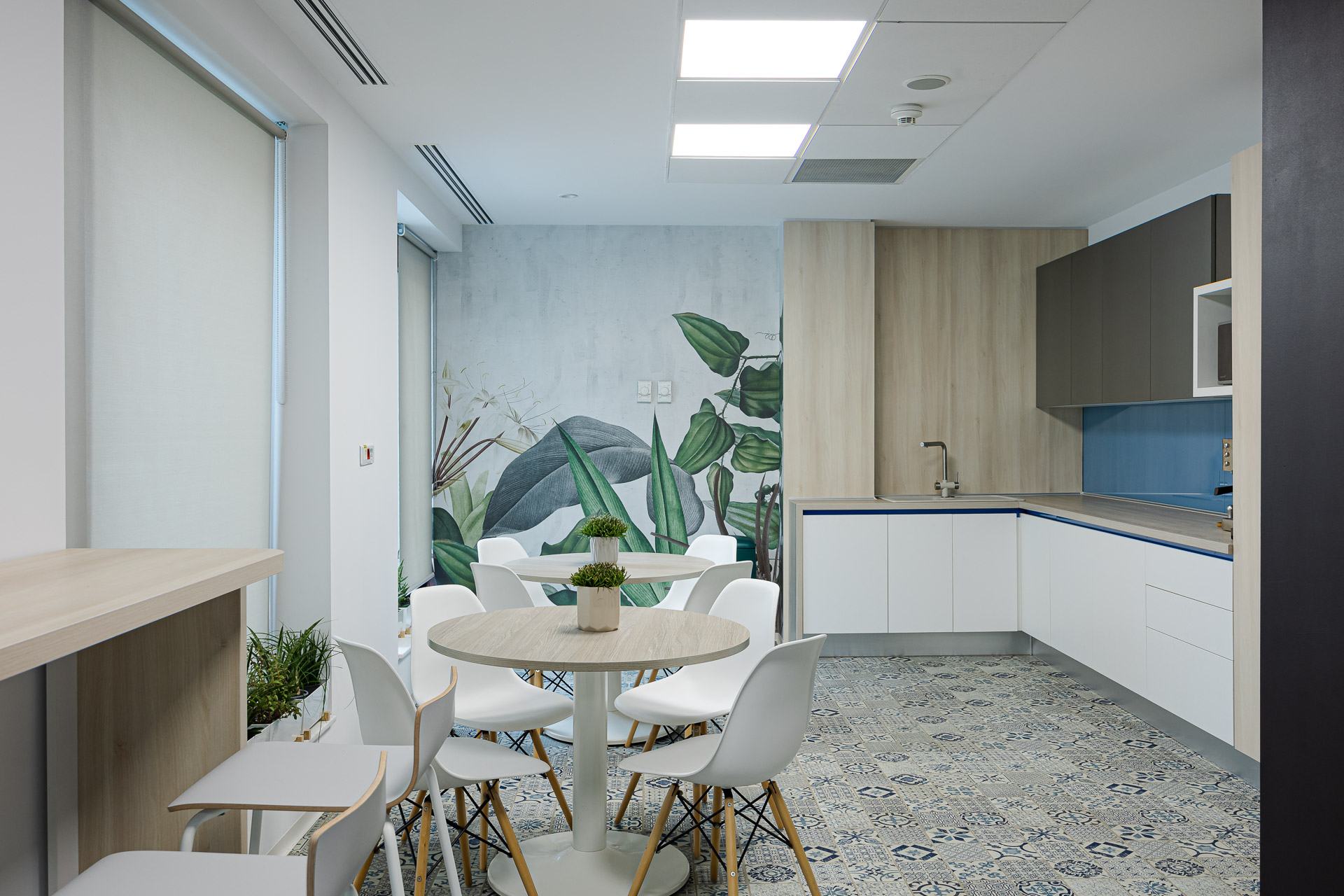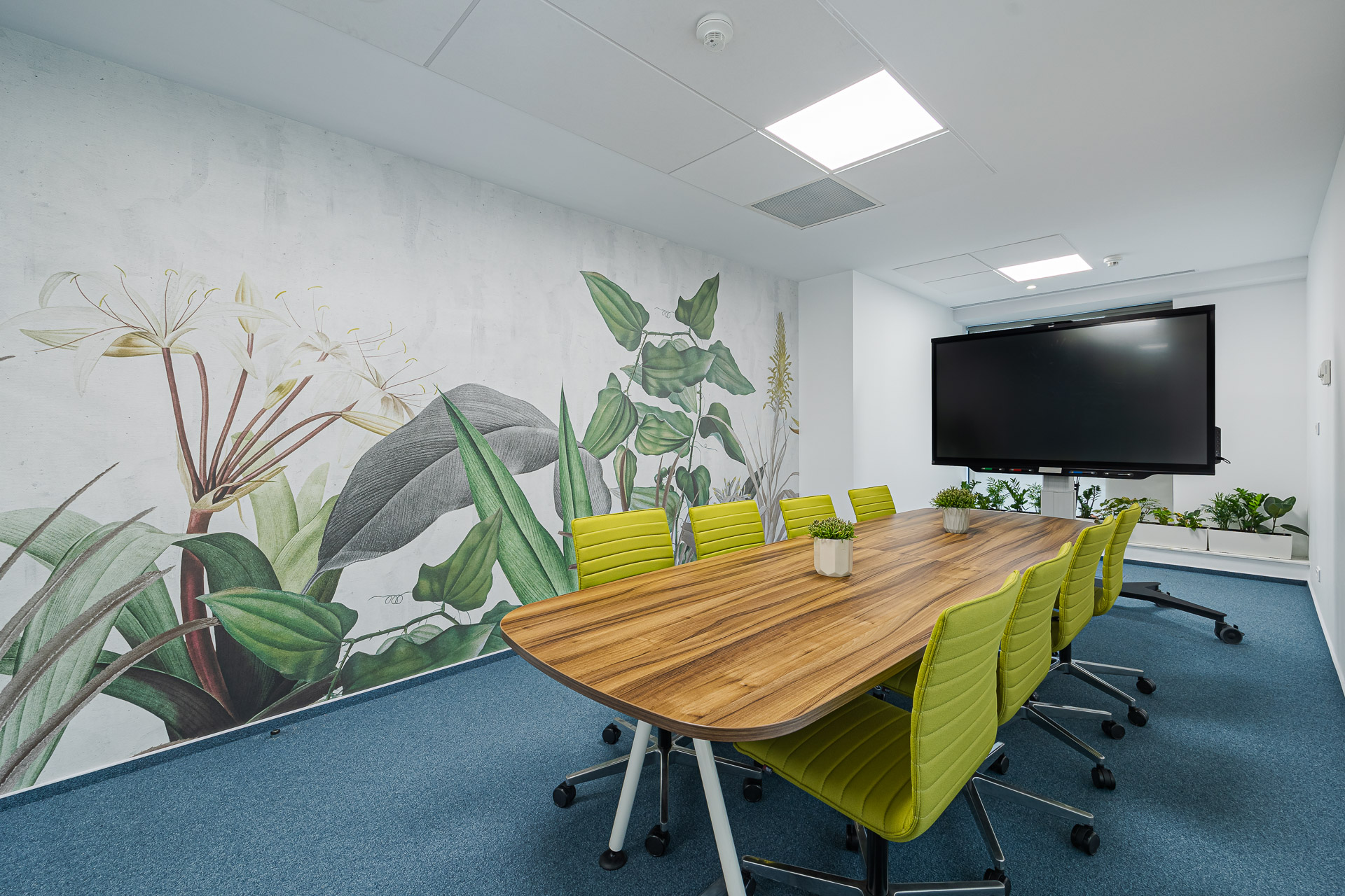 Tot în părțile comune regăsim mici zone cu fotolii: unele pentru interacțiune, altele destinate conversațiilor telefonice private, acele fotolii de design „round private” cu spătar înalt fonoizolator și măsuță integrată. Bucătăria, cu deschidere spre terasă, a devenit un spațiu foarte prietenos. Pardoseala cu un joc patchwork de culoare albastră combinată cu fototapetul vegetal și multe plante a devenit un loc unde oamenii mănâncă, glumesc și se simt bine. De fapt, despre asta e tot biroul lor. Sala de conferințe, în schimb, este o declarație a modului premium de business pe care îl oferă firma: masă impozantă pentru 24 de persoane, scaune elegante, de design. Pereții fonoabsorbanți sunt îmbrăcați într-un fototapet din degradeu alb-albastru, o aluzie la metafora creșterii, acel „burst of life” din lumea vegetală. Ea reprezintă și punctul final al traseului ghidat de lampa organică. Pentru că munca de birou nu mai înseamnă doar stat ore întregi pe un scaun, am propus câteva birouri reglabile pe înălțime, care îți permit lucrul și din picioare. De asemenea, spatiile de birouri au fost împânzite de multe plante naturale dar și de decorații: stickere cu natură, decorațiuni cu păsări din gips care creează un efect 3D. Toate, pe fundaluri de culoare deep blue (albastru), culoarea de brand a companiei.