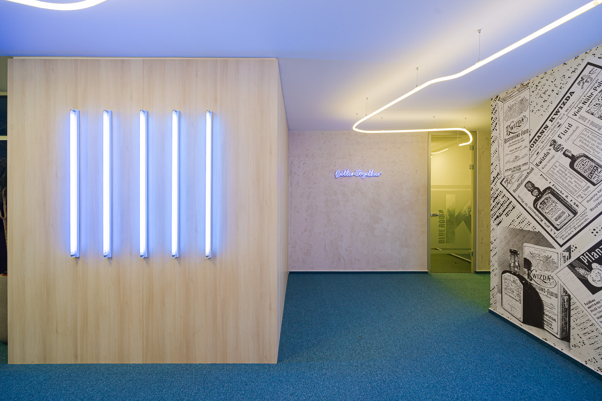 „Percepția noastră asupra spațiului de lucru s-a schimbat în ultimul timp, așa că astăzi vorbim de birouri flexibile. Nu mai trebuie să fii legat de o masă, poți oricând să îți iei laptopul și să lucrezi într-un loc mai relaxat sau mai intim”, este de părere arhitectul Alexandru Bucur, coordonatorul proiectului. Cum arată acum spațiile comune: Am creat un „traseu” pornind din zona de recepție, folosindu-ne de o lampă organică ce te „plimbă” prin spațiu către zonele importante: săli de meeting, sala de conferințe, zonele de interacțiune, spotul interactiv, bucătărie și terasă. E un traseu interactiv, deloc monoton, fiecare element întâlnit îți transmite ceva: mesajele din neon și lămpile albastre îți trezesc simțurile, plante agățătoare îți dau o stare de bine, fototapetul cu aspect retro îți șoptește câte ceva despre momentele-cheie din istoria companiei. La nivel cromatic, neonul și textilele albastre creează o legătură cu culoarea brandului, în timp ce maroul surprinde esența: pământ și recoltă.