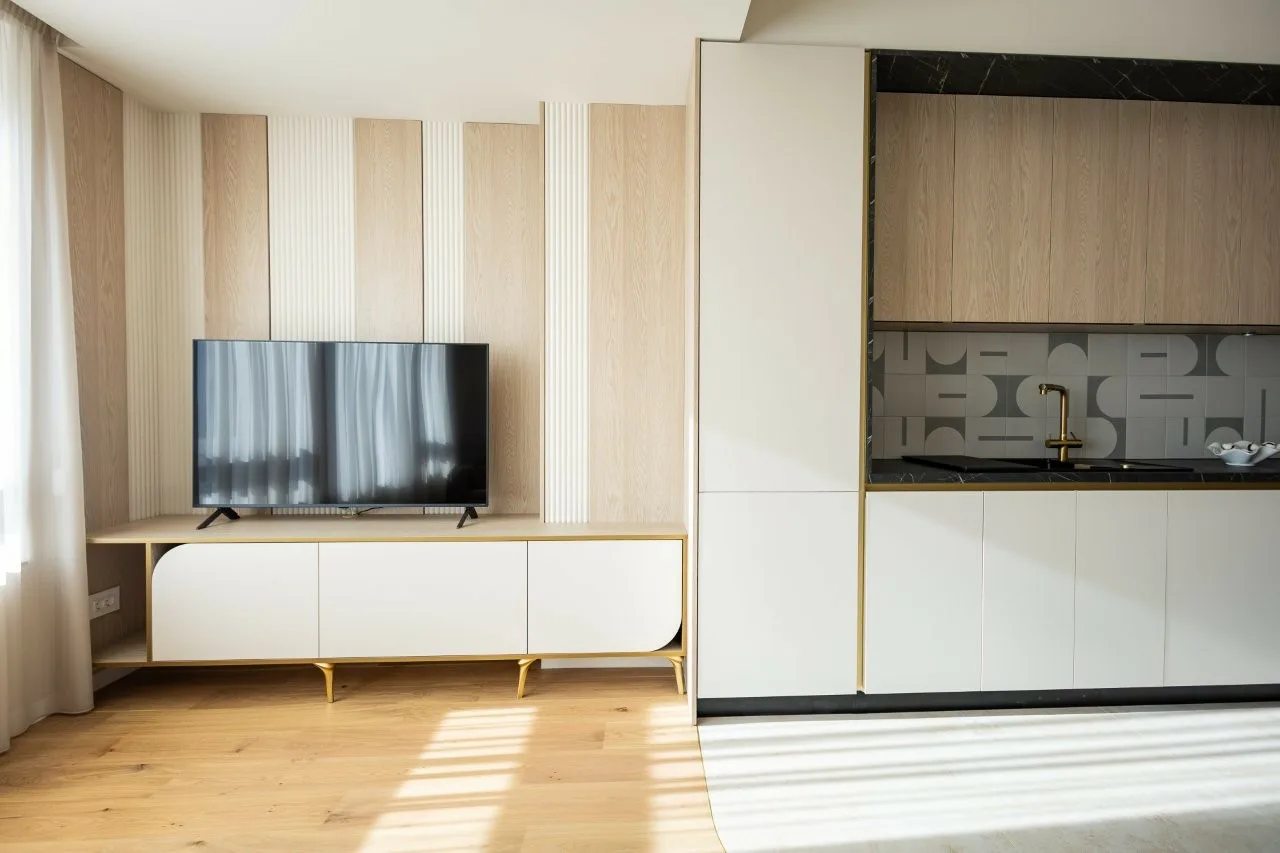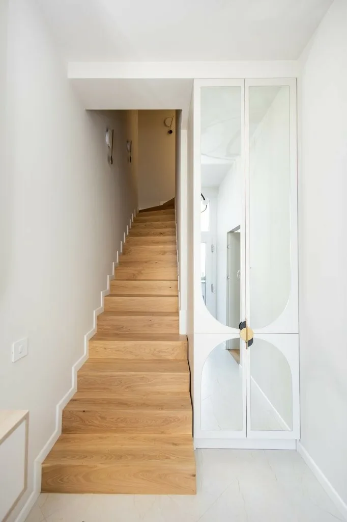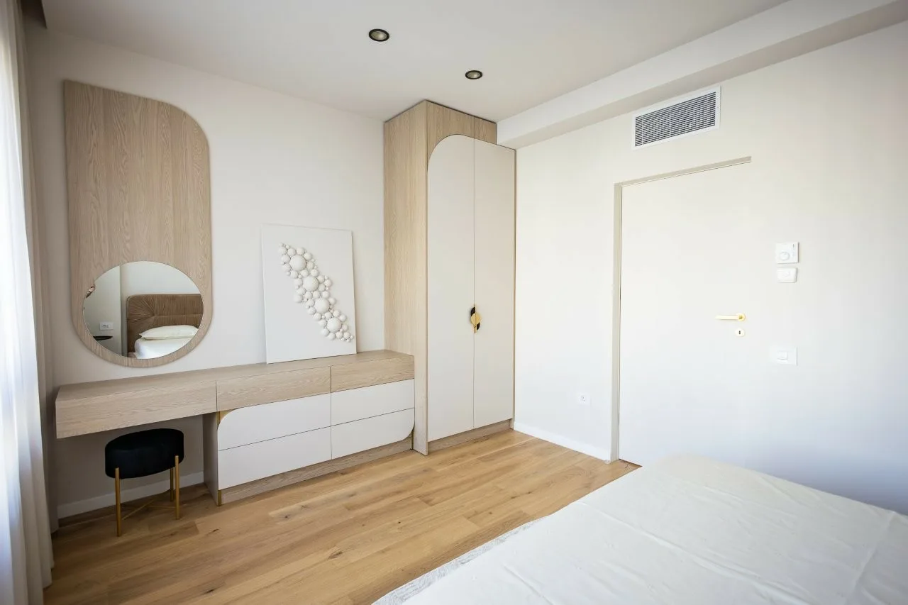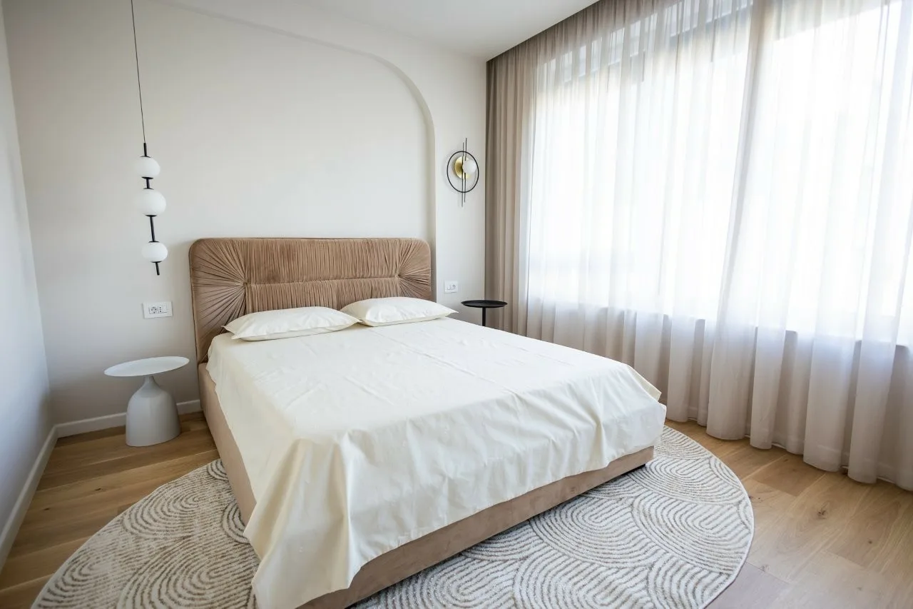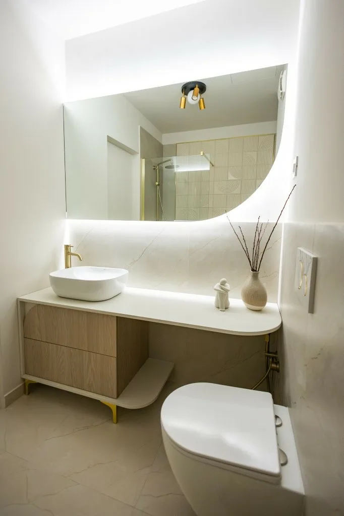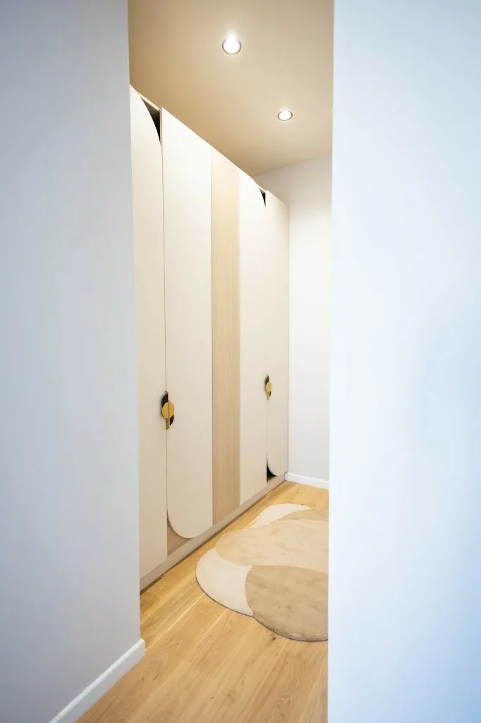 Materialele sunt selectate în tonuri naturale și luminoase, pentru a amplifica lumina și a păstra senzația de deschidere. Rezultatul este un interior compact, dar surprinzător de aerisit, în care limbajul rotunjit, detaliile fine și armonia culorilor creează o atmosferă modernă aliniată tendințelor actuale.