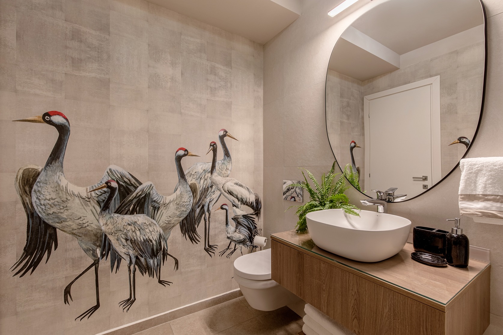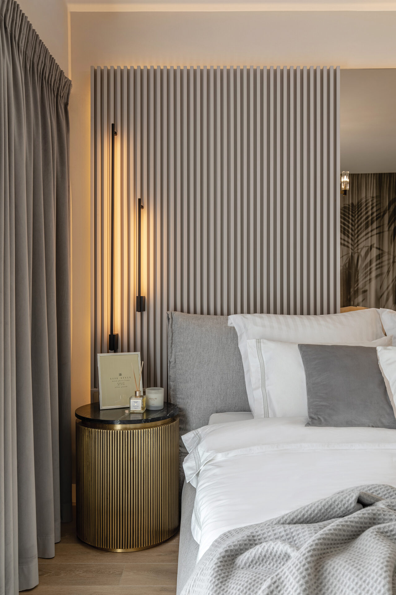 În ceea ce privește cromatica, am optat pentru o nuanță decor de lemn în tonuri de gri, completată de accente metalice negre și aurii. Am combinat oglinzile clare, menite să mărească spațiile, cu cele fumurii ce creează o atmosferă misterioasă. Textilele în culori neutre pun în valoare materialele folosite: de la decorul de lemn până la ceramica pentru blaturile din bucătărie și dining. Pentru pereții care nu au fost tratați special cu placări sau materiale decorative am folosit vopsea lavabilă în nuanța gri cașmir. Am căutat ca aceasta să reprezinte corespondentul culorii lemnului ales pentru fronturile mobilierului, lucru care ne-a ajutat la o continuitate în design și la scoaterea în evidență a contrastelor.
