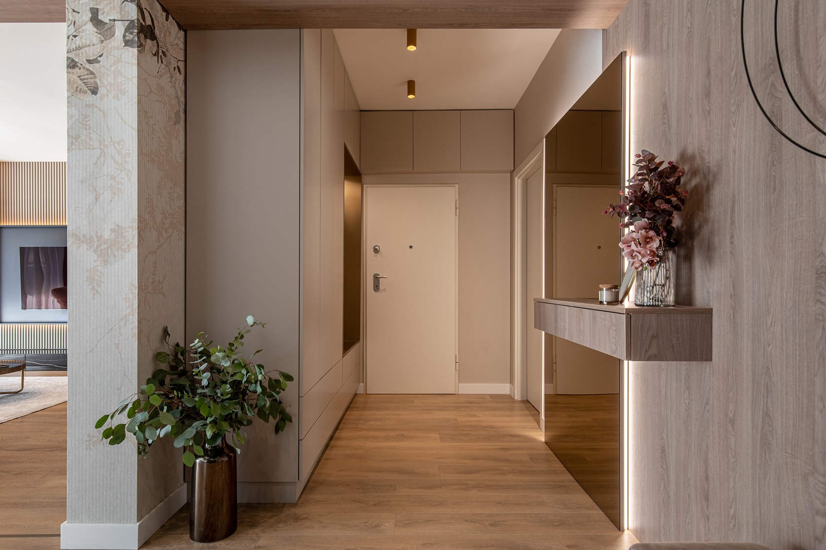 Beneficiarul și-a dorit o amenajare modernă, elegantă, care, în primă fază, să se preteze unei locuințe de închiriat și ulterior să devină locuința sa – un apartament elegant, bine structurat din punct de vedere al funcțiunilor și cu produse de bună calitate. Ne aflăm în zona de nord a capitalei, unde nu se preta să propunem decât un concept la cele mai înalte standarde.
