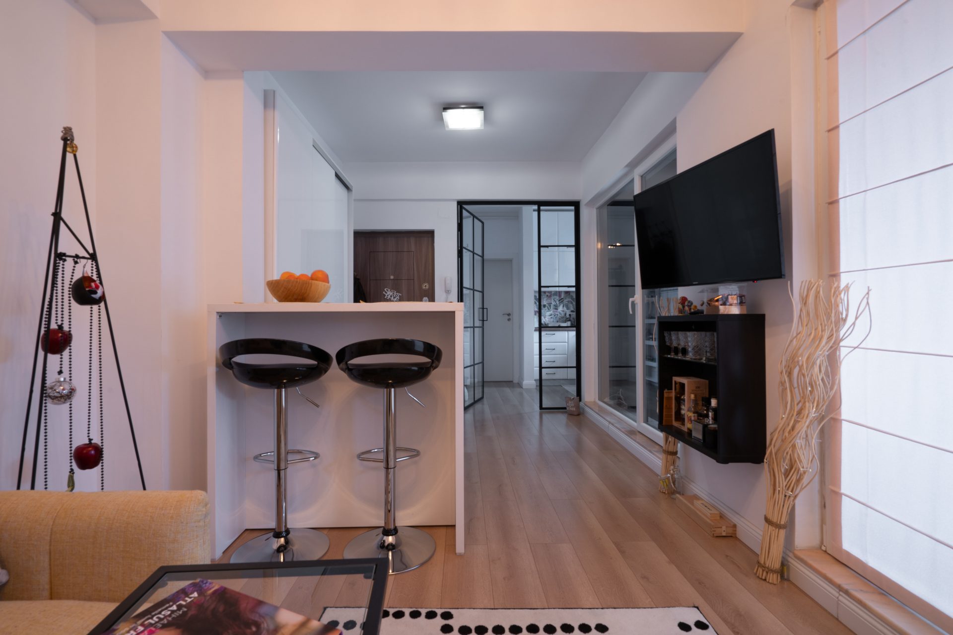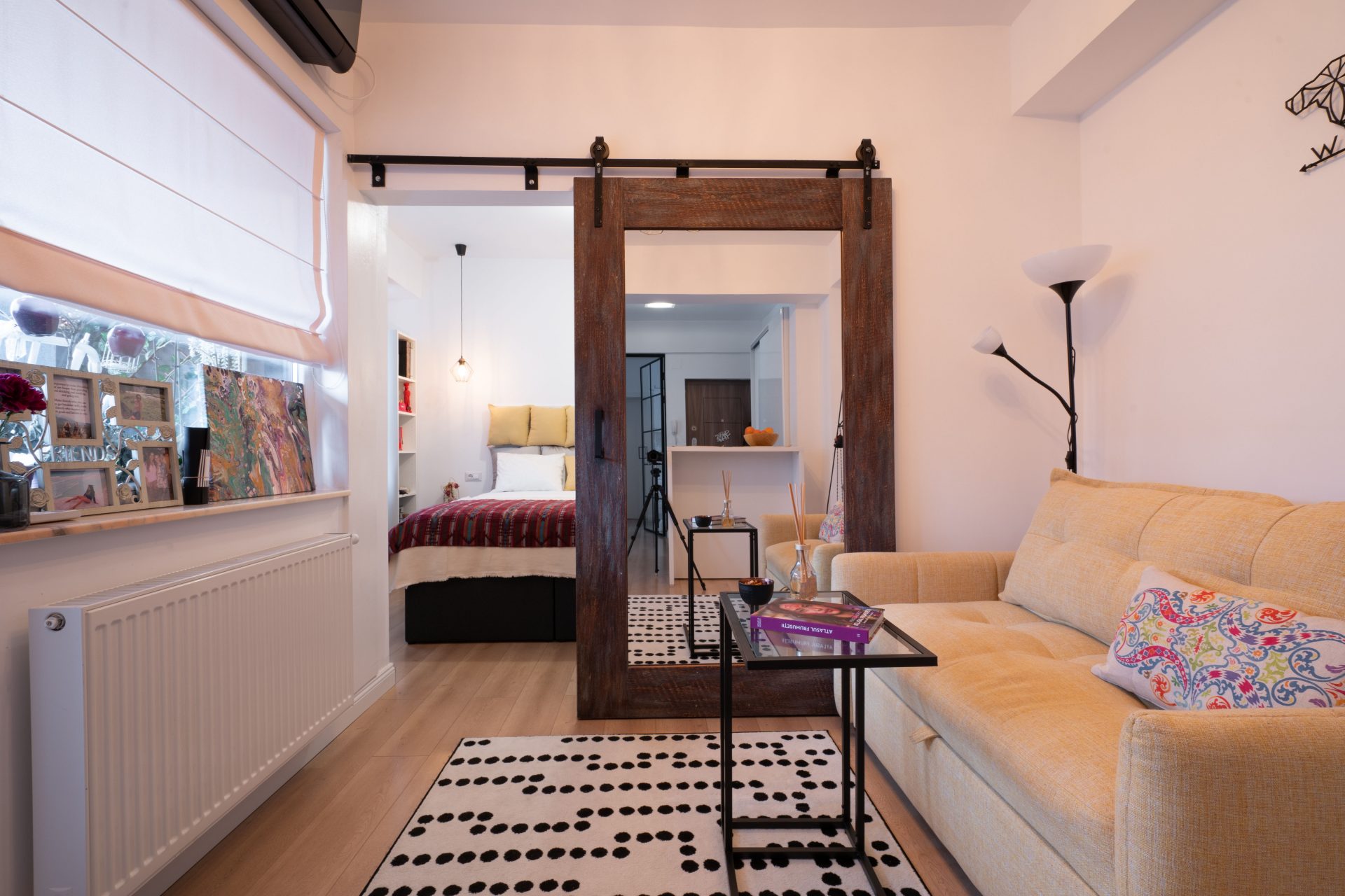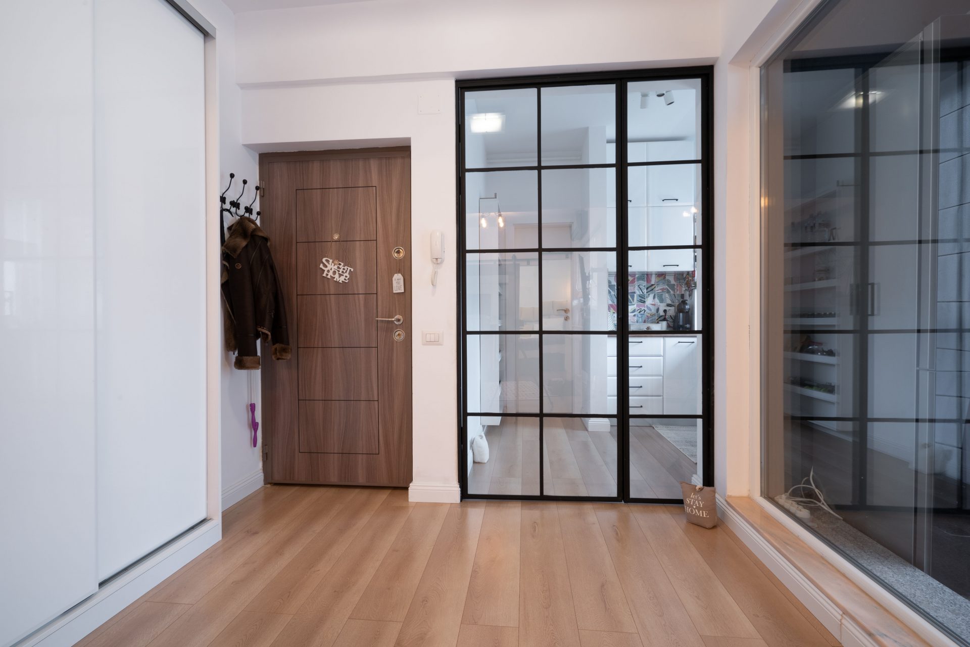 Fiind un apartament cu dimensiuni reduse, Andreea Ștefan a încercat ca in amenajarea apartamentului elementele funcționale să fie și decorative, astfel încât cele două uși realizate pe comandă au dublu rol. Oglinda generoasă de pe ușa glisantă din lemn recuperat creează senzația de spațiu, iar ușa de sticlă cu structură metalică neagră separă bucataria de zona de living, fără să blocheze privirea, și aduce accentul de metal negru, un pic industrial, aspect pe care dorea să-l obțină în living.