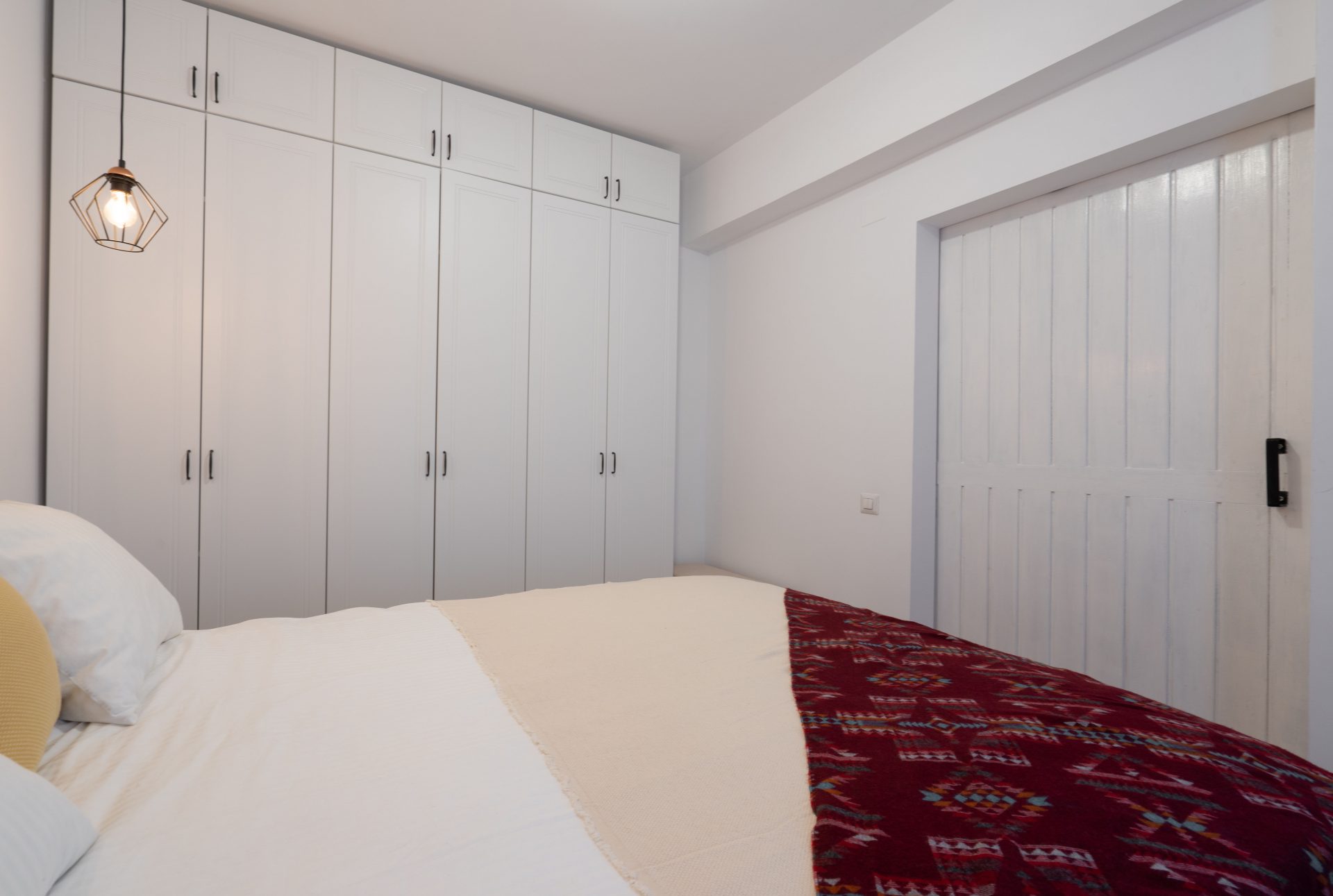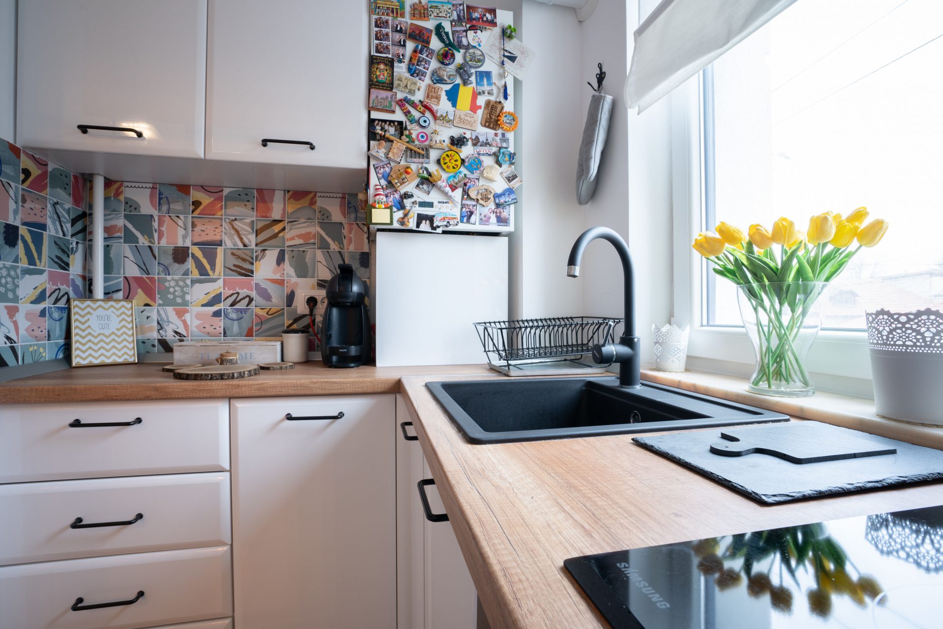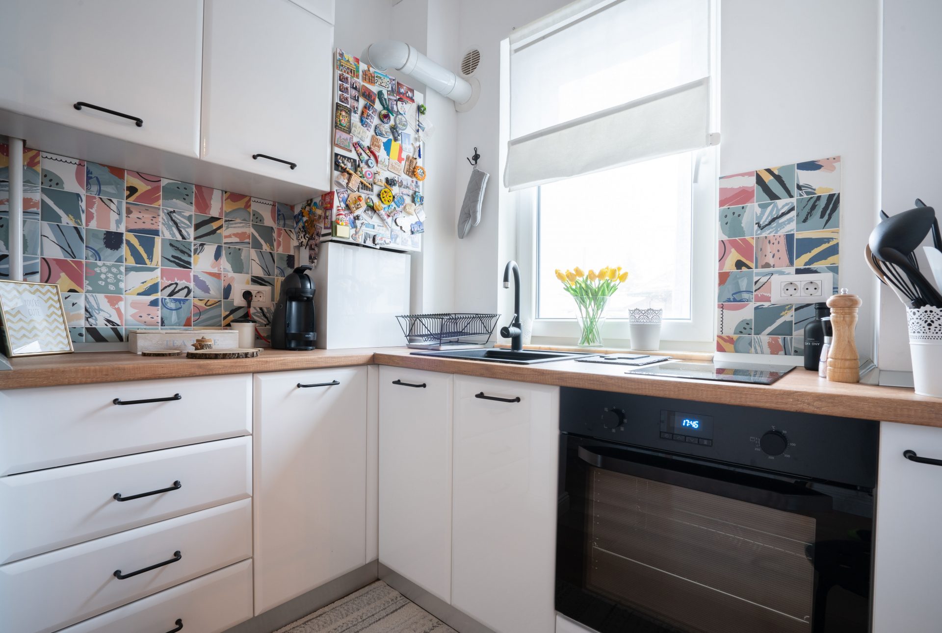 Fiind un apartament cu dimensiuni reduse, Andreea Ștefan a încercat ca in amenajarea apartamentului elementele funcționale să fie și decorative, astfel încât cele două uși realizate pe comandă au dublu rol. Oglinda generoasă de pe ușa glisantă din lemn recuperat creează senzația de spațiu, iar ușa de sticlă cu structură metalică neagră separă bucataria de zona de living, fără să blocheze privirea, și aduce accentul de metal negru, un pic industrial, aspect pe care dorea să-l obțină în living.