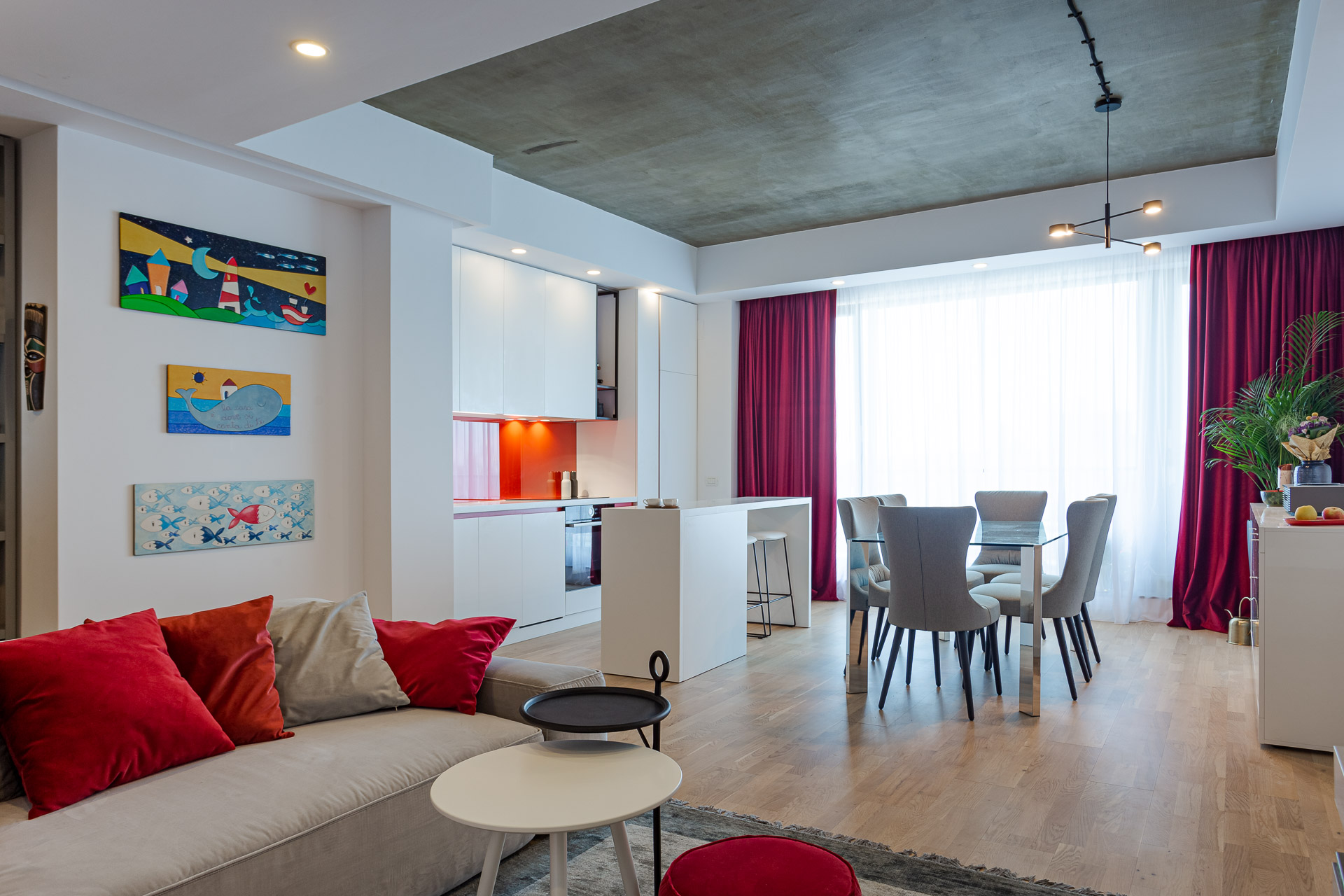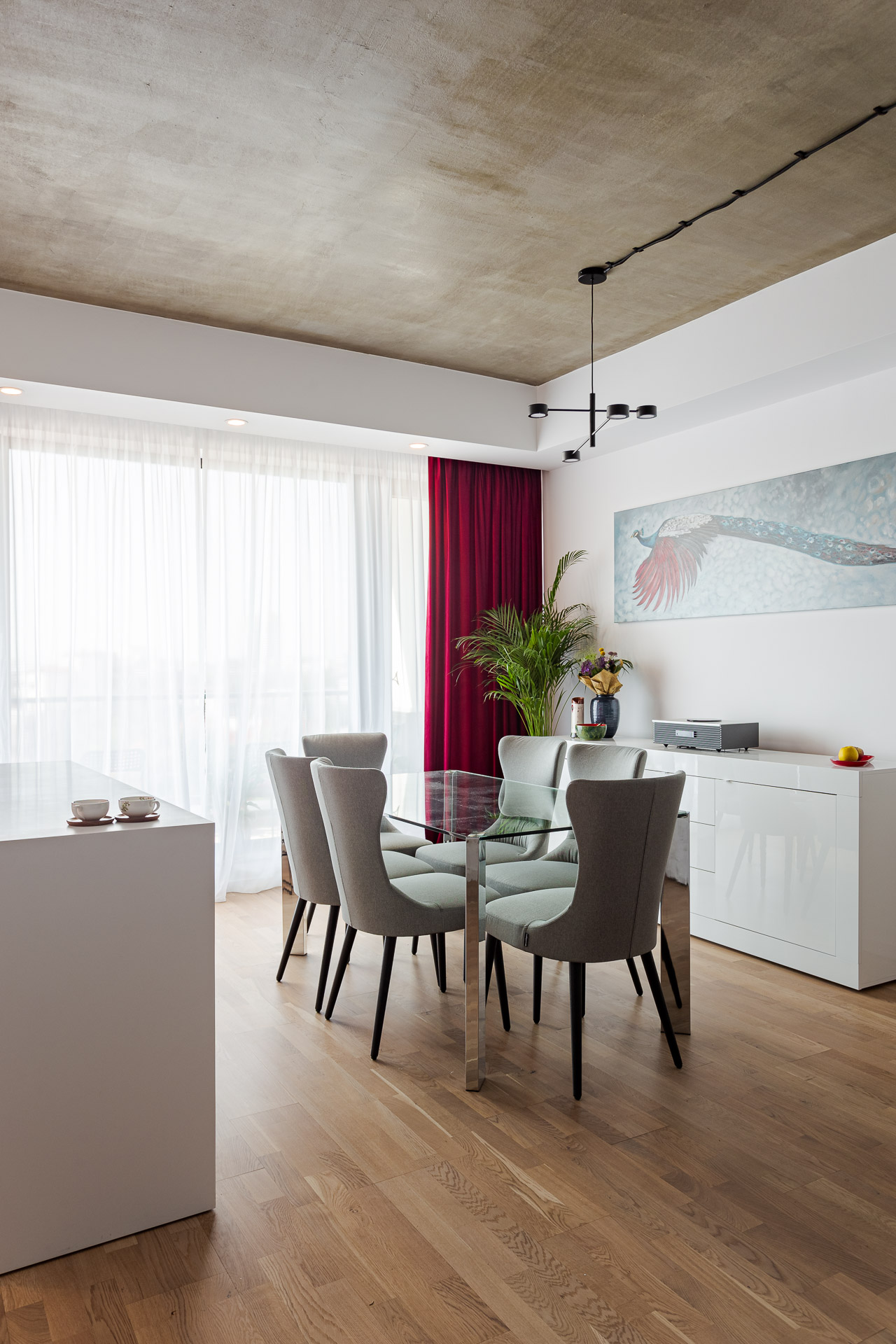 Zona de dining a fost gândită în ton cu restul amenajării. Griul scaunelor este similar griului ales pentru canapea. Tavanul zonei de dining constituie un element de interes – am ales să îl finisăm cu o vopsea ce imită betonul, pentru a da o notă specială amenajării. Am ales o masă din sticlă pentru a lăsa impresia de spațiu prin transparența blatului. Ca accente generale, pe lângă roșu am ales și metalul negru. Acesta este prezent în picioarele scaunelor de bar, corpuri de iluminat, dar și măsuțe de cafea. Am ales să nu colorăm pereții, pentru a servi ca suport tablourilor pe care beneficiarii noștri le colecționează de câte ori merg în vacanțe. Acestea aduc o notă de dinamism amenajării și completează perfect amenajarea noastră.