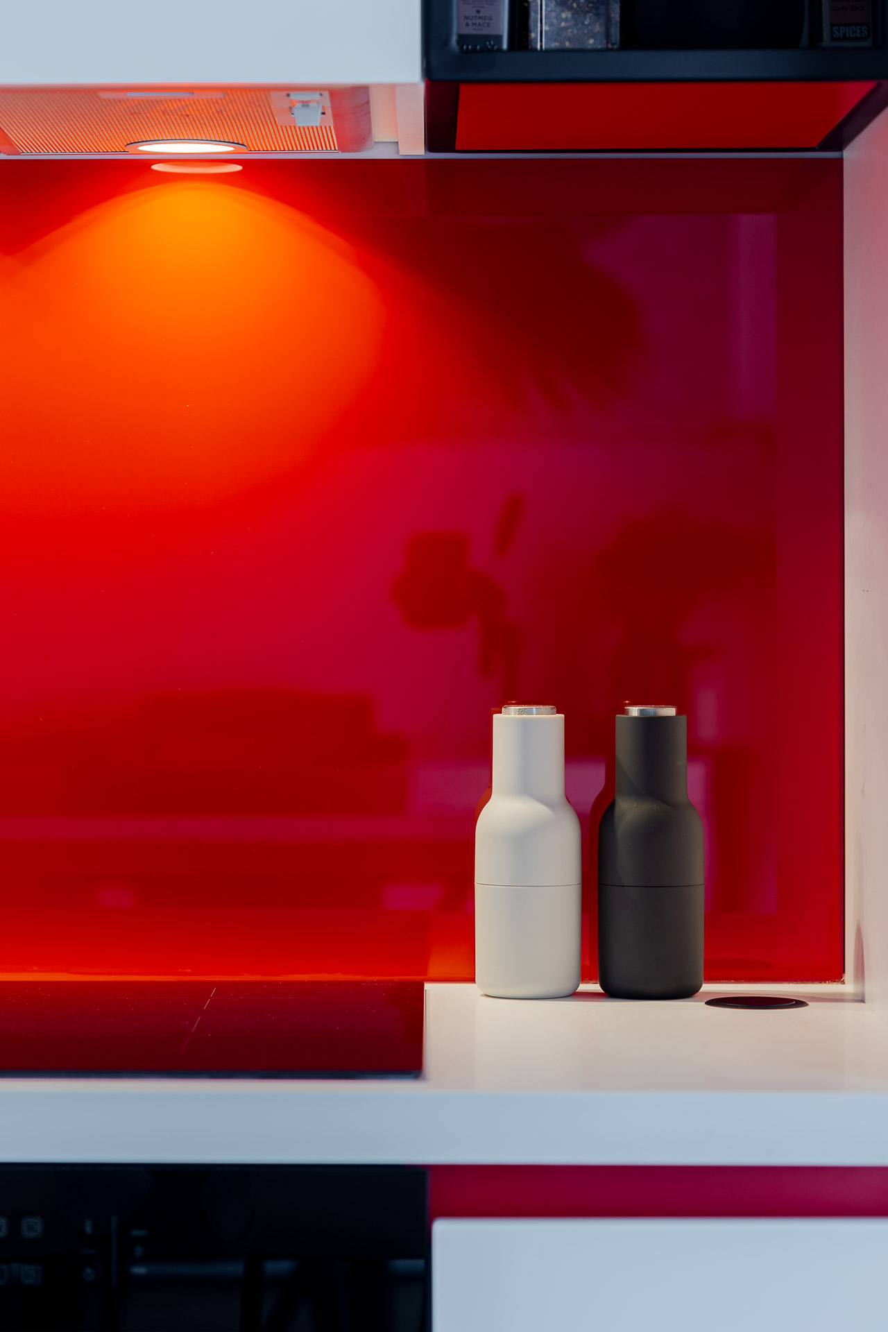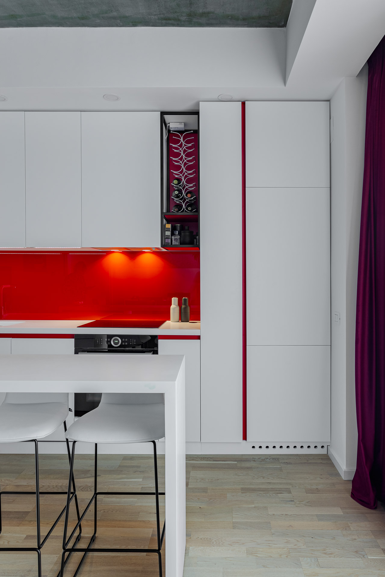 Bucătăria nu este mare ca dimensiune, astfel că a trebuit gândită milimetric pentru a acomoda toate funcțiunile necesare. Am ales electrocasnice incorporabile, pentru a putea include tot ce aveam nevoie. Insula ce deserveste bucătăria are dublu rol – de a delimita spațiul bucătărie/dining și de a mări spațiul de depozitare. În bucătărie am ales să mergem pe mobilier alb lucios, pentru a nu aglomera vizual. Și aici, am simțit nevoia de accente de culoare, și am ales tot roșul pe care l-am folosit și în zona de relaxare.